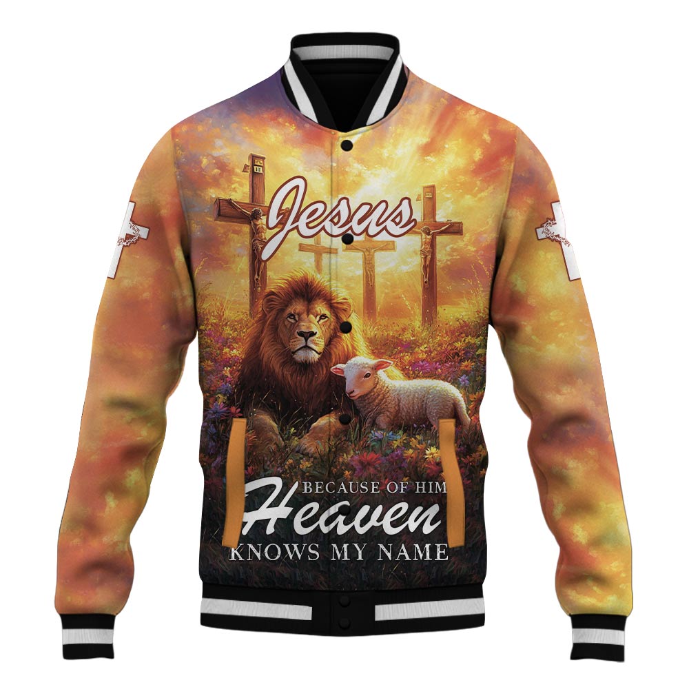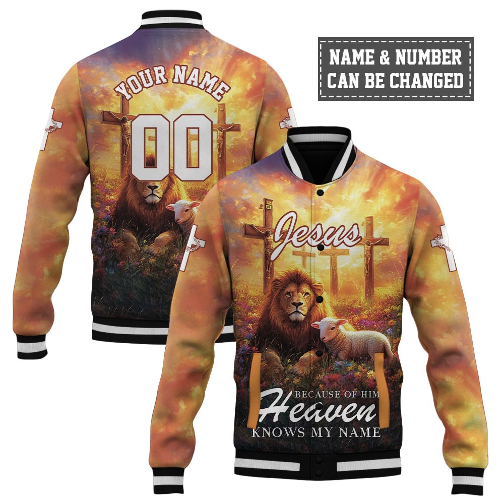 Jesus Because of Him Heaven Know my Name Baseball Jacket - Custom Name & Number