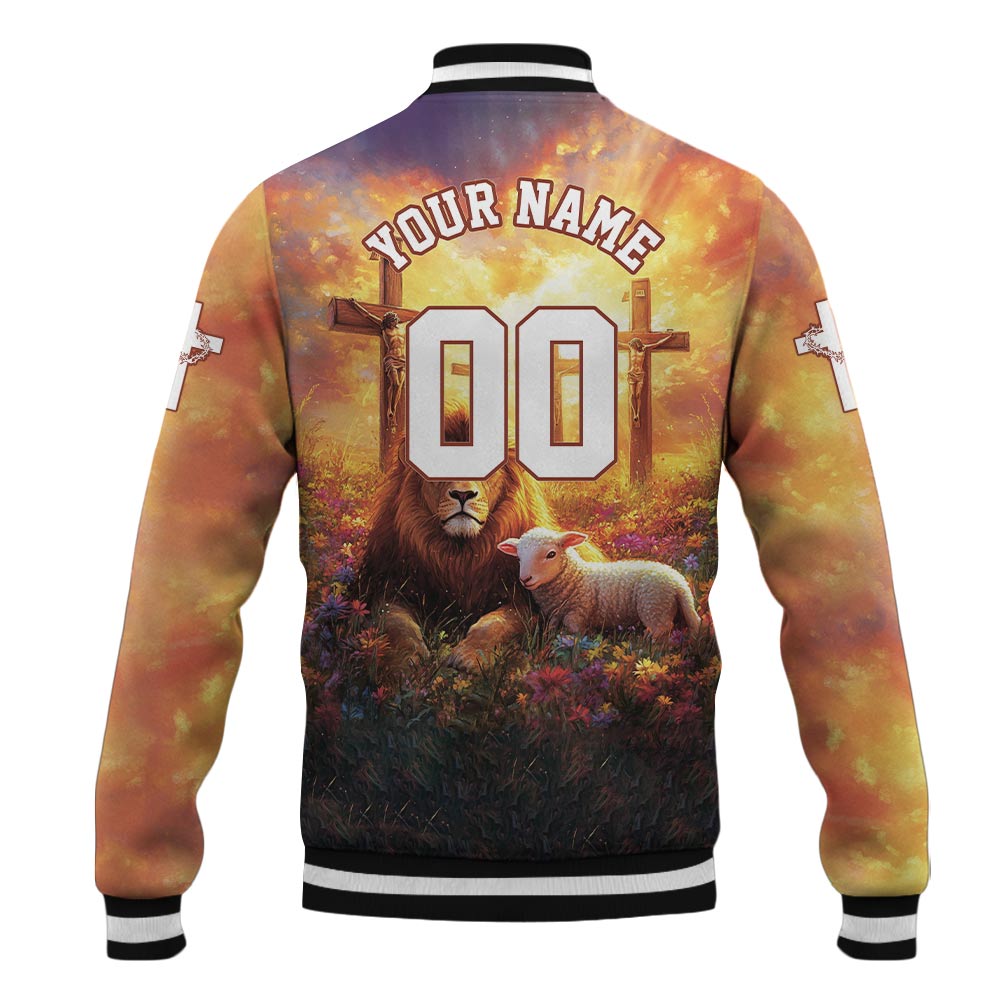 Celebrate your faith with the Jesus Because of Him Heaven Know my Name Baseball Jacket, a stunning testament to salvation and divine grace. Featuring a beautiful design of a lion and a lamb standing before the three crosses at sunrise, this jacket symbolizes strength, peace, and redemption. The "Because of Him, Heaven Knows My Name" message reminds us of the eternal promise through Jesus Christ.