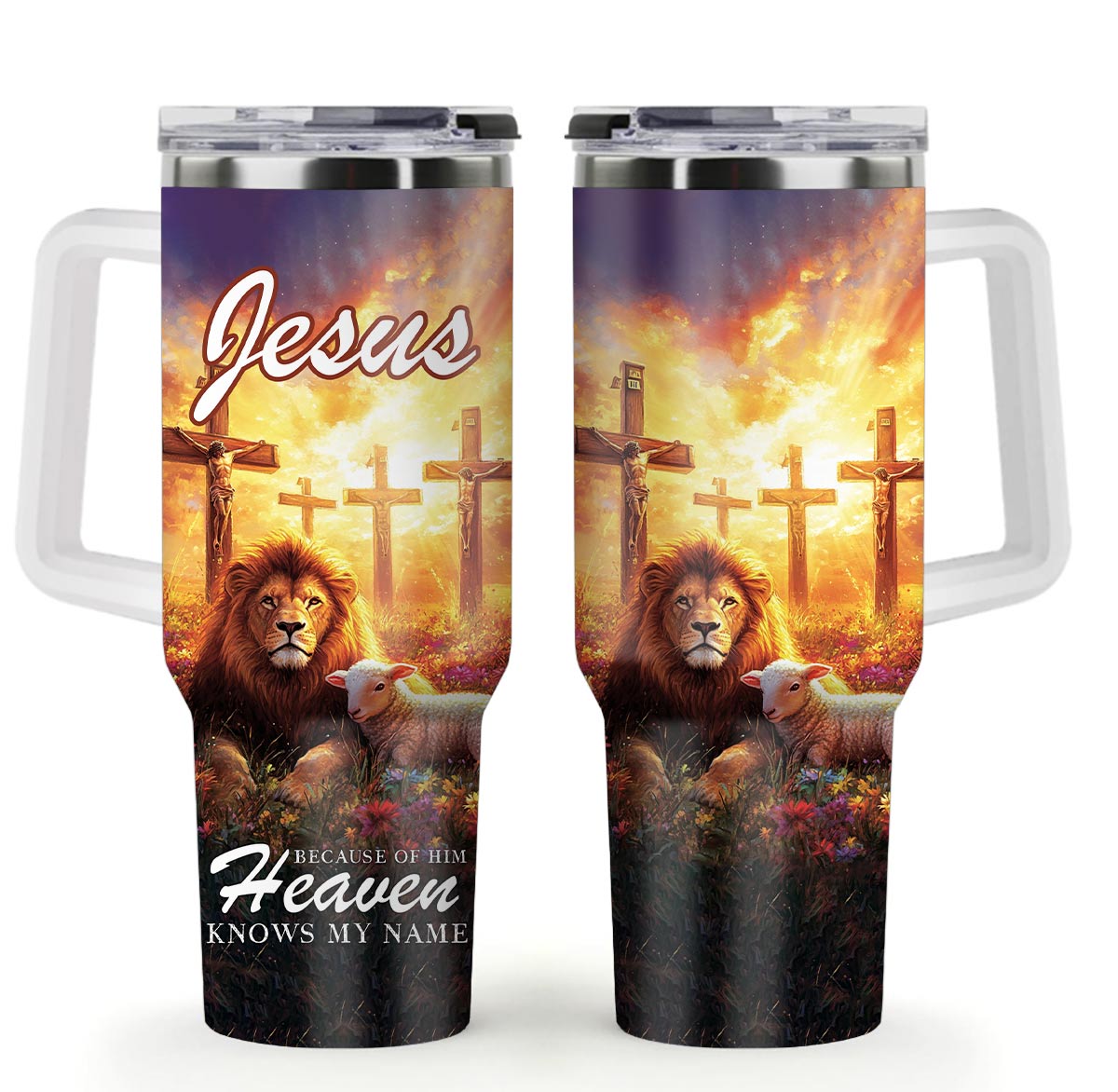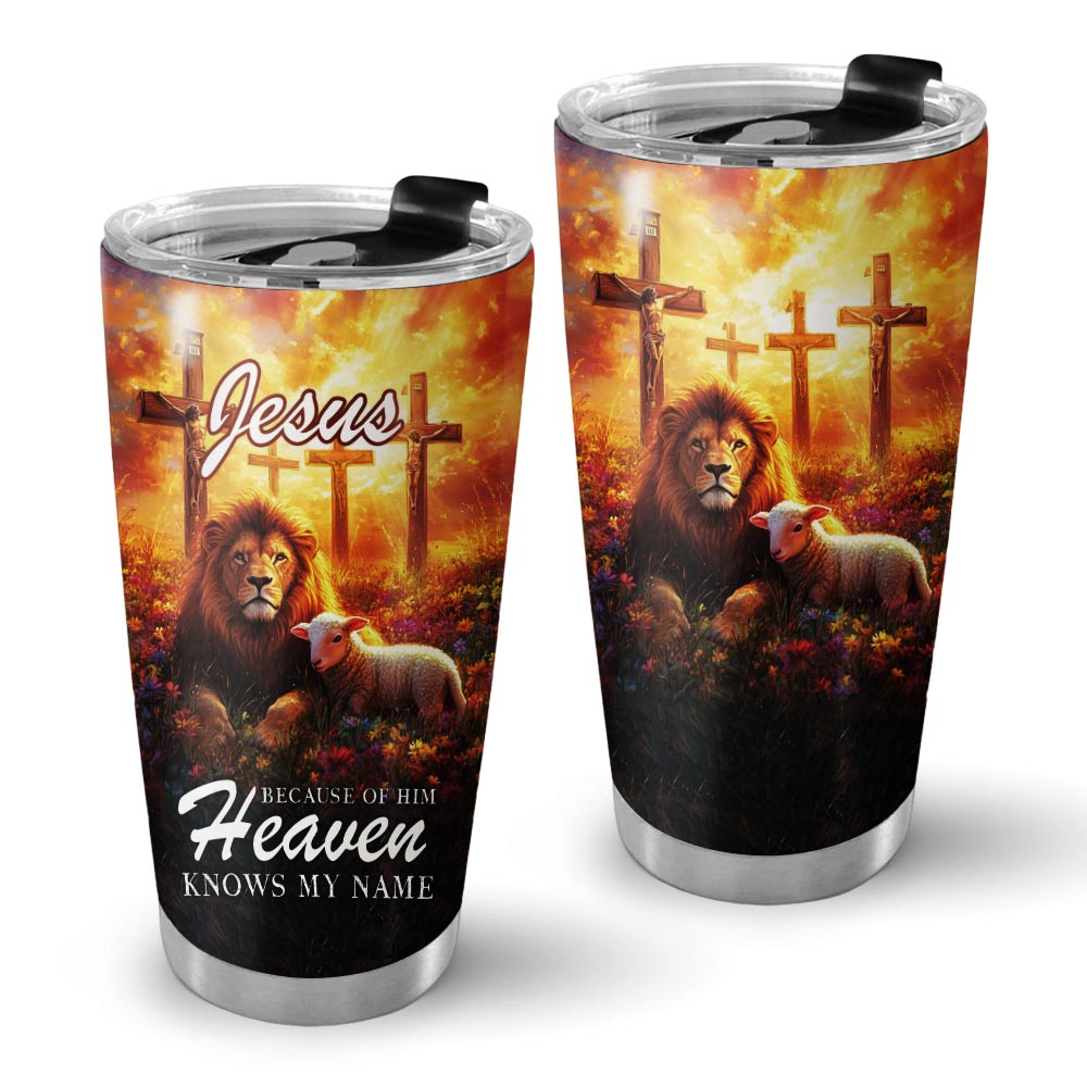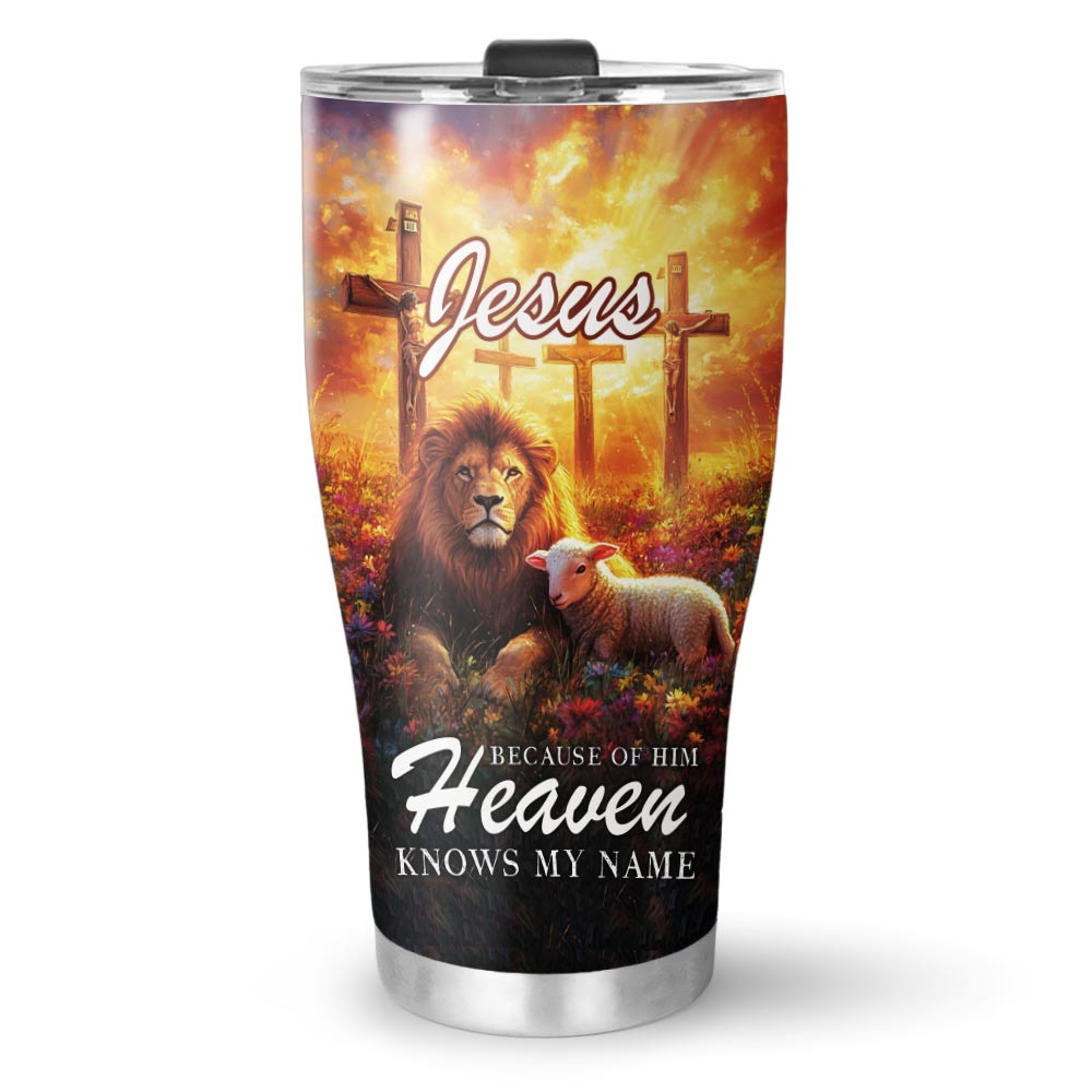 Carry a divine reminder with the Jesus Because of Him Heaven Know my Name Stainless Steel Tumbler. This stunning tumbler showcases a majestic lion, a gentle lamb, and the three crosses, symbolizing strength, sacrifice, and redemption. It’s a daily testament to God’s eternal love and a powerful reminder that through Jesus, heaven knows your name.