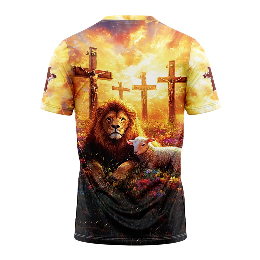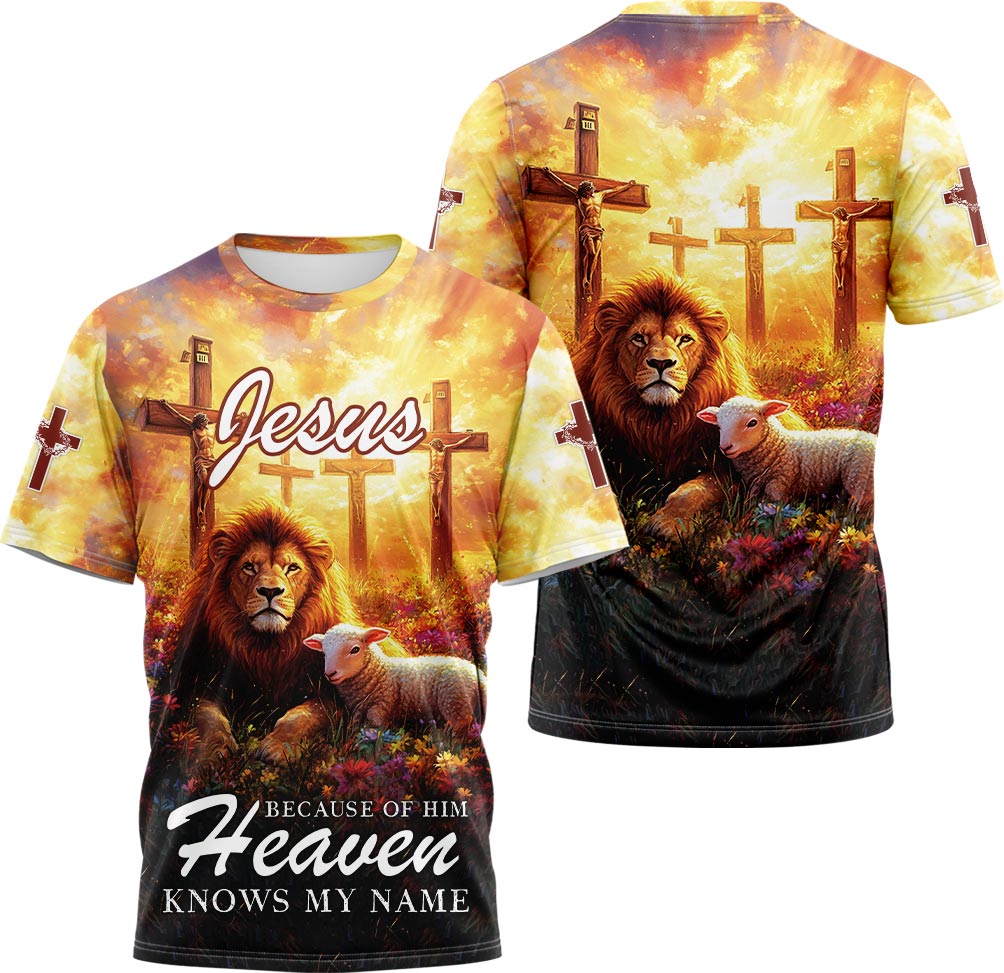 Celebrate your faith with the Jesus – Because of Him, Heaven Knows My Name T-shirt! This breathtaking design features a radiant sunset, three crosses, a mighty lion, and a gentle lamb—symbolizing Jesus’ sacrifice and divine protection. With its powerful message, this shirt is a perfect way to express your love for Christ.