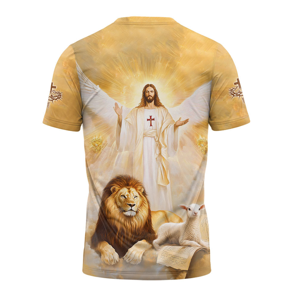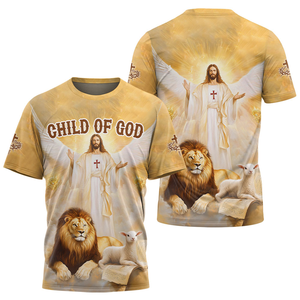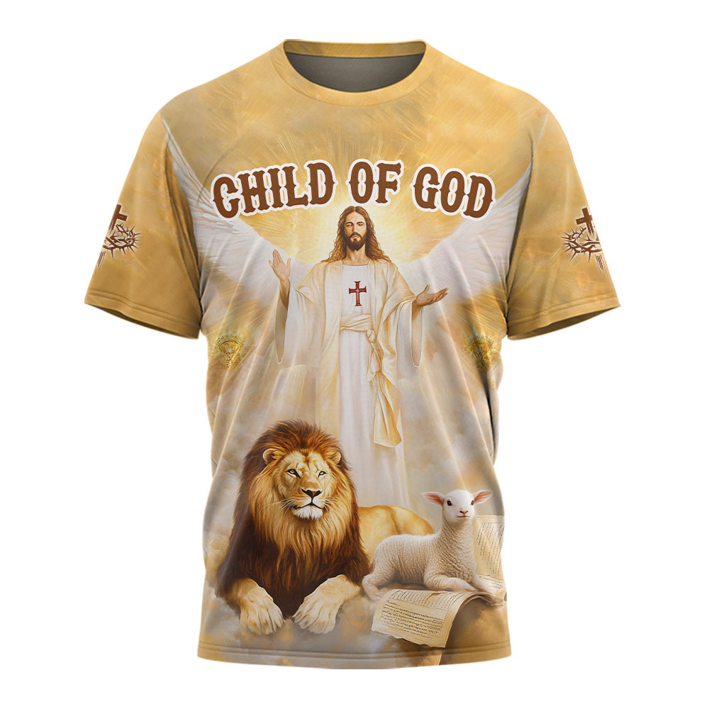 Walk in faith and wear your identity with pride in the Jesus Child Of God T-shirt. Featuring a beautiful and uplifting design of Jesus Christ, accompanied by a powerful lion and a gentle lamb resting on the Holy Bible — this shirt is a symbol of strength, peace, and divine love.