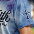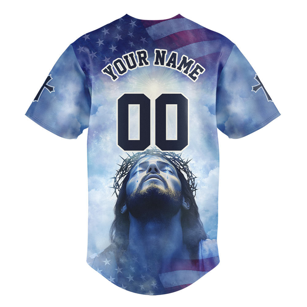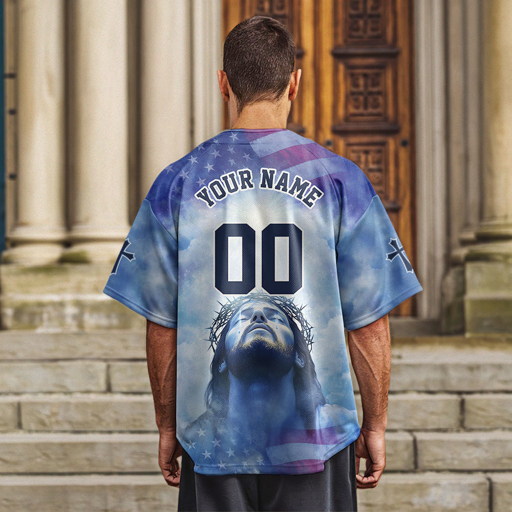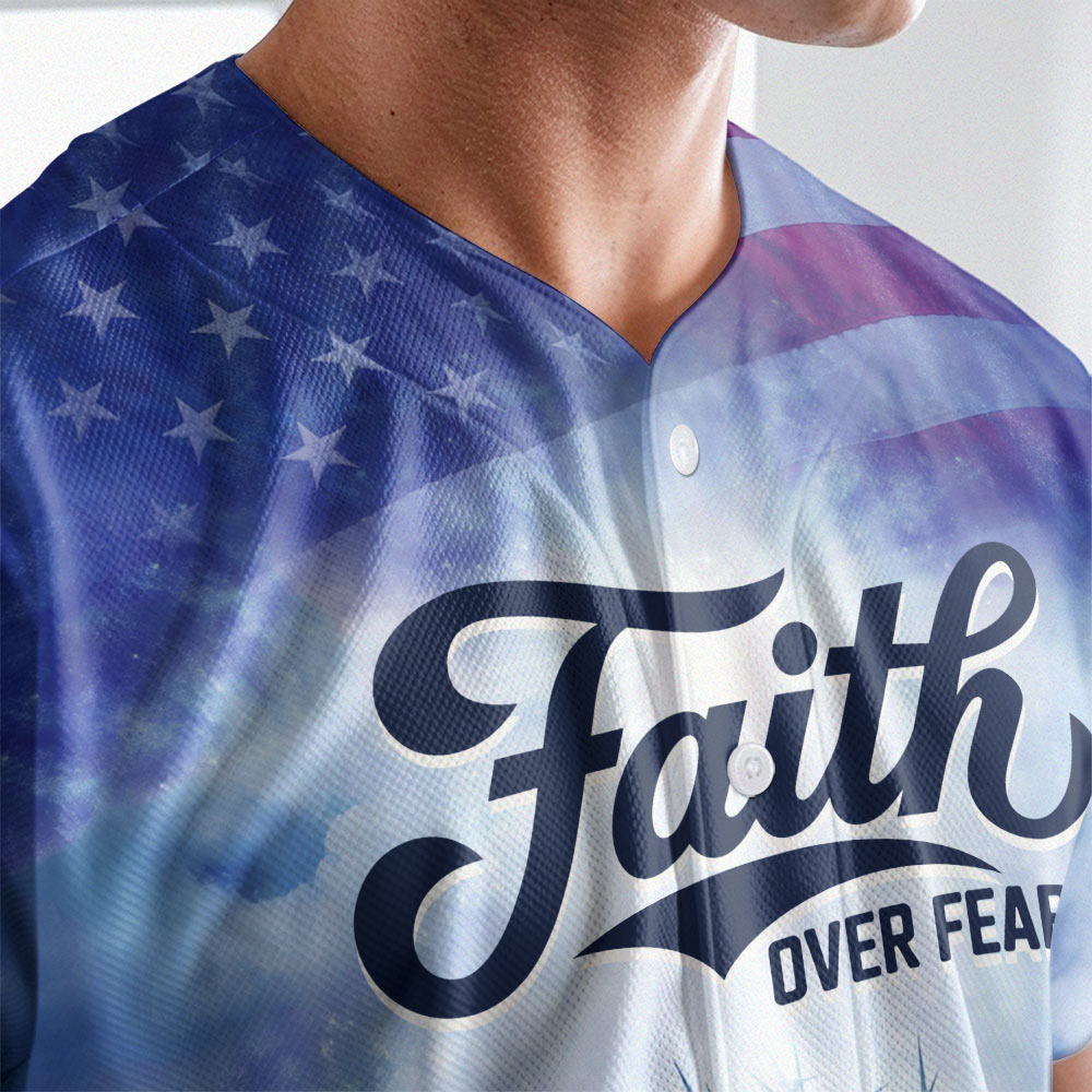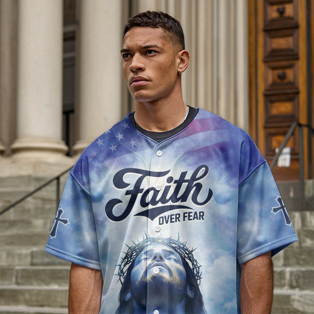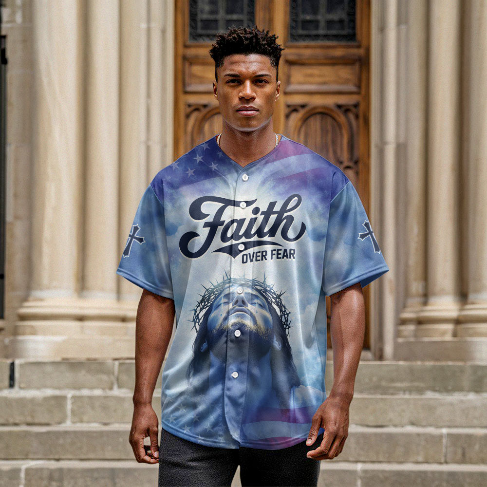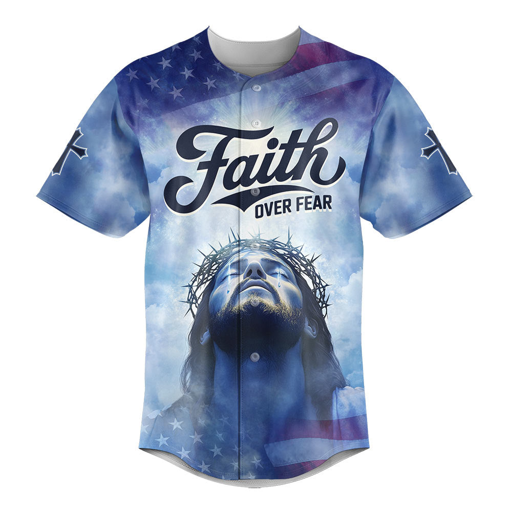 Declare your unwavering belief with the Jesus Faith Over Fear Baseball Jersey. This striking design features a powerful image of Jesus wearing the crown of thorns, looking toward Heaven — a symbol of strength, sacrifice, and unshakable faith.