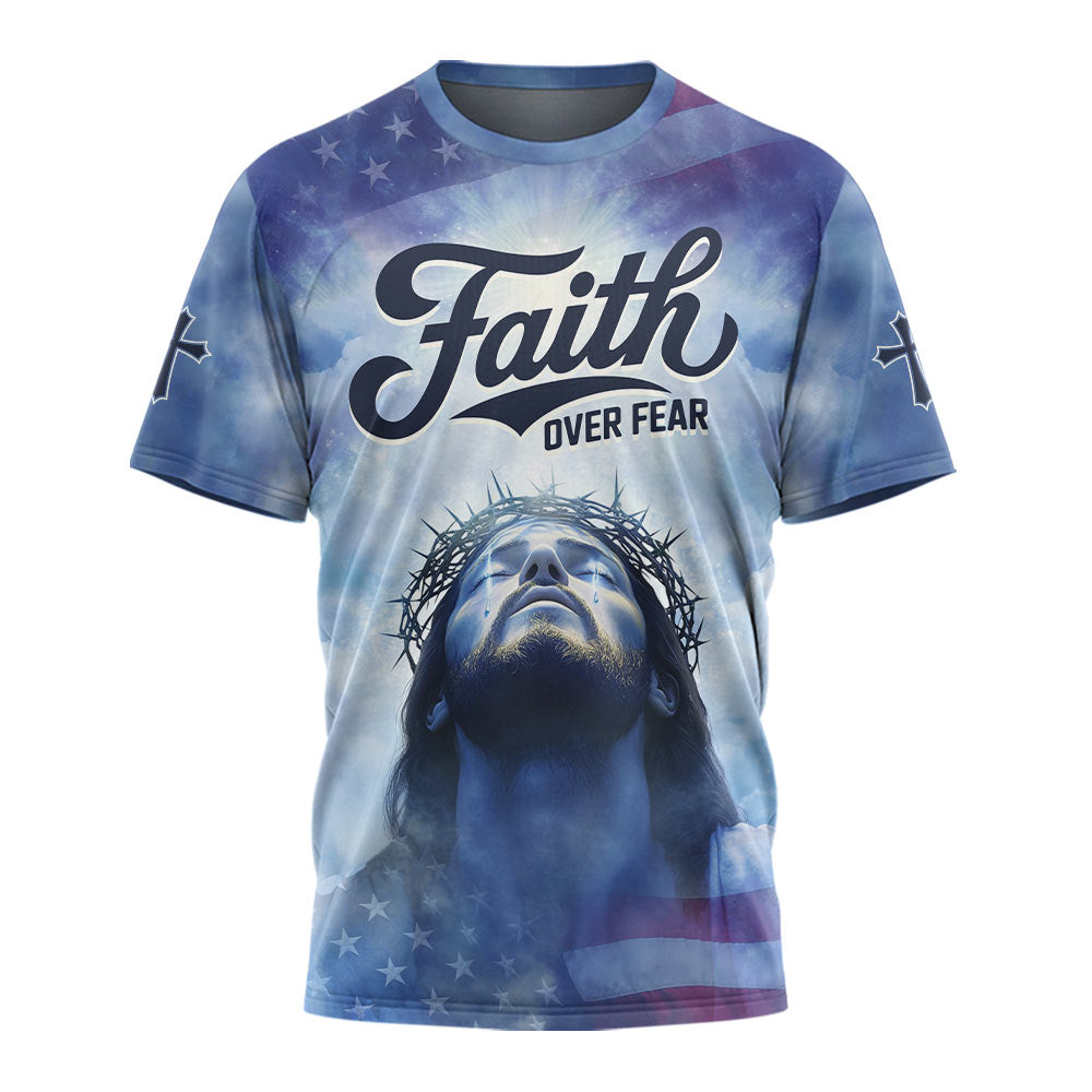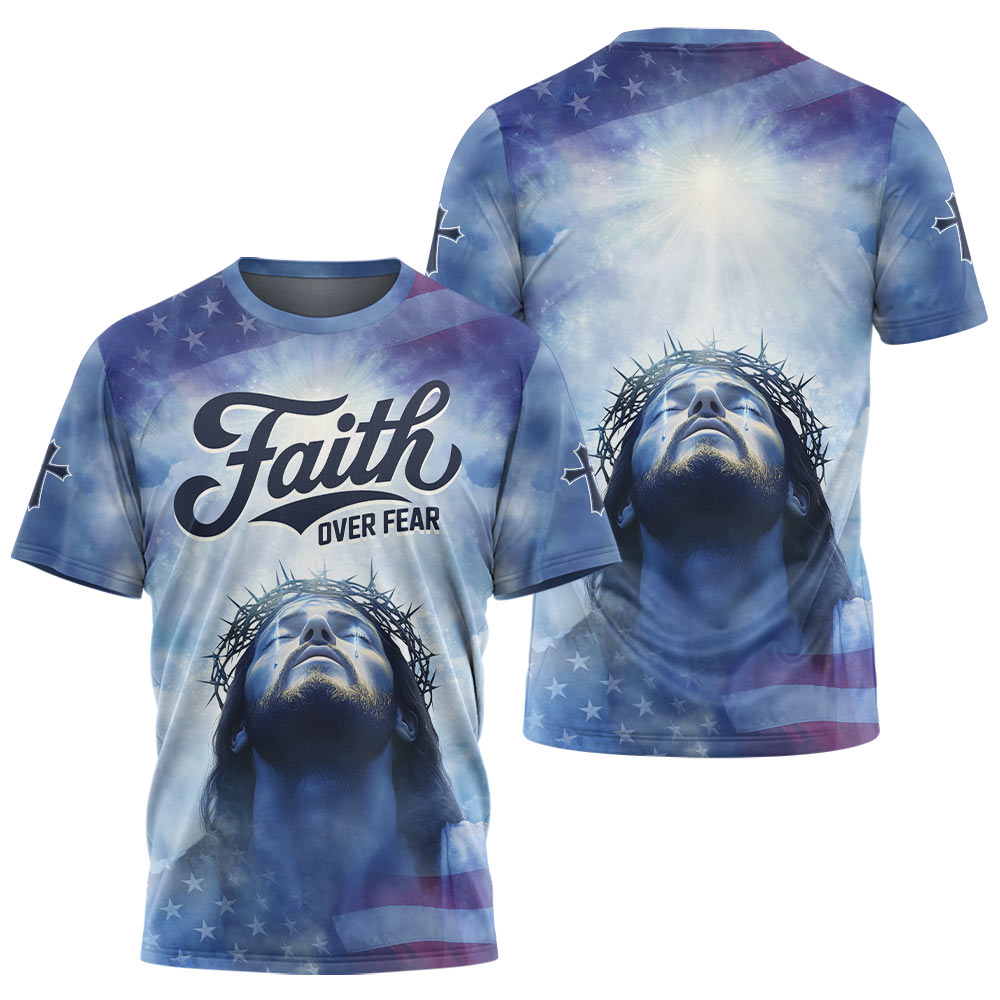 Choose courage over worry with the Jesus Faith Over Fear T-shirt. Featuring a powerful image of Jesus wearing the crown of thorns and gazing upward in strength and surrender, this design boldly reminds us to put faith over fear in every situation.