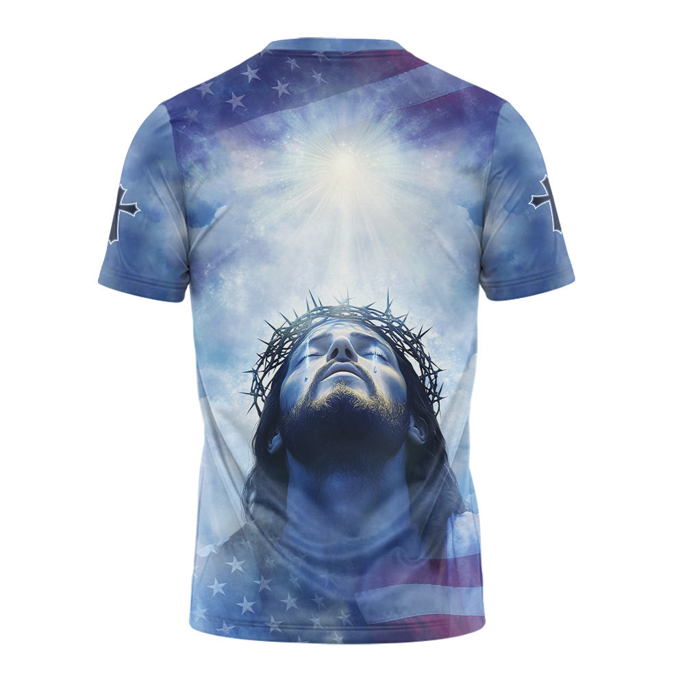 Set against a dramatic, heavenly background with subtle stars and the American flag, this t-shirt is perfect for those who walk by faith and stand firm in God’s promises.