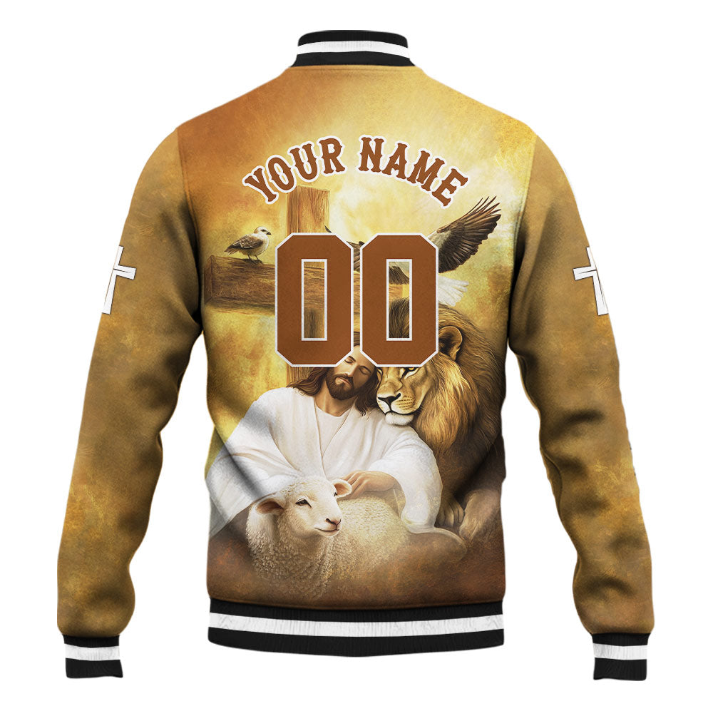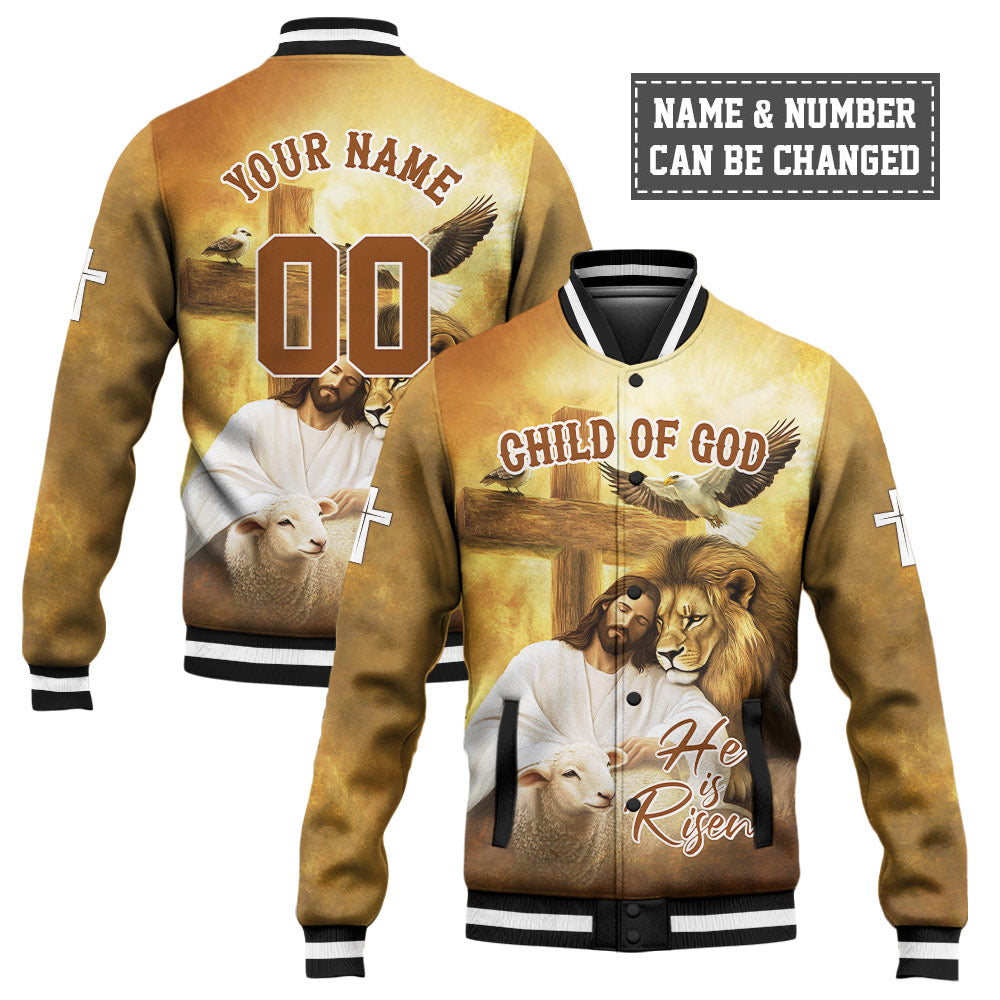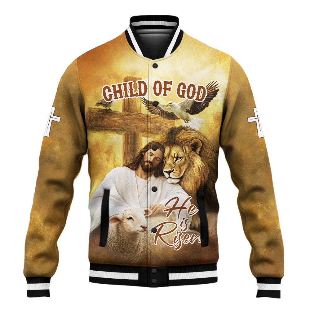 Step into the light of resurrection with the Jesus He Is Risen Baseball Jacket — a beautiful blend of strength, peace, and divine identity. This heart-touching design features Jesus resting beside a lion and a lamb under the wooden cross, while doves soar overhead. With warm golden tones and the inspiring message “Child of God – He is Risen,” this jacket is a powerful testimony of hope, salvation, and victory in Christ.