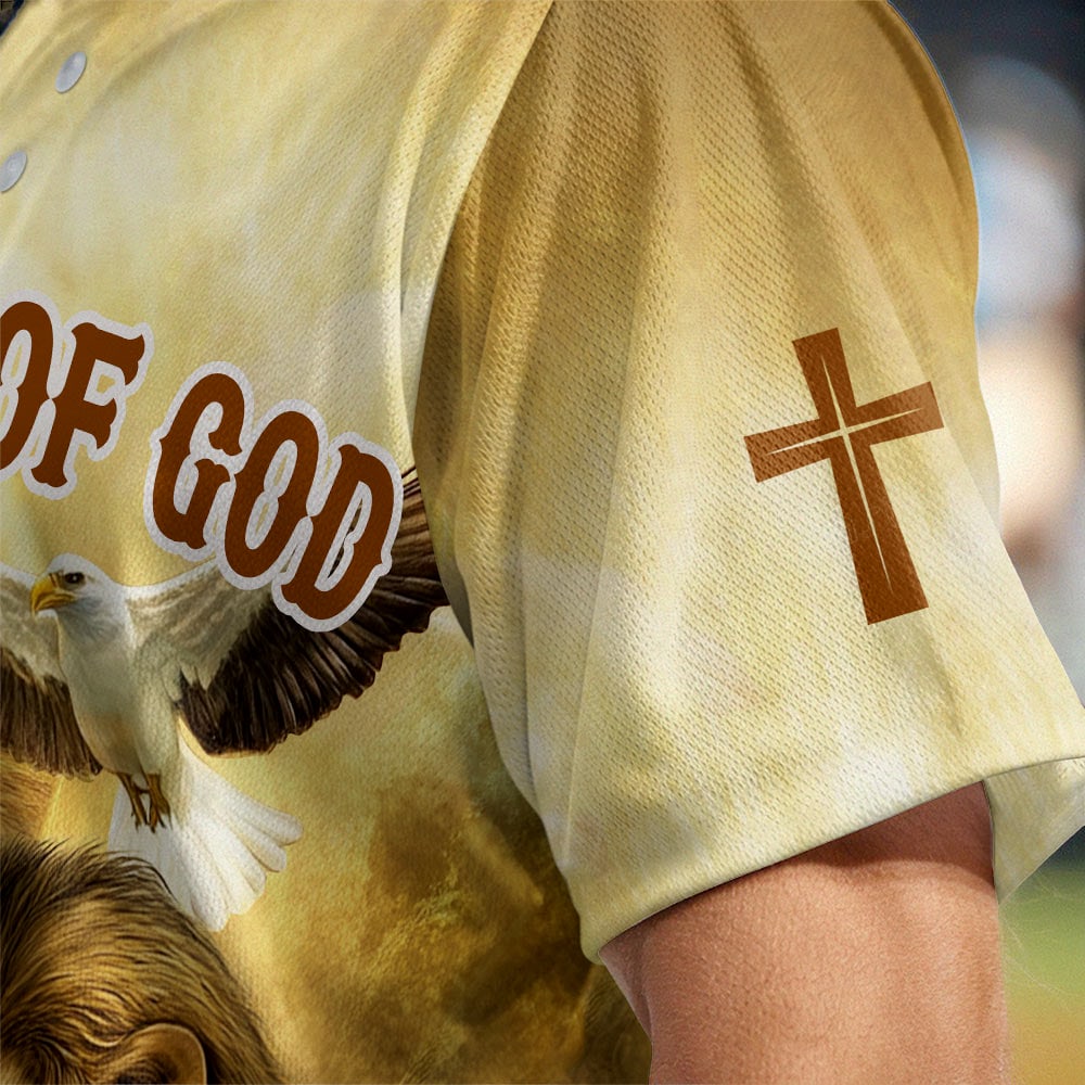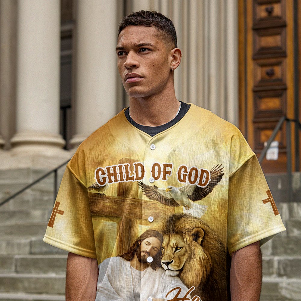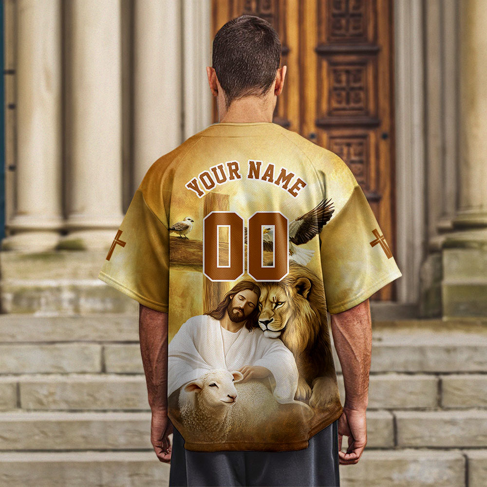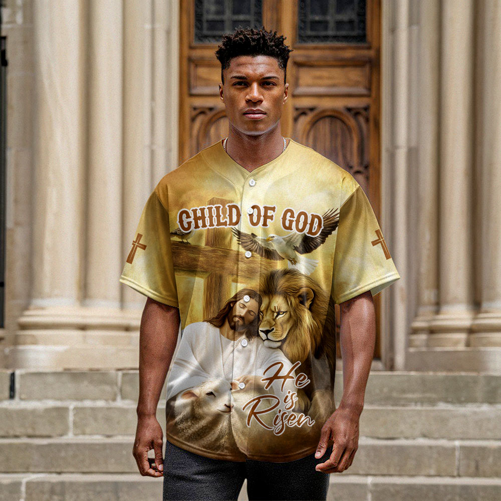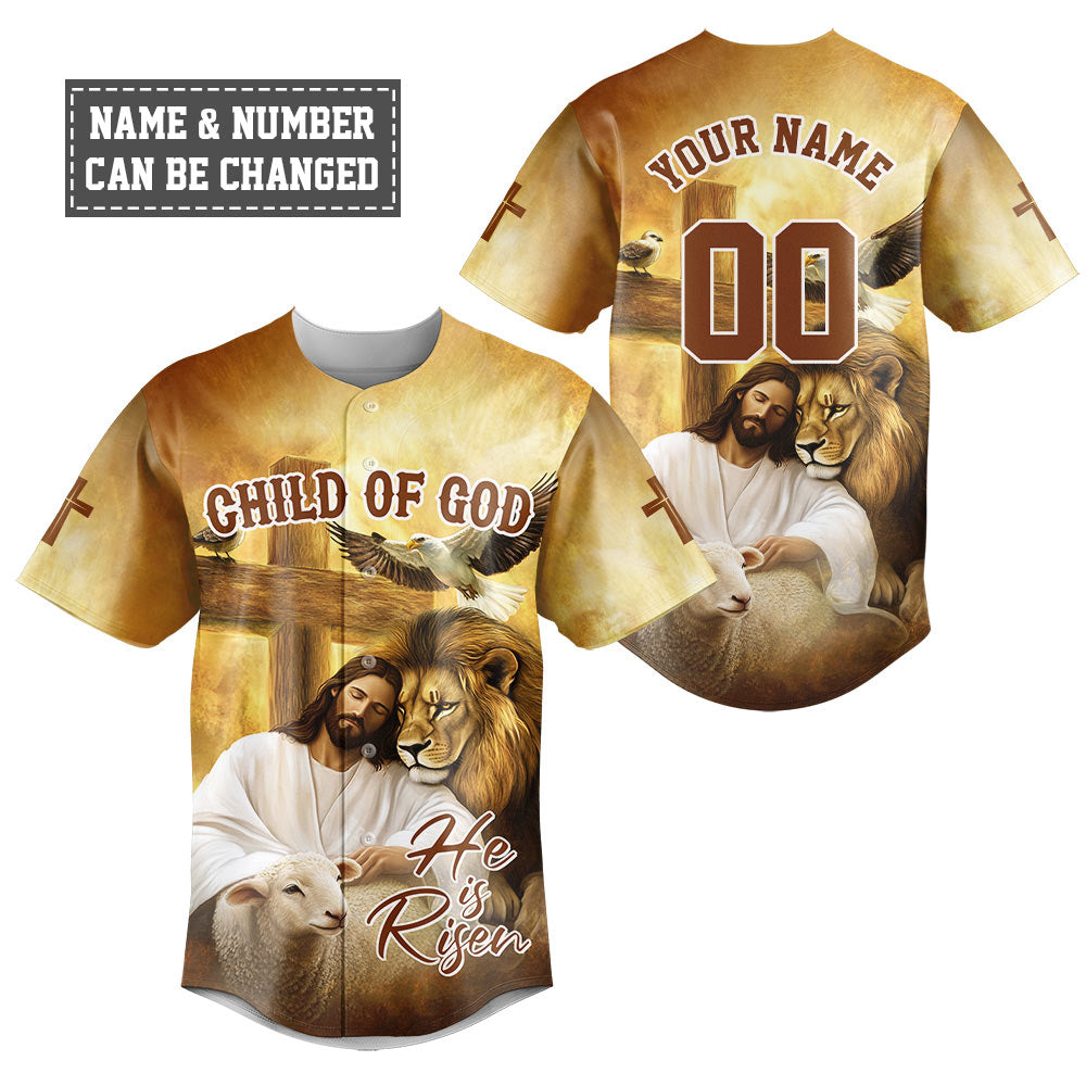 Celebrate the resurrection and the unwavering love of Christ with the Jesus He Is Risen Baseball Jersey. This beautifully designed jersey features Jesus resting peacefully alongside a majestic lion and a lamb, symbolizing strength, sacrifice, and divine protection. The glowing cross, soaring dove, and golden hues reflect hope, faith, and the promise of eternal life.