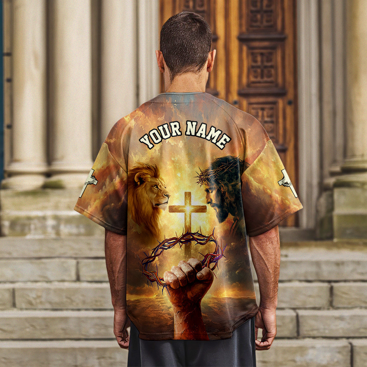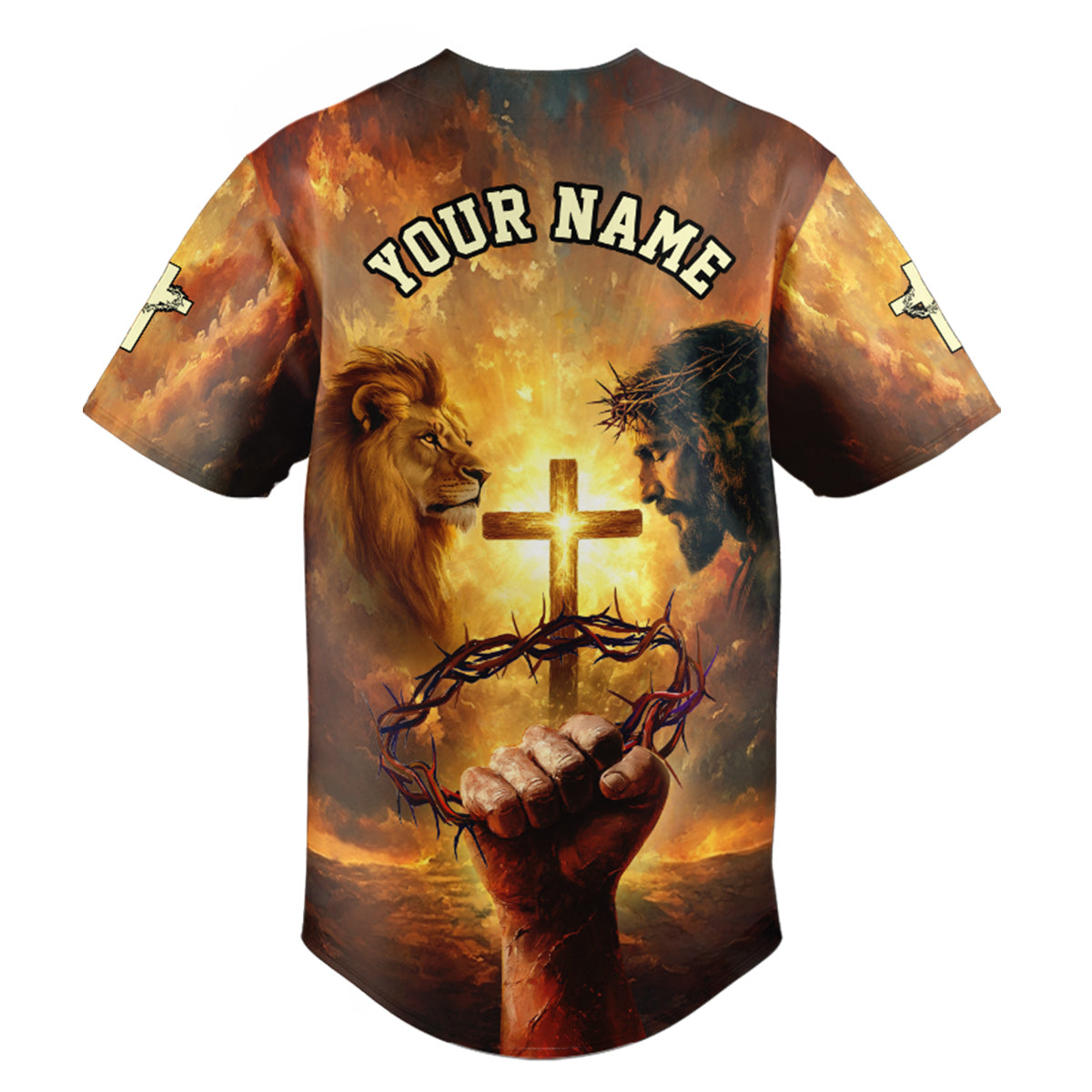 Declare your unwavering faith with this Jesus Is King Baseball Jersey, a powerful representation of sacrifice, victory, and devotion. Featuring a crowned hand gripping the thorns, a lion, and Jesus before the cross, this design symbolizes the strength and glory of Christ.