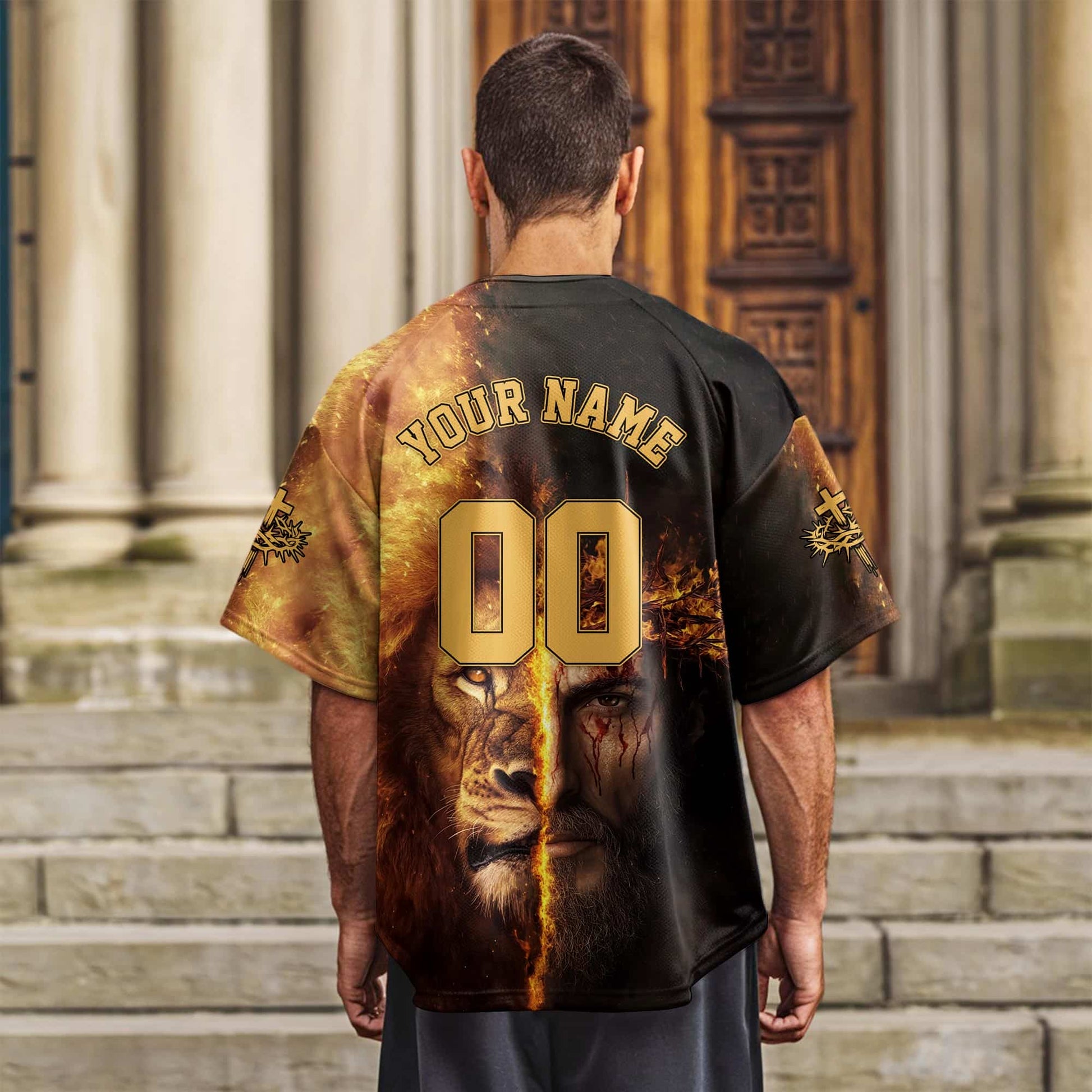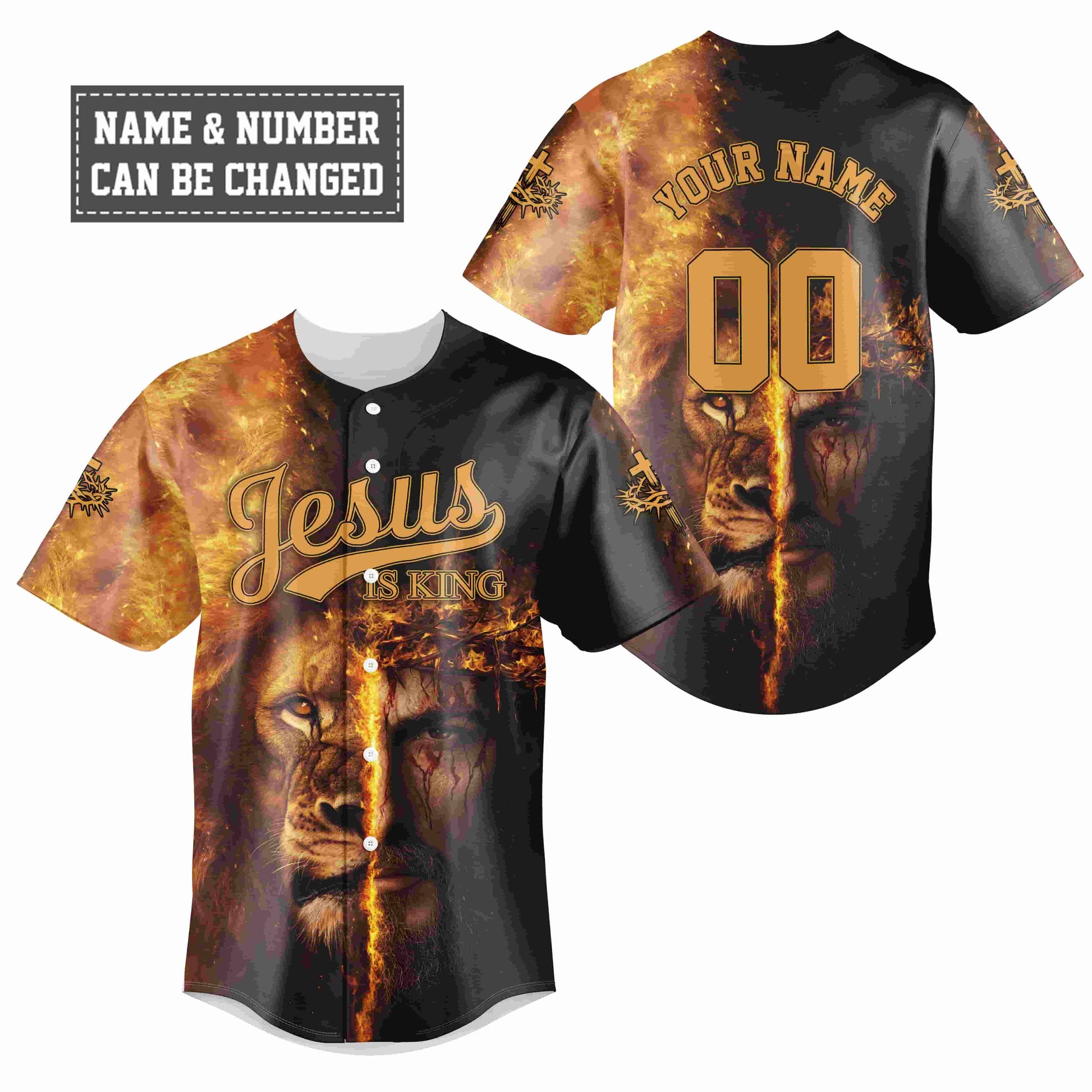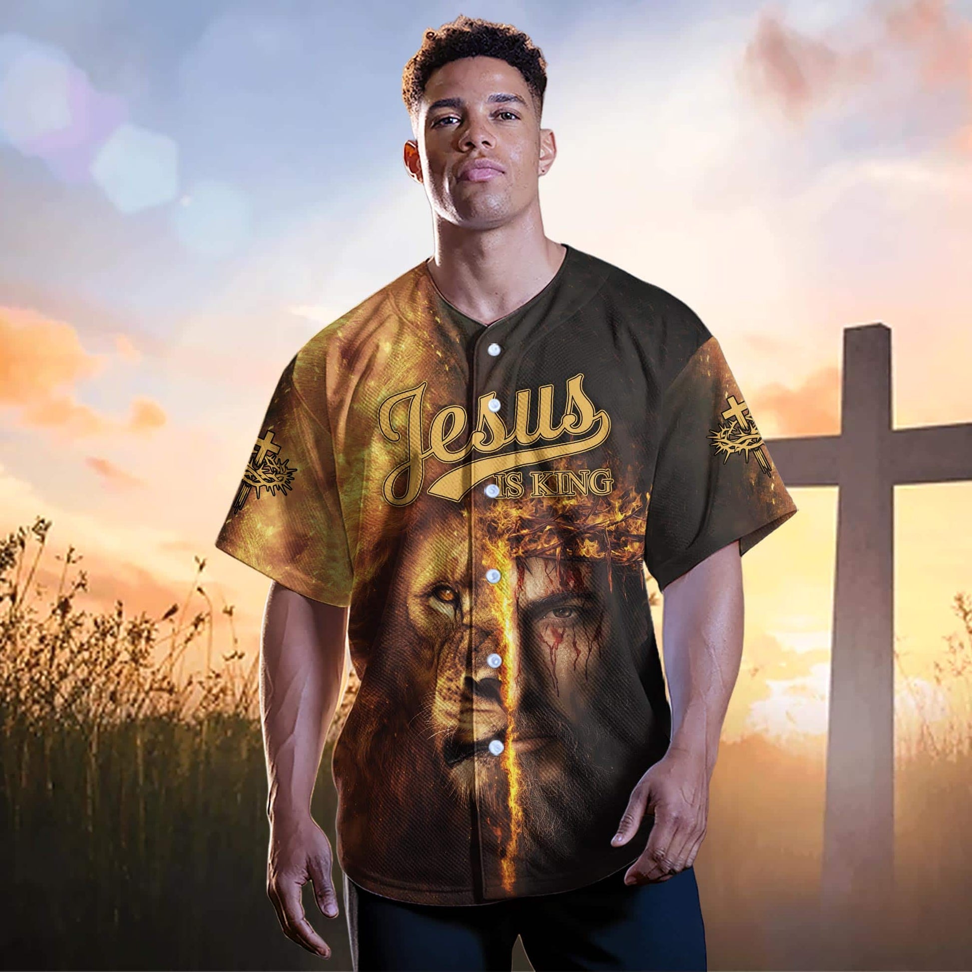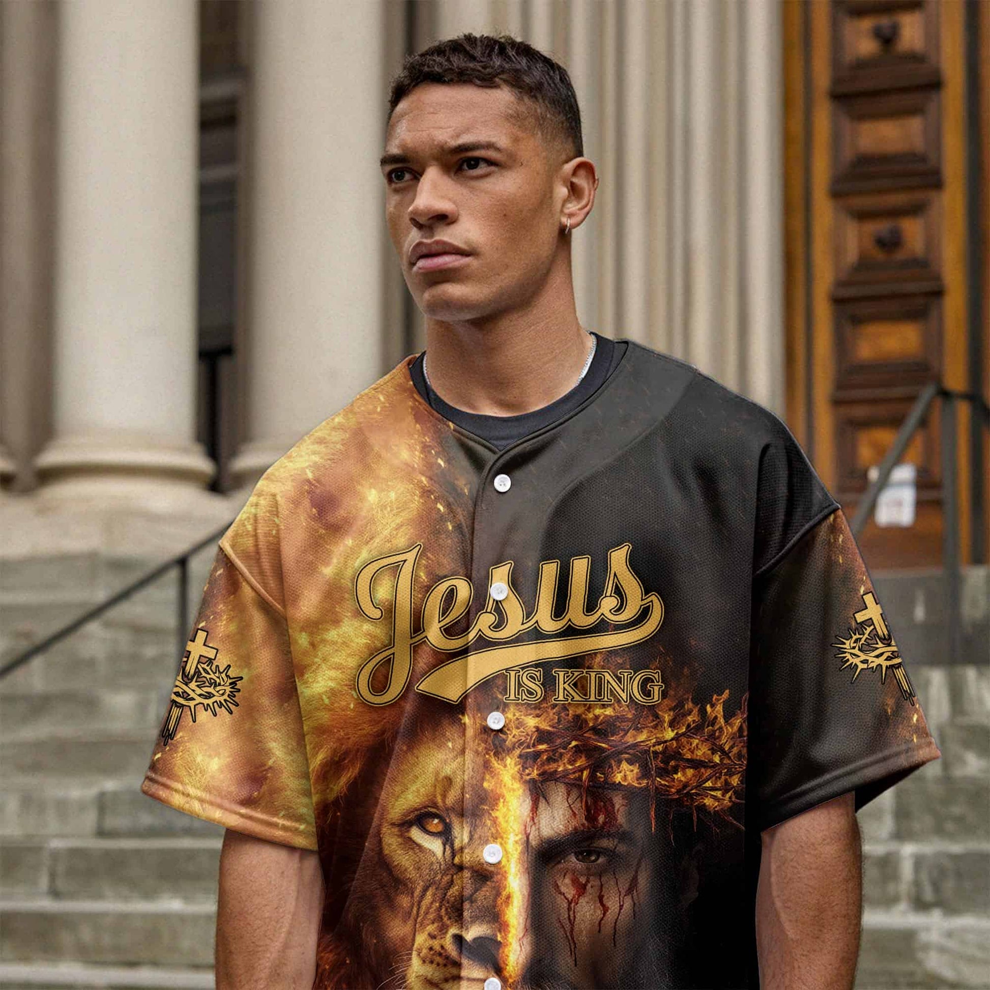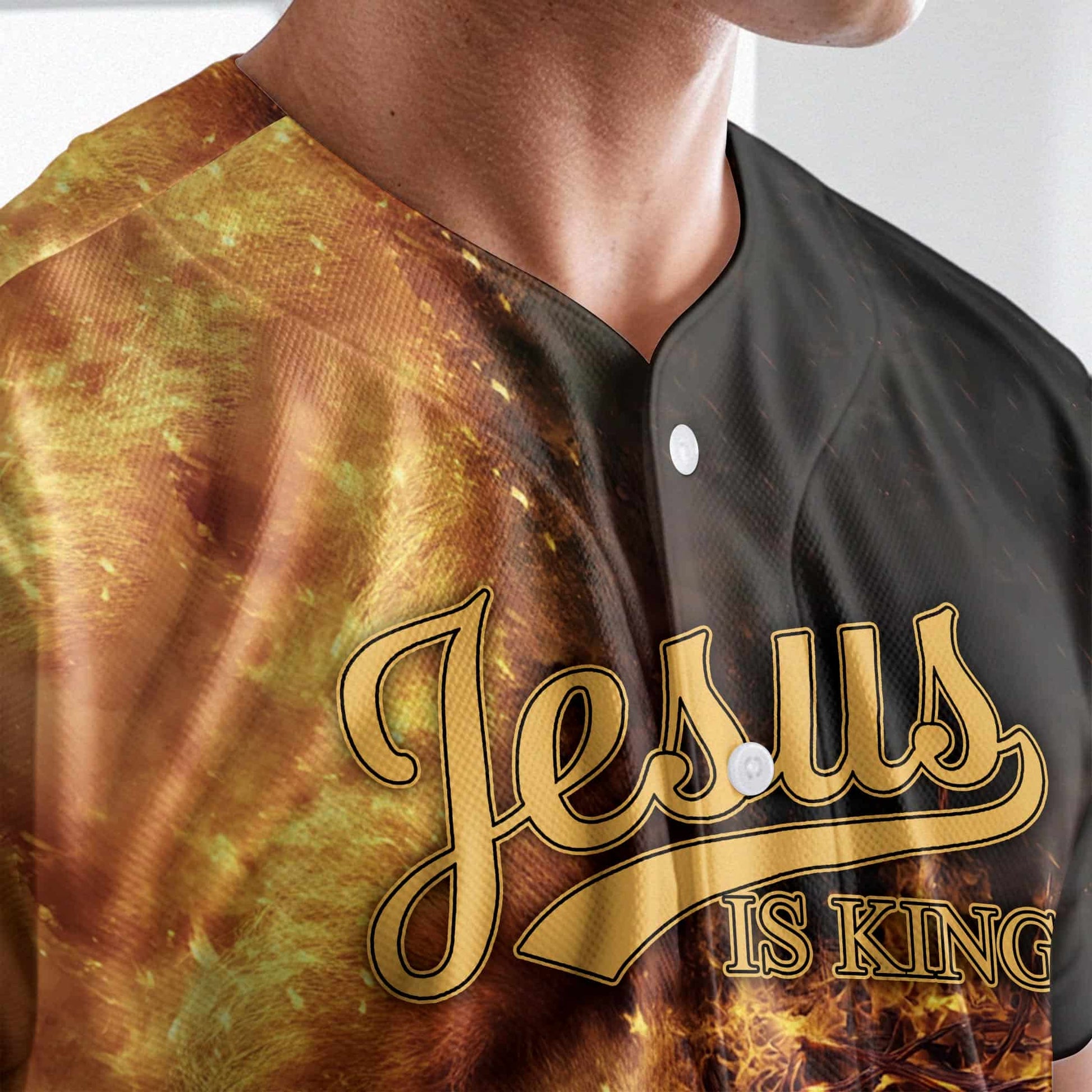 Declare the reign of the King with the "Jesus Is King Lion" baseball jersey. This striking design features a powerful combination of the majestic lion, symbolizing Jesus as the Lion of Judah, and the somber image of Jesus crowned with thorns, representing His ultimate sacrifice. The bold "Jesus Is King" message across the chest emphasizes His divine authority and kingship over all creation.