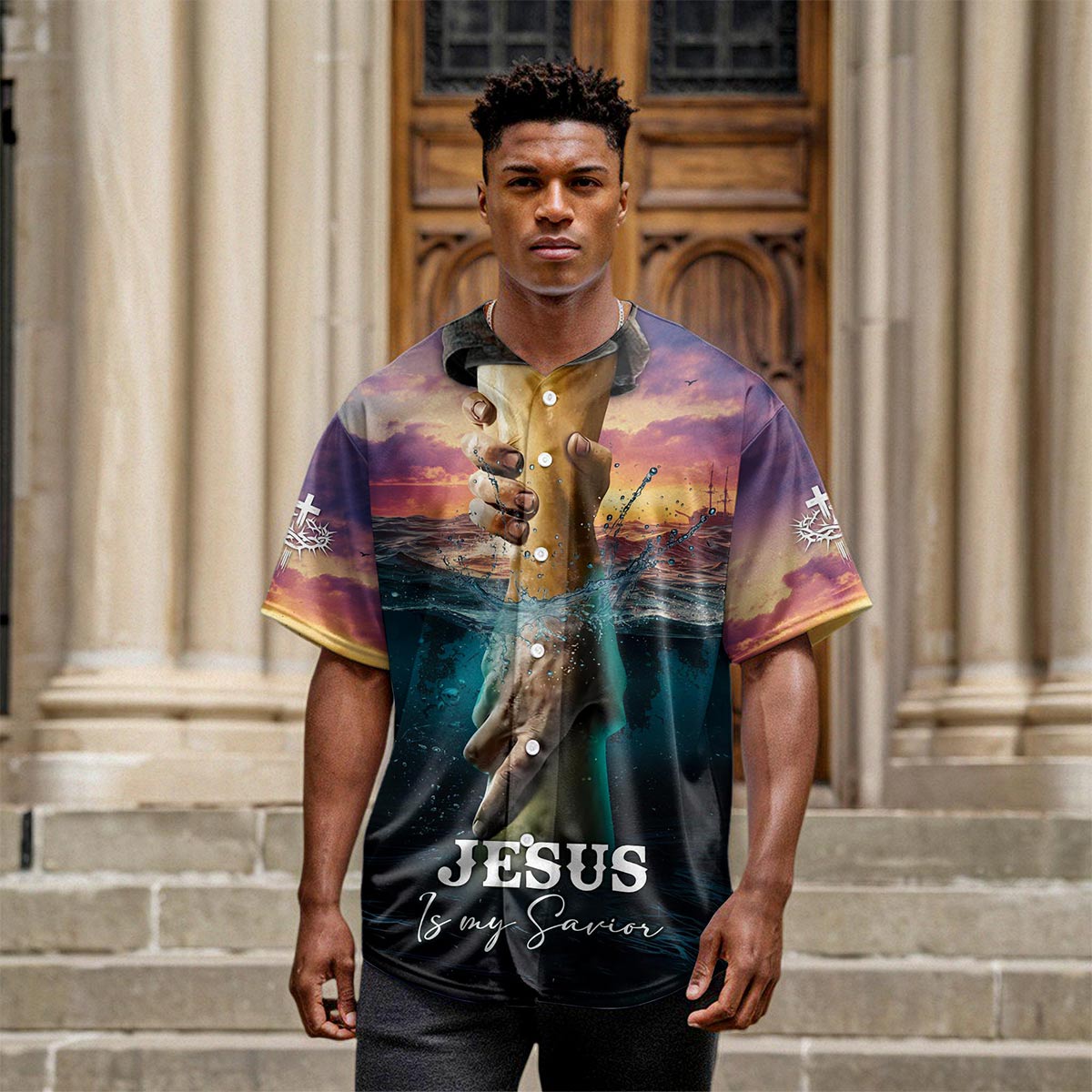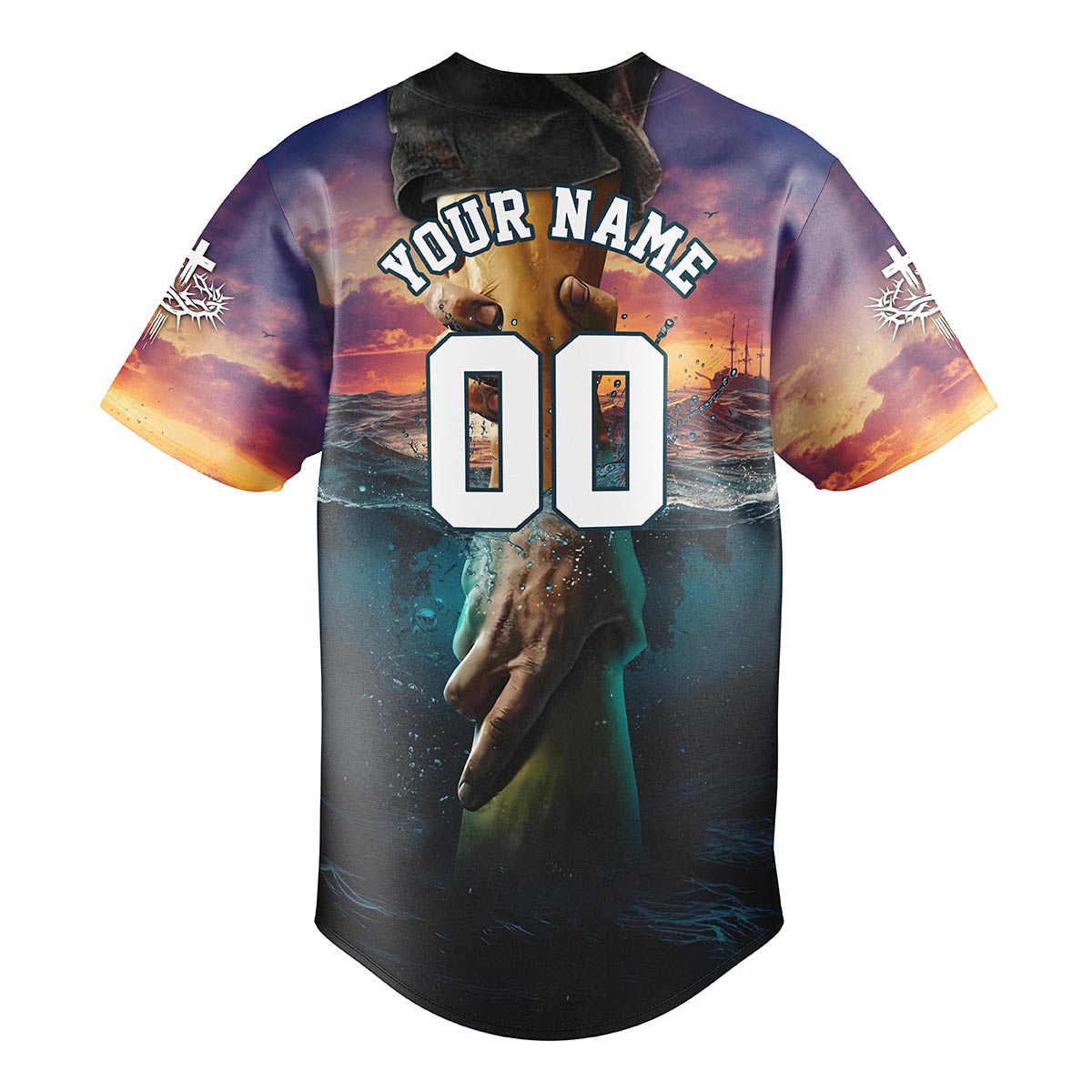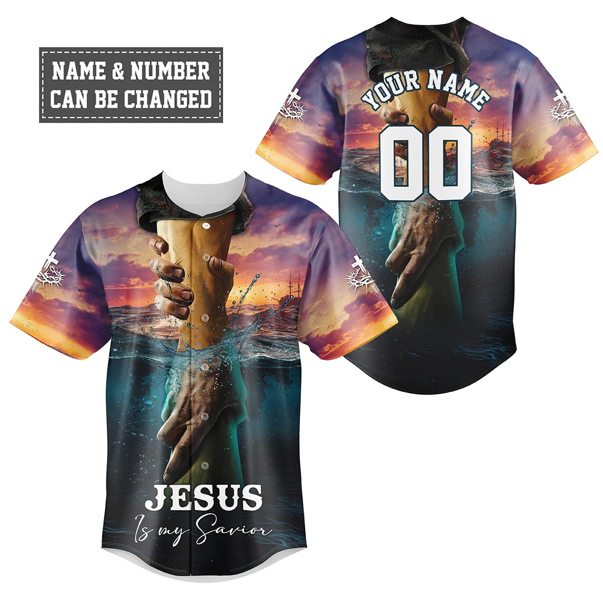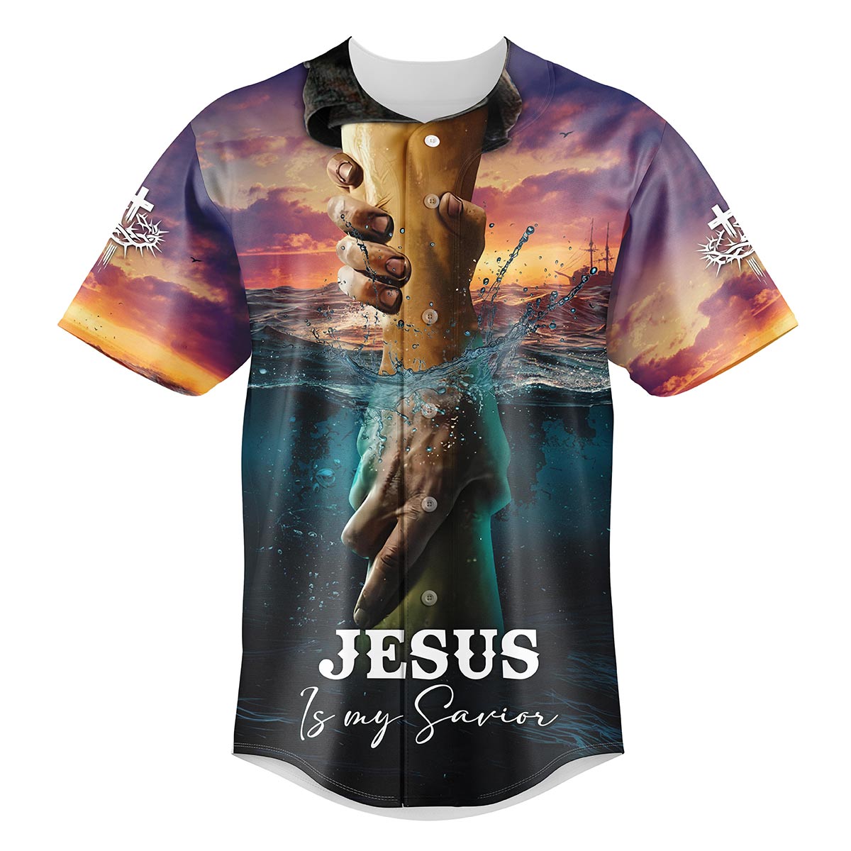 This inspiring baseball jersey features a powerful visual of Jesus reaching out to save, showcasing the unwavering strength of faith and love. The striking imagery of a hand gripping a wooden cross amidst stormy waters is paired with the bold declaration “JESUS is my Savior,” making this piece a statement of both faith and style. The vibrant sunset sky and dramatic ocean scene add depth and emotion, creating a design that speaks to the heart.