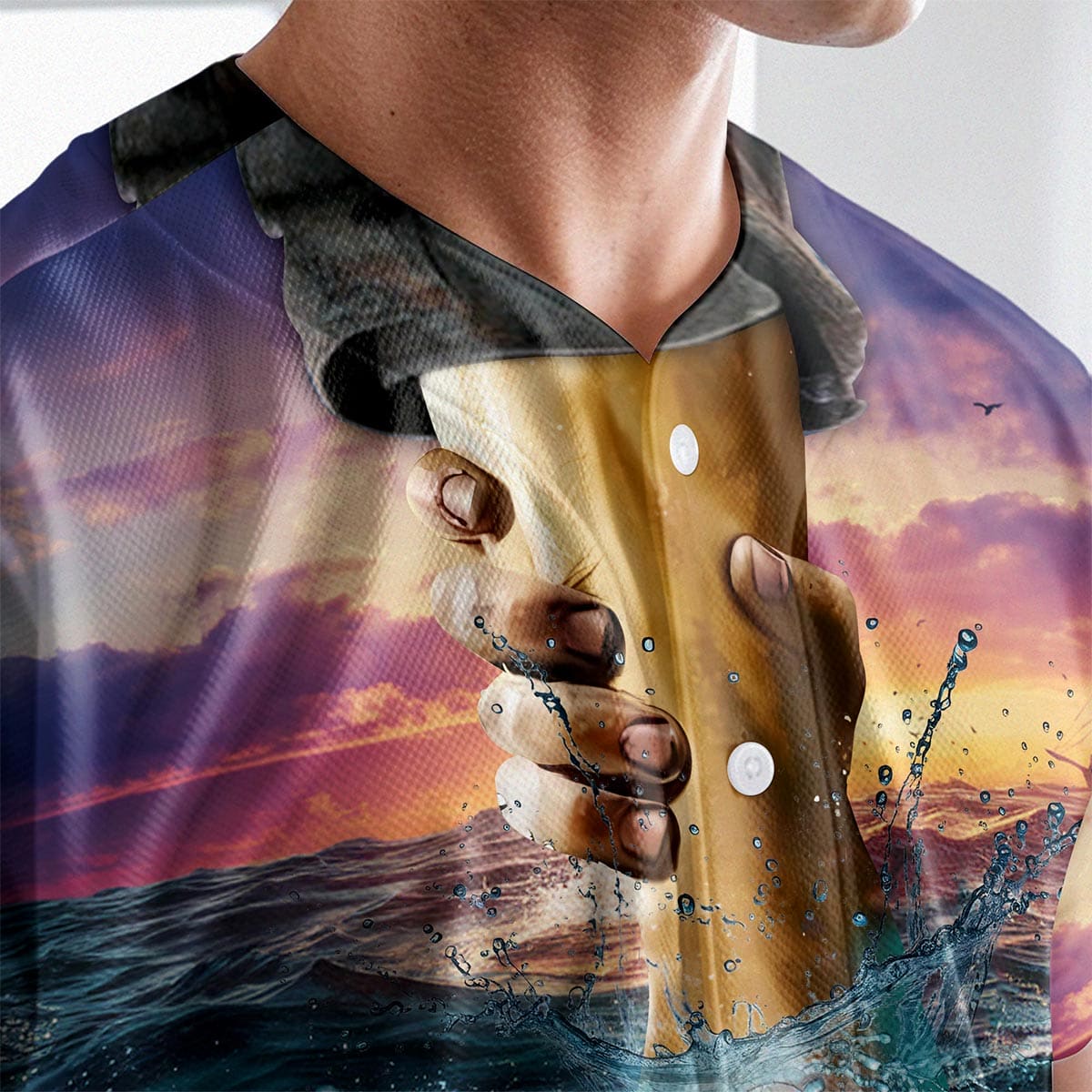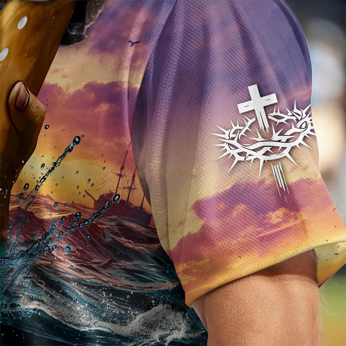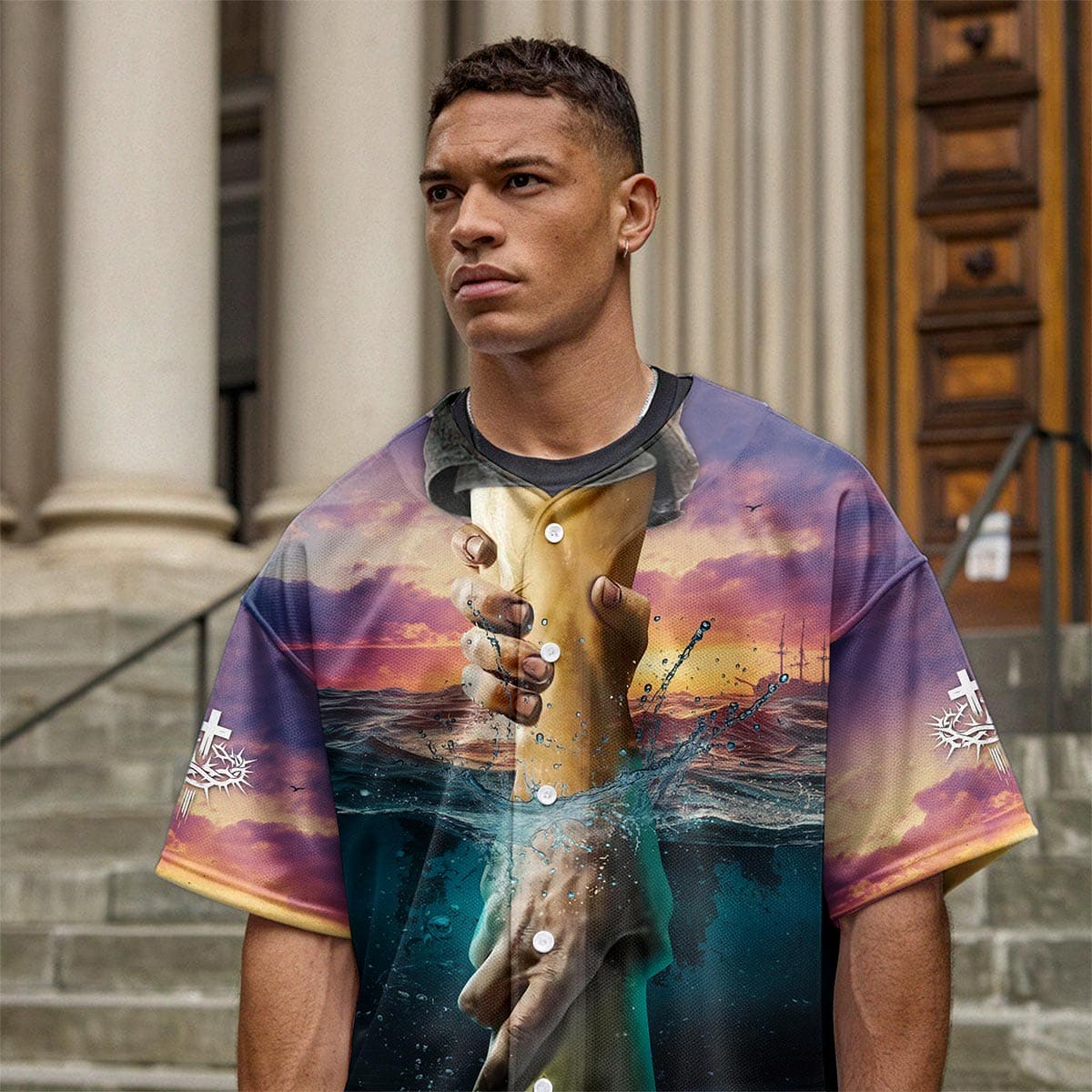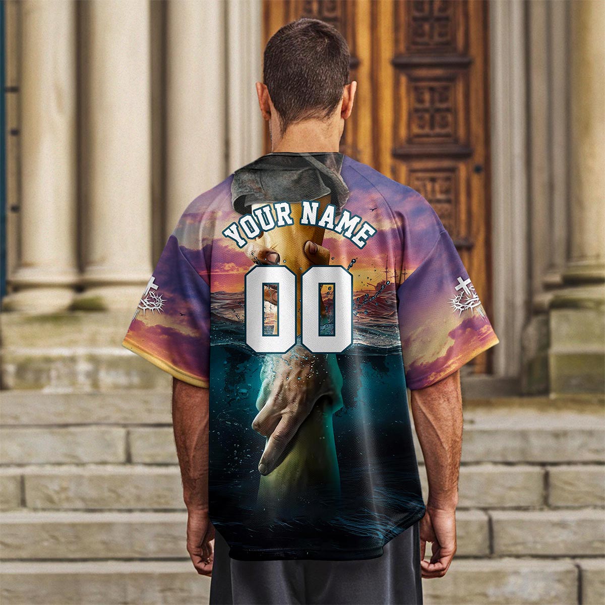This inspiring baseball jersey features a powerful visual of Jesus reaching out to save, showcasing the unwavering strength of faith and love. The striking imagery of a hand gripping a wooden cross amidst stormy waters is paired with the bold declaration “JESUS is my Savior,” making this piece a statement of both faith and style. The vibrant sunset sky and dramatic ocean scene add depth and emotion, creating a design that speaks to the heart.