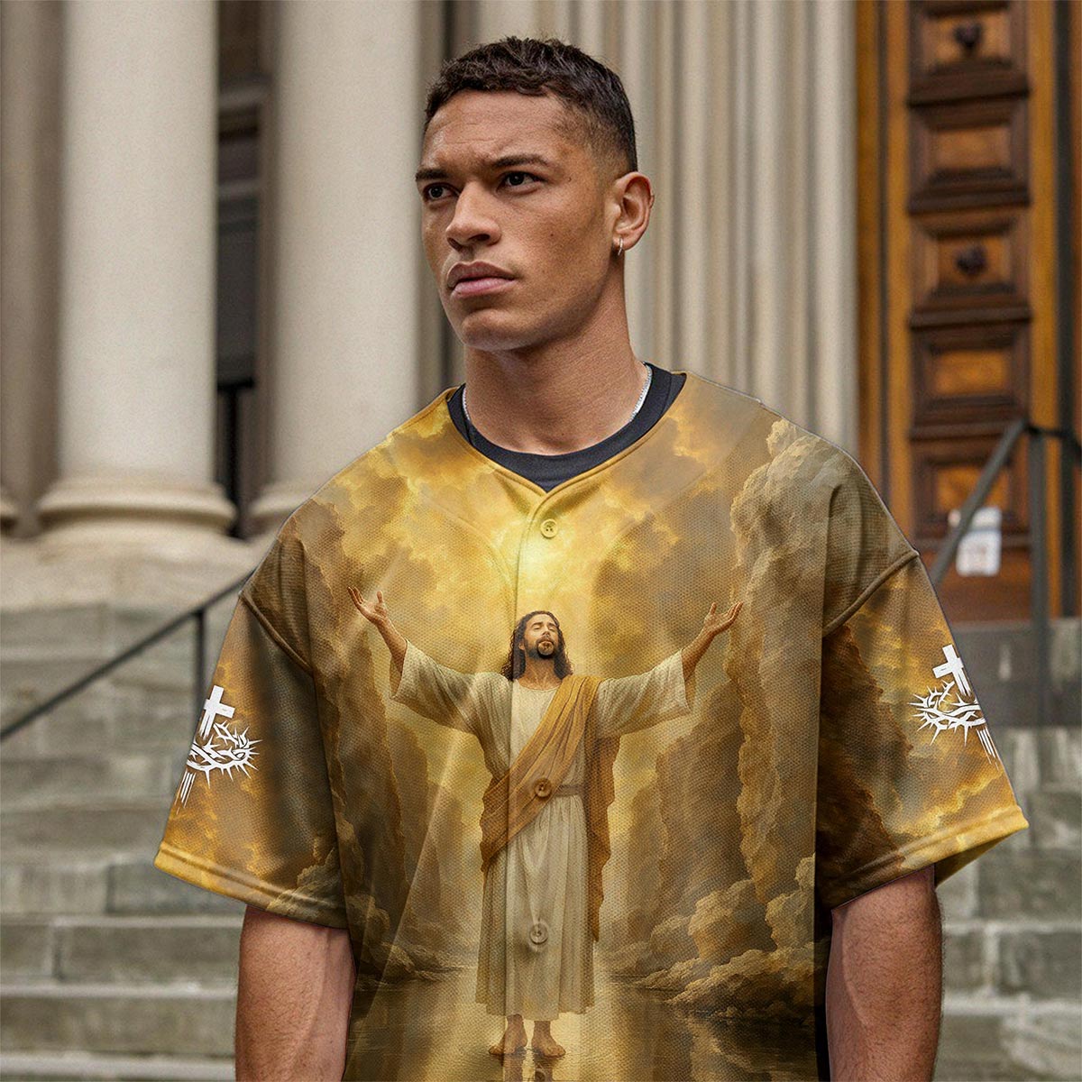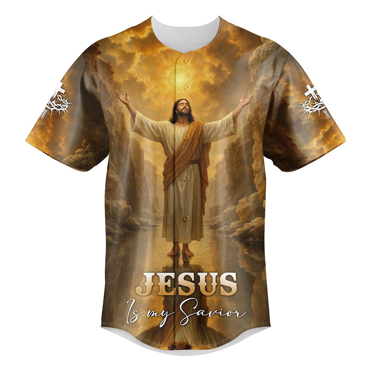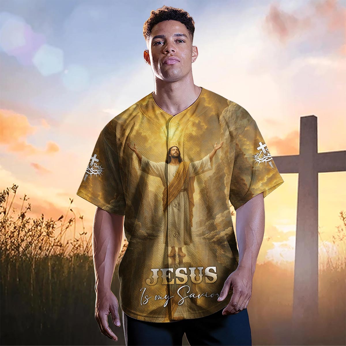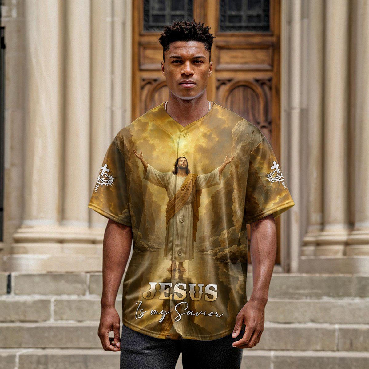 Let your faith shine in every step you take with the Jesus Is My Savior Baseball Jersey. Featuring a stunning full-body artwork of Jesus with arms raised in glory, surrounded by heavenly light and clouds, this jersey is a radiant symbol of salvation, hope, and eternal love.