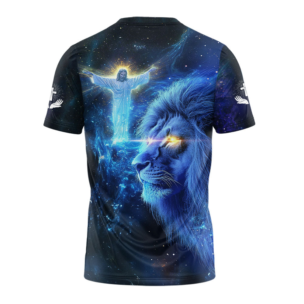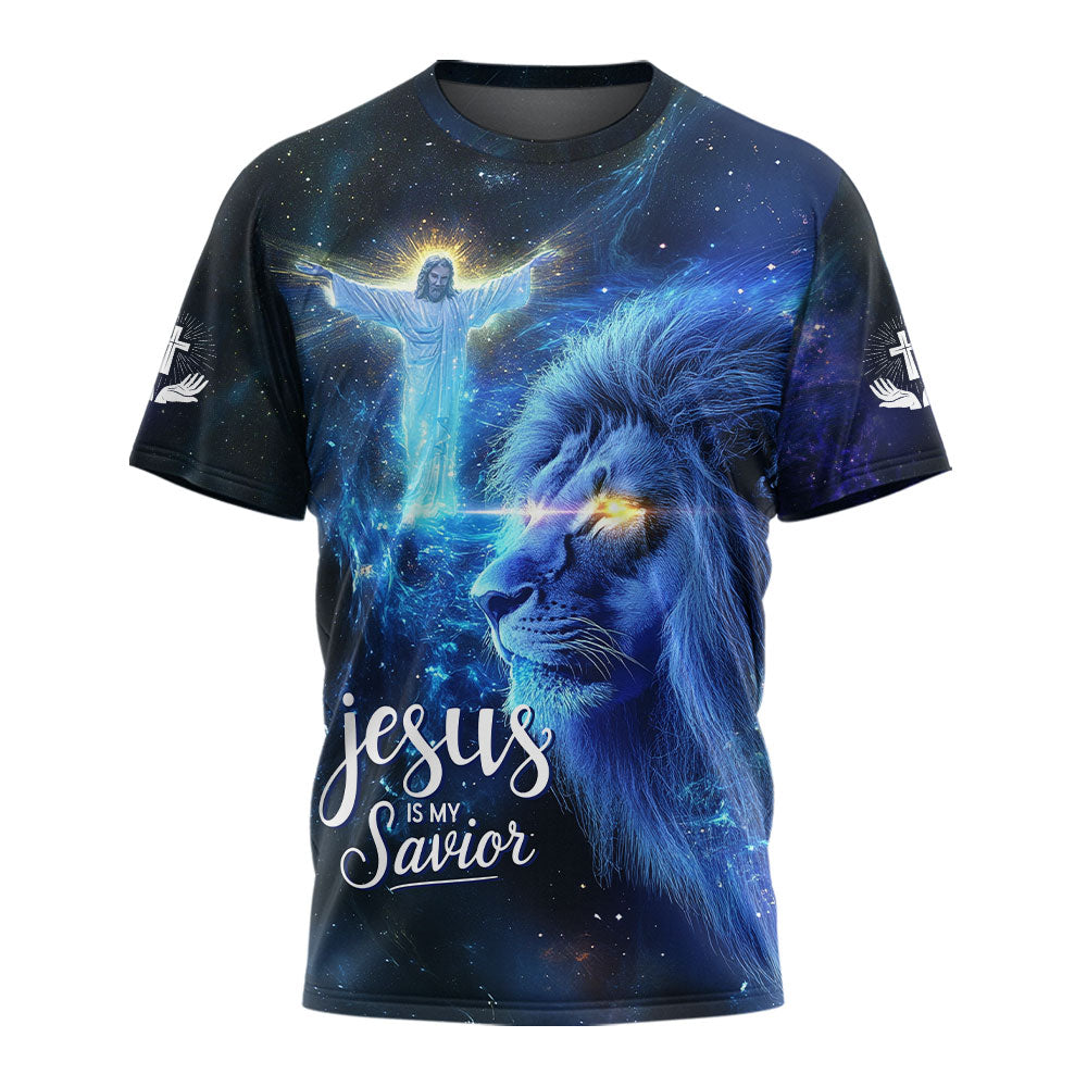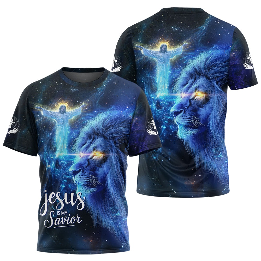 Celebrate your faith with the Jesus Is My Savior T-shirt, a stunning design that combines divine power and majestic strength. Featuring a cosmic blue background, this shirt showcases Jesus Christ in radiant glory and a powerful lion with glowing eyes—symbolizing His strength and protection. The phrase Jesus Is My Savior serves as a bold declaration of belief and devotion.
