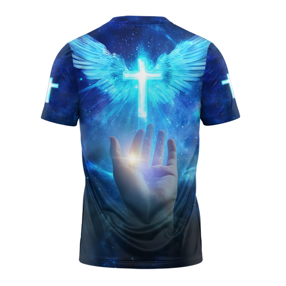 ✅ Inspiring Christian Design – Angel wings, cross, and hands illuminated in heavenly blue tones