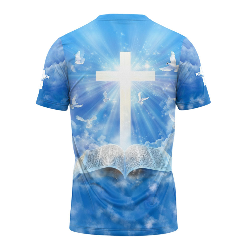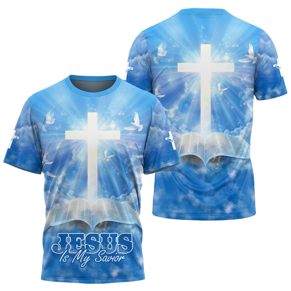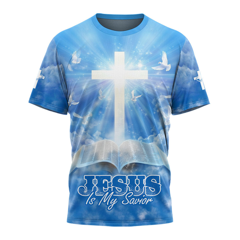 Shine your faith for the world to see with the Jesus Is My Savior T-shirt — a stunning and uplifting design that reflects the light of Christ. Featuring a breathtaking design of a glowing cross, an open Bible, and doves soaring in a heavenly sky, this jersey is a powerful declaration of your spiritual connection to Jesus Christ.