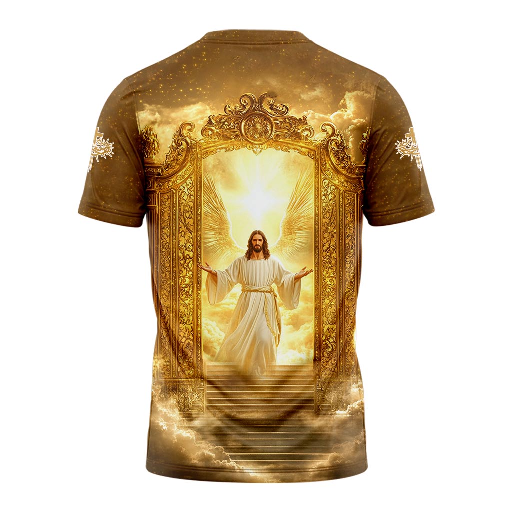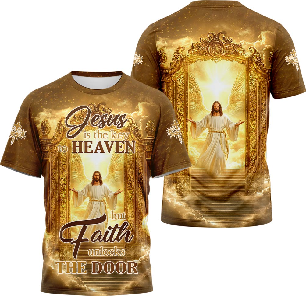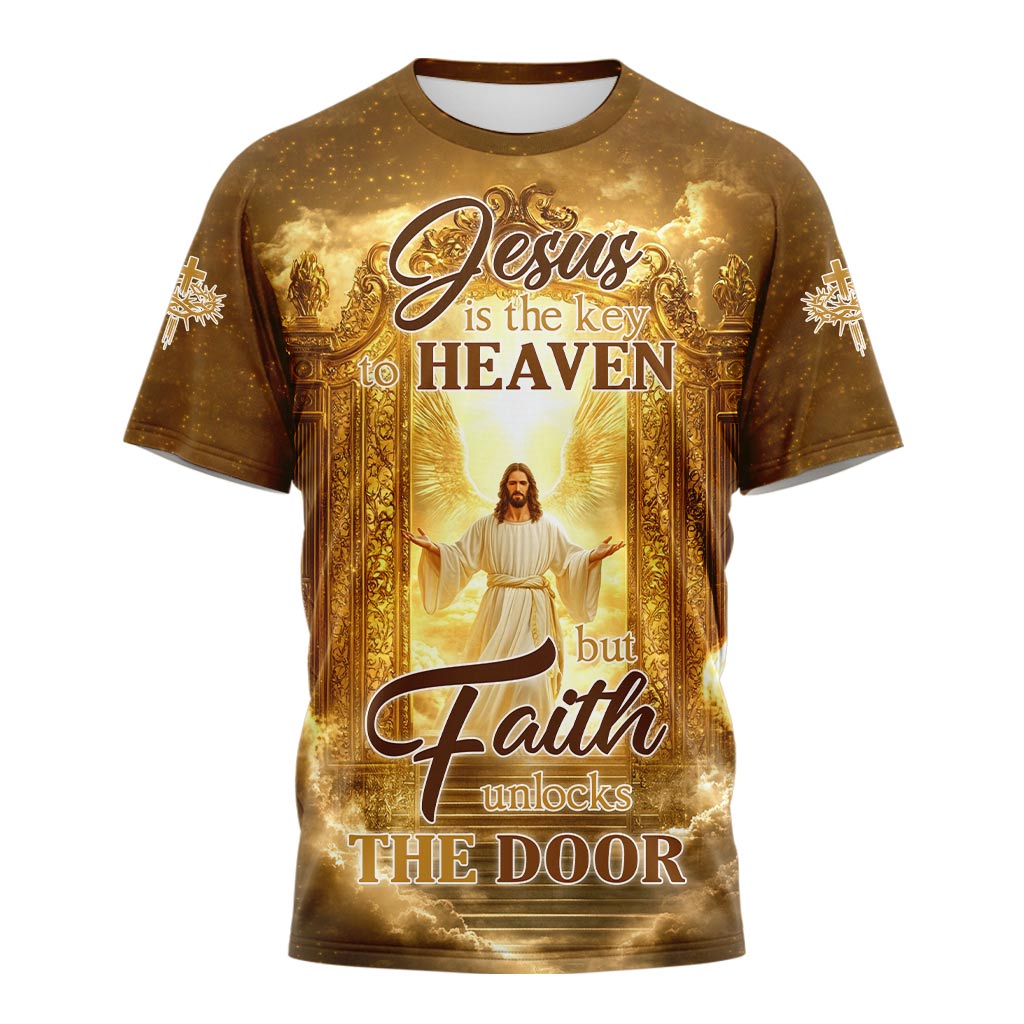 Step into faith with the Jesus Is the Key to Heaven T-shirt! Featuring a stunning celestial design with golden gates, angels, and a shining cross, this shirt beautifully represents the message: Jesus is the key to Heaven, but faith unlocks the door. A perfect way to share your belief and inspire others.