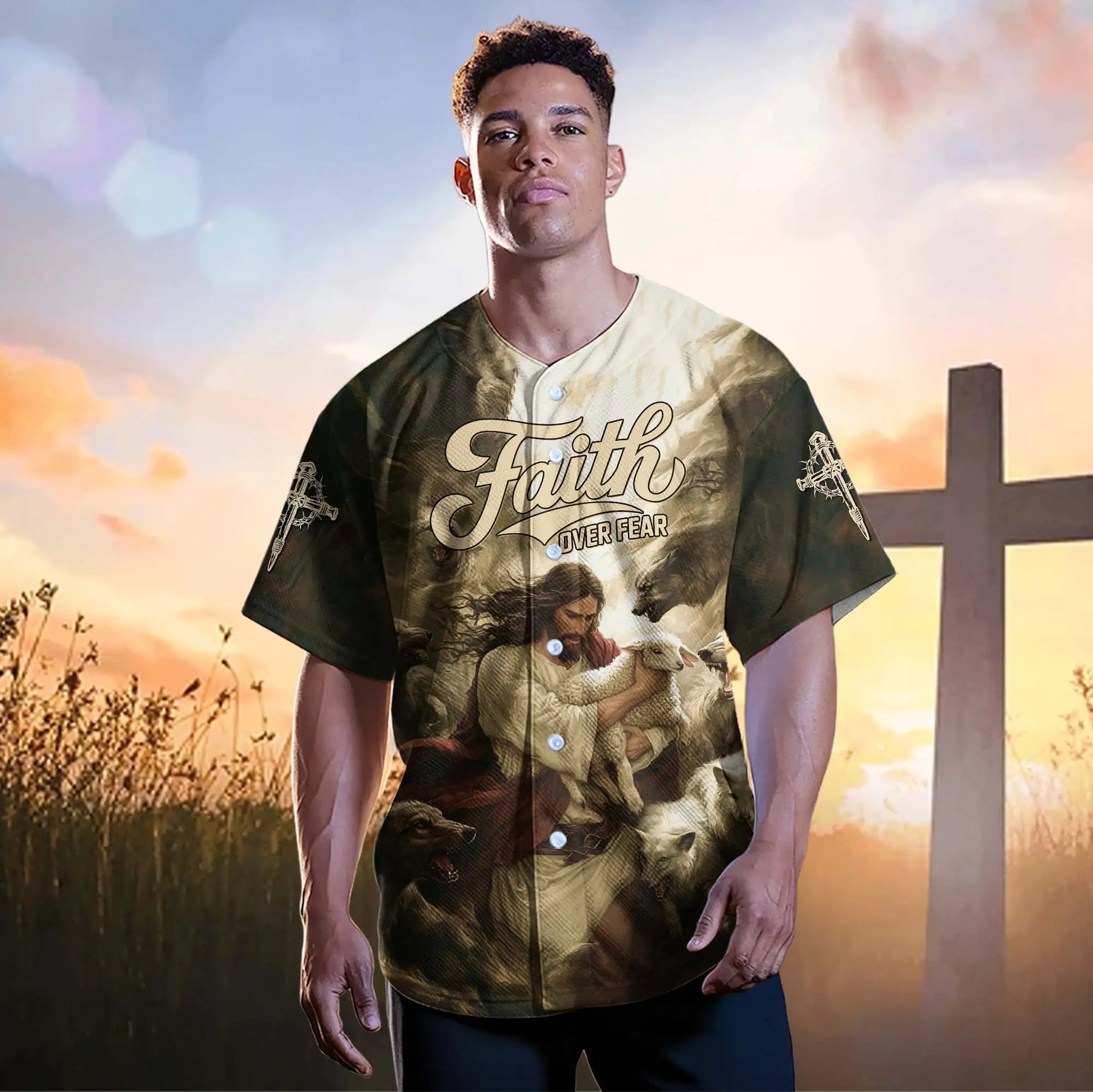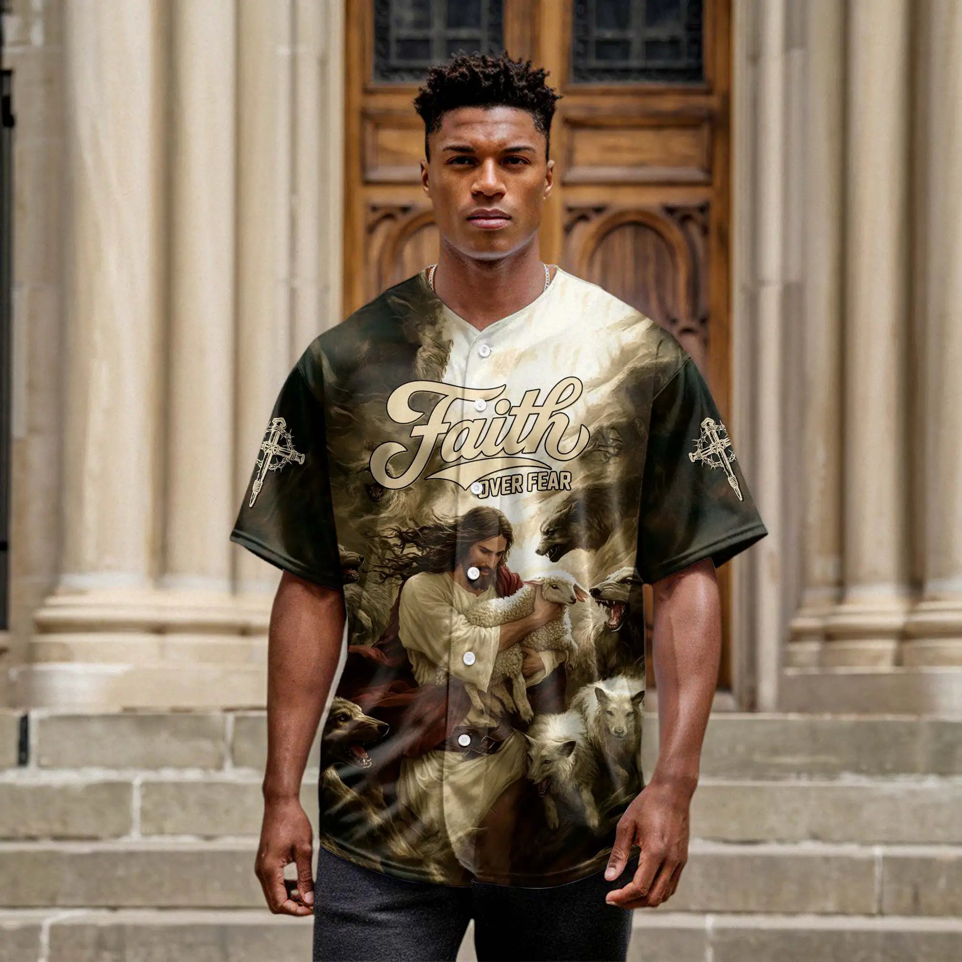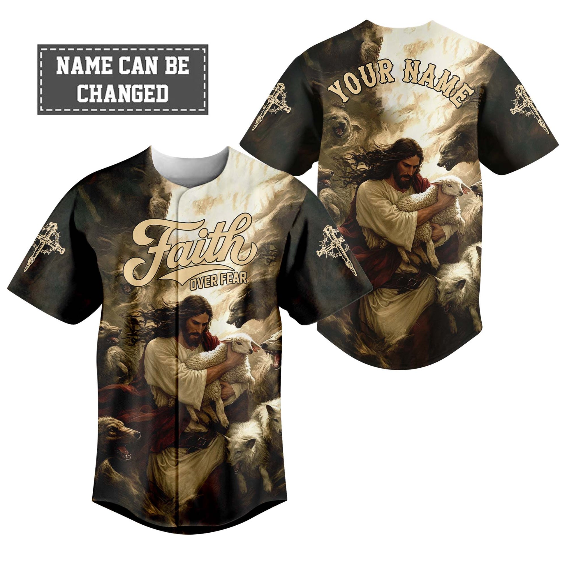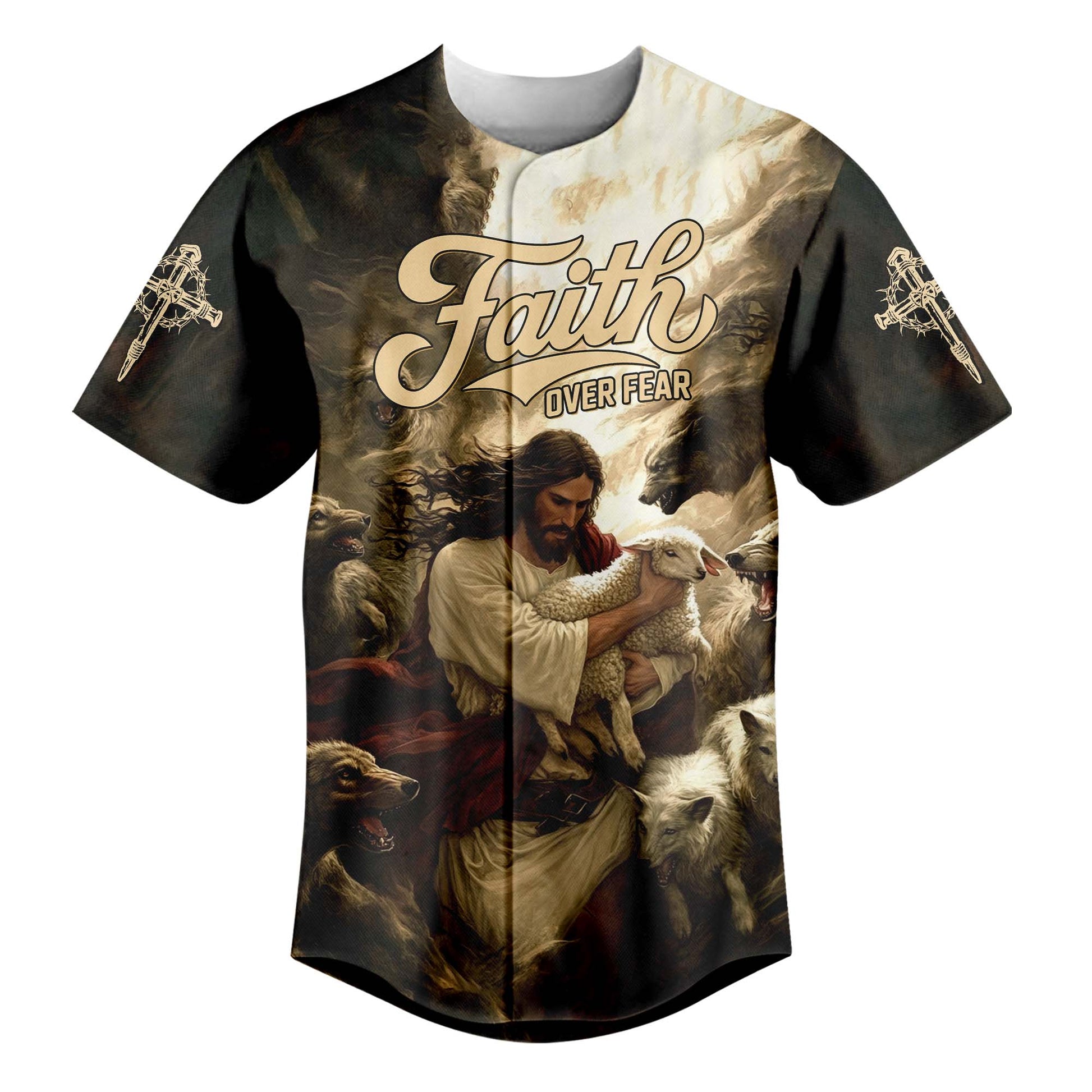 Embrace the comforting power of Jesus' protection with the "Jesus Protect the Lamb" baseball jersey. This inspiring design features Jesus, the Good Shepherd, lovingly holding a lamb, surrounded by wolves. The powerful "Faith Over Fear" message across the chest reminds you that with faith, Jesus shields His followers from fear and danger.