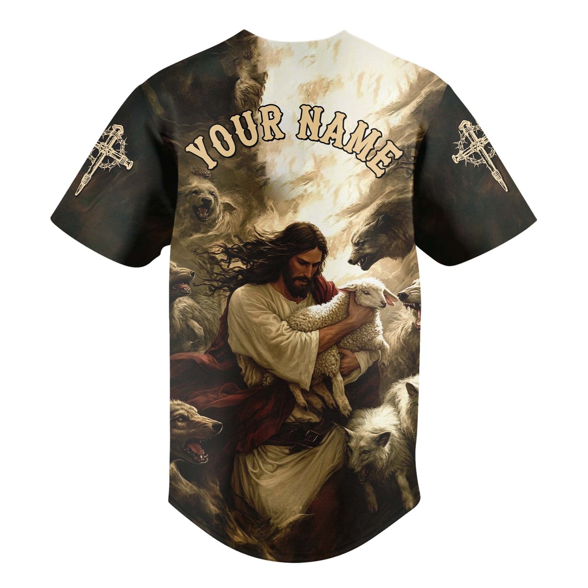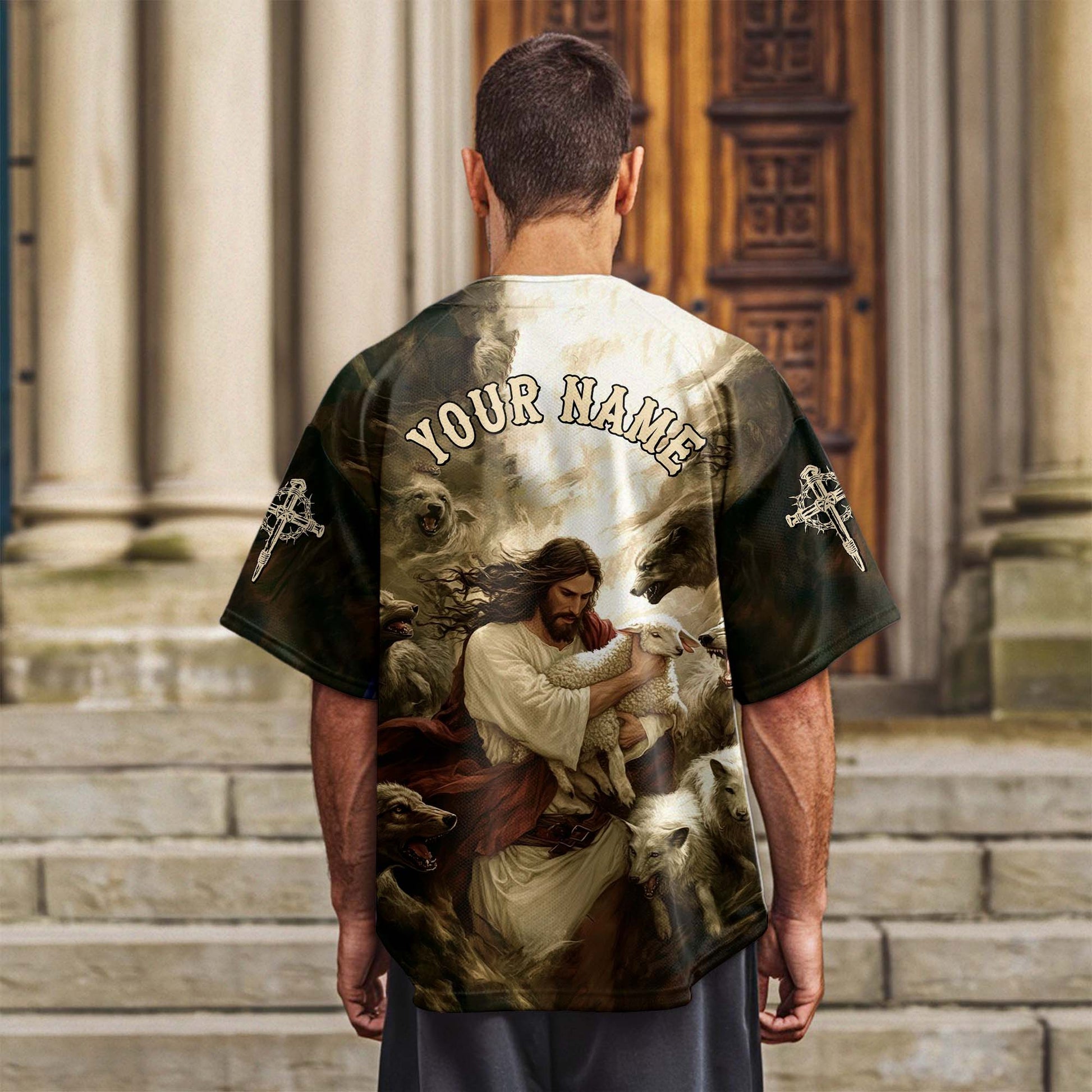 This jersey is a visual representation of His role as the protector of His flock, offering a sense of security and peace. Customize it with your name and number, and wear it proudly as a symbol of Jesus' unwavering protection. Perfect for those who find strength and assurance in the love and care of the Good Shepherd.