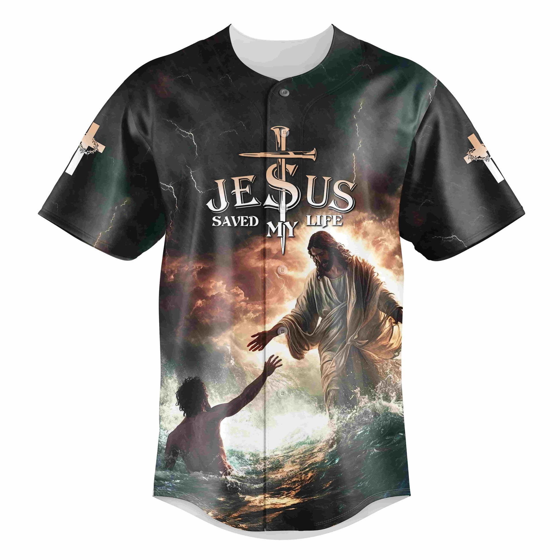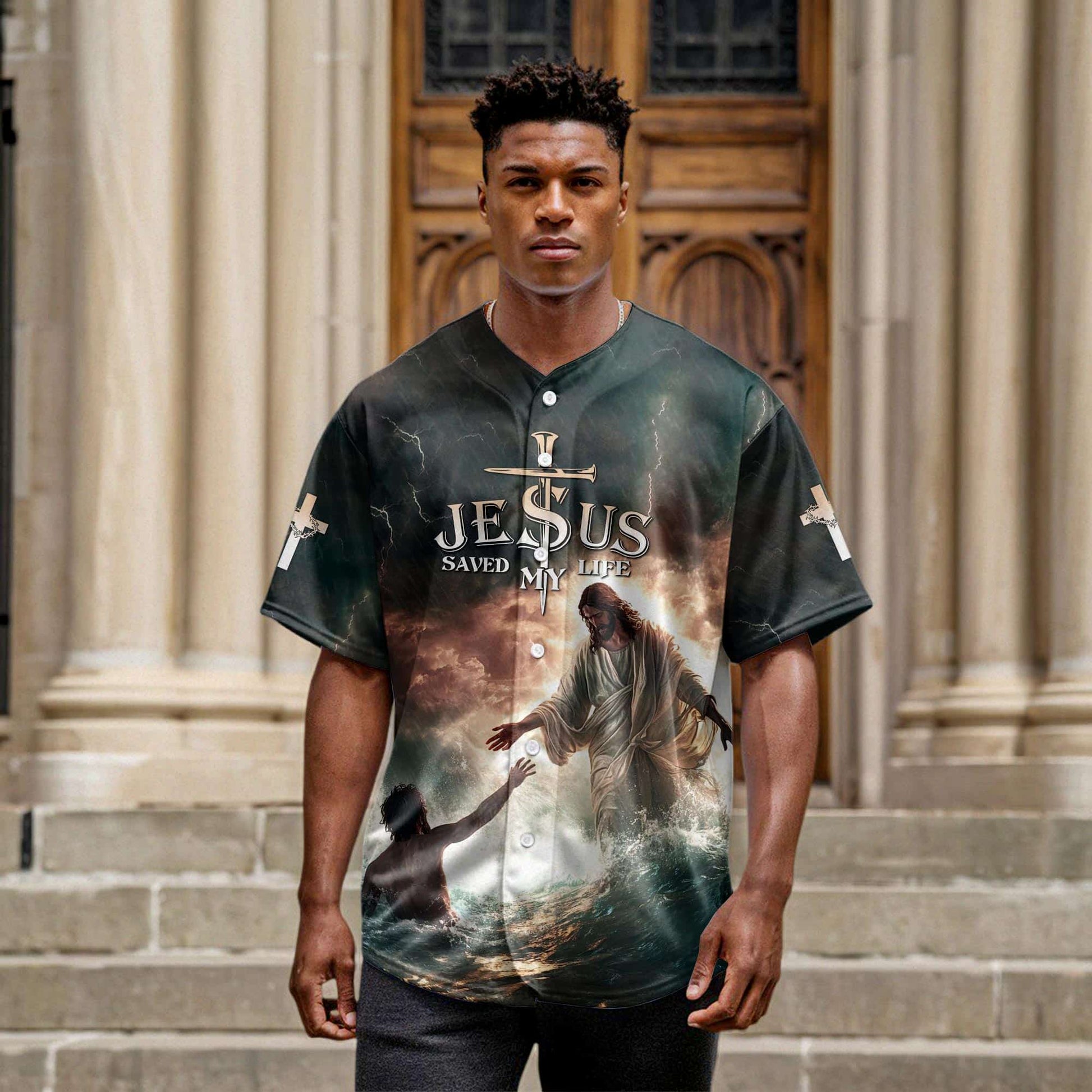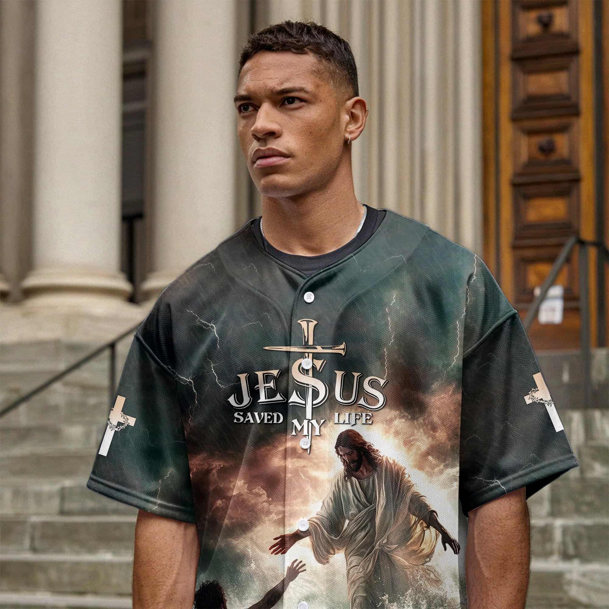 Declare the life-changing power of faith with the Jesus Saved My Life Baseball Jersey. This dynamic design captures the moment of salvation, with Jesus reaching out to save a figure in distress amid a dramatic, stormy sky. The bold message "Jesus Saved My Life" stands at the heart of this powerful visual, representing the hope and transformation that comes through Him.