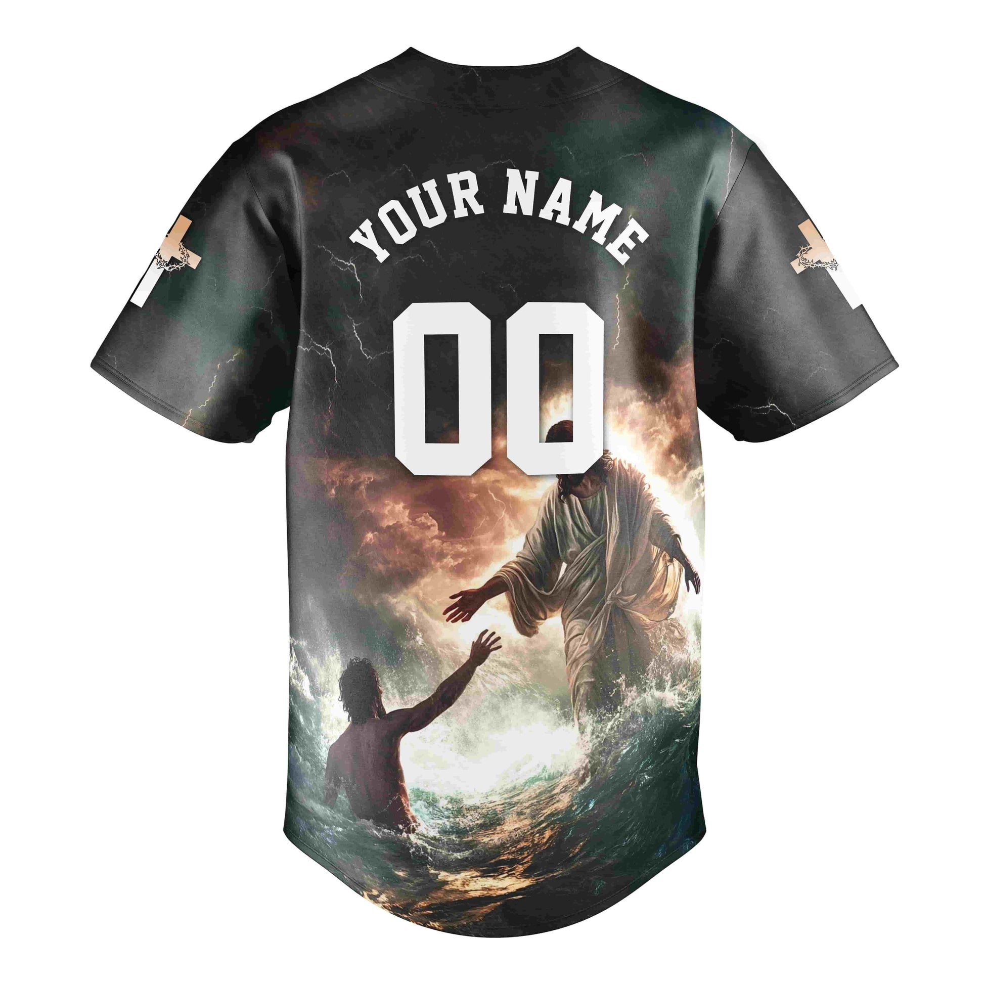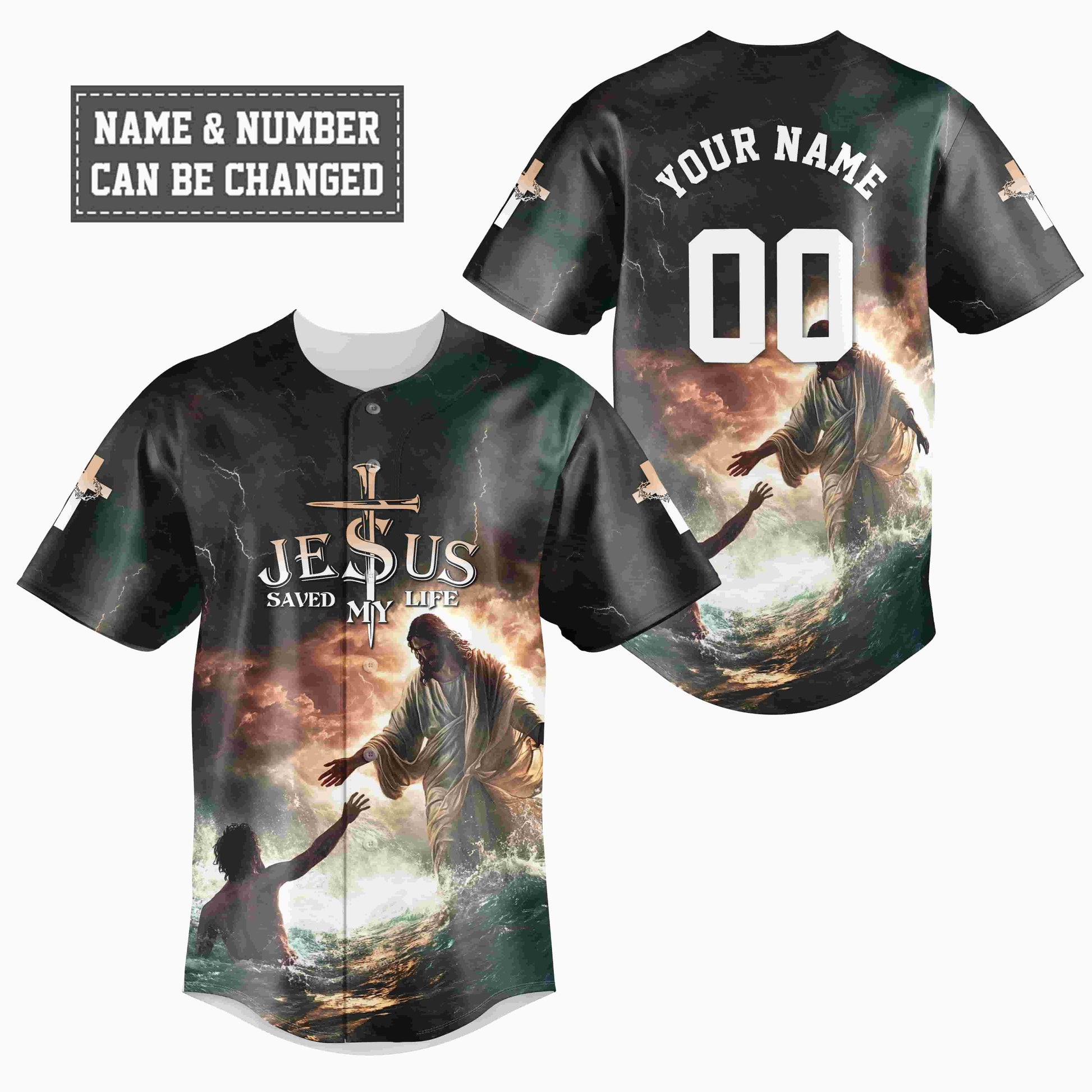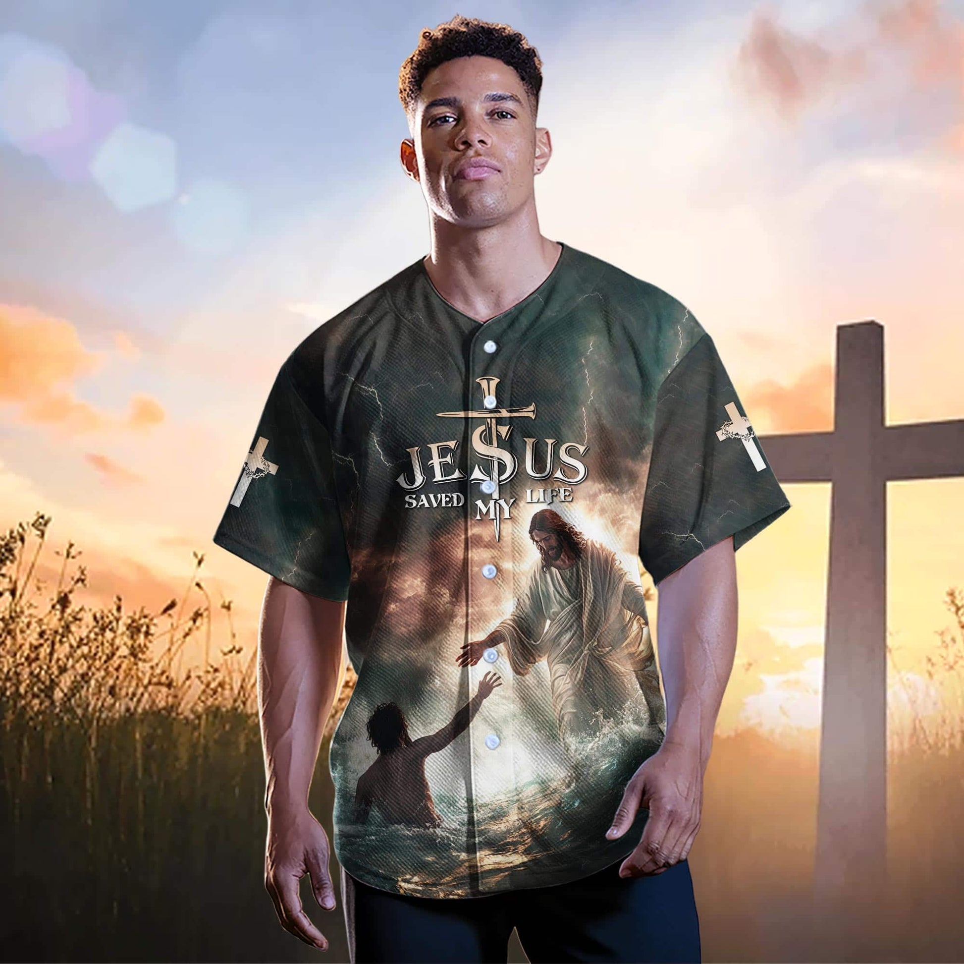 Declare the life-changing power of faith with the Jesus Saved My Life Baseball Jersey. This dynamic design captures the moment of salvation, with Jesus reaching out to save a figure in distress amid a dramatic, stormy sky. The bold message "Jesus Saved My Life" stands at the heart of this powerful visual, representing the hope and transformation that comes through Him.