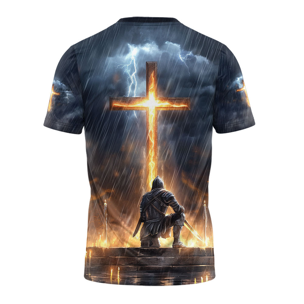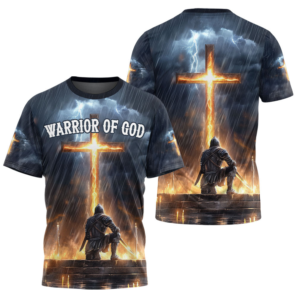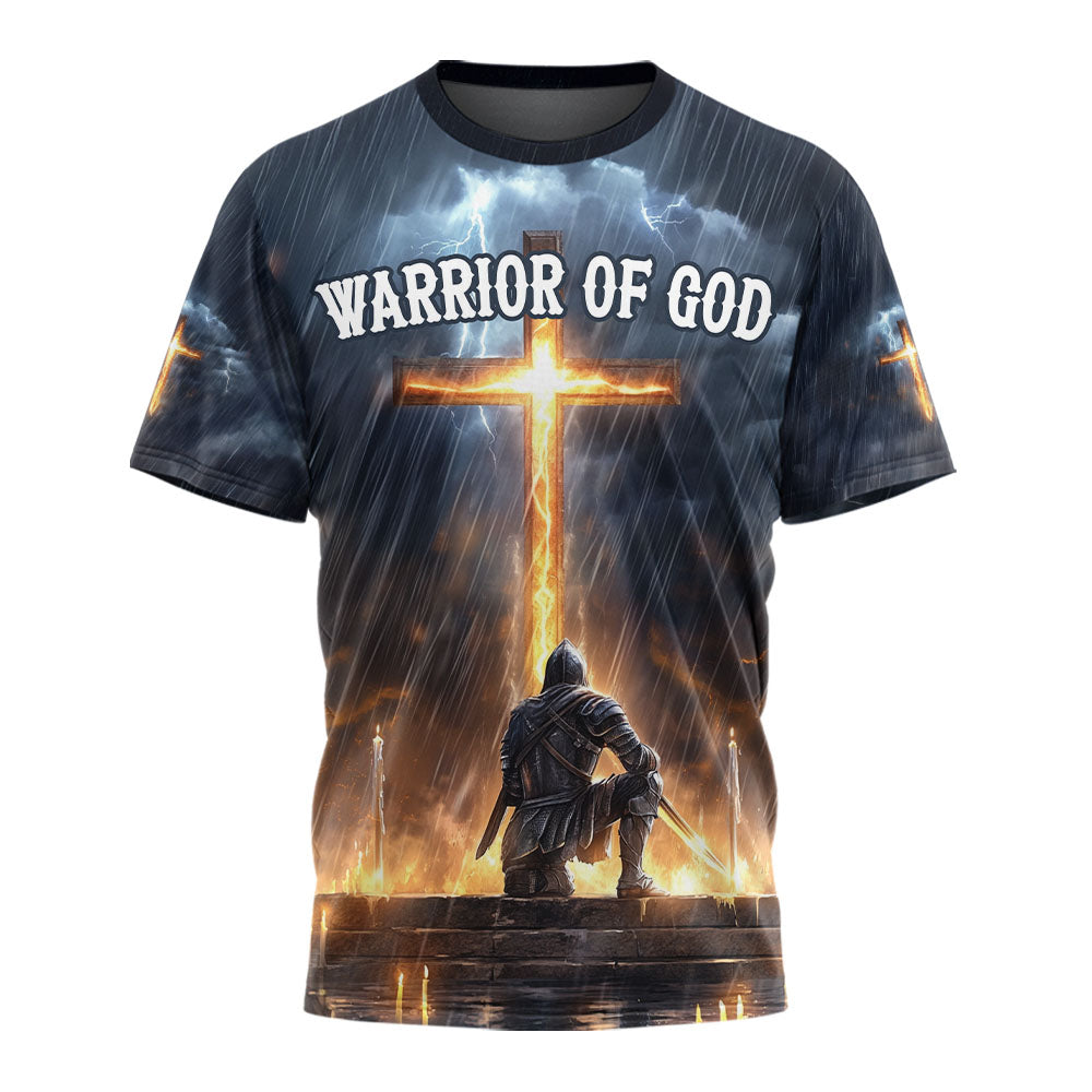 Stand strong in your faith with the Jesus Warrior Of God T-shirt. This powerful design features a warrior figure kneeling before a radiant cross, symbolizing strength, courage, and unwavering devotion to Christ. The bold "Warrior of God" text on the front serves as a daily reminder of your purpose as a believer and your role in God's army.
