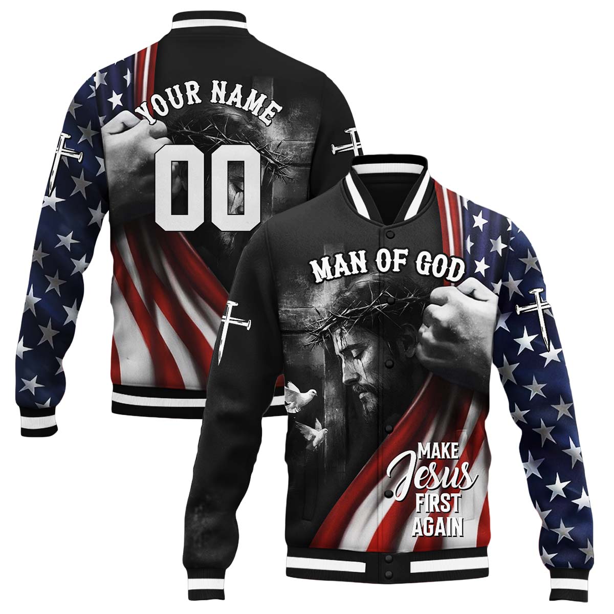 Show your devotion with the Make Jesus First Again Baseball Jacket, a bold and inspiring blend of faith and patriotism. Featuring a striking black-and-white design of Jesus wearing the crown of thorns, overlaid with a gripping hand on the American flag, this jacket symbolizes strength, sacrifice, and unwavering belief. The "Make Jesus First Again" message serves as a reminder to put Christ at the center of our lives.