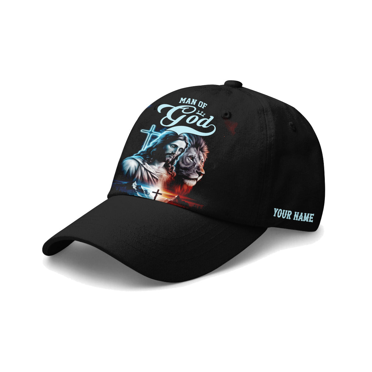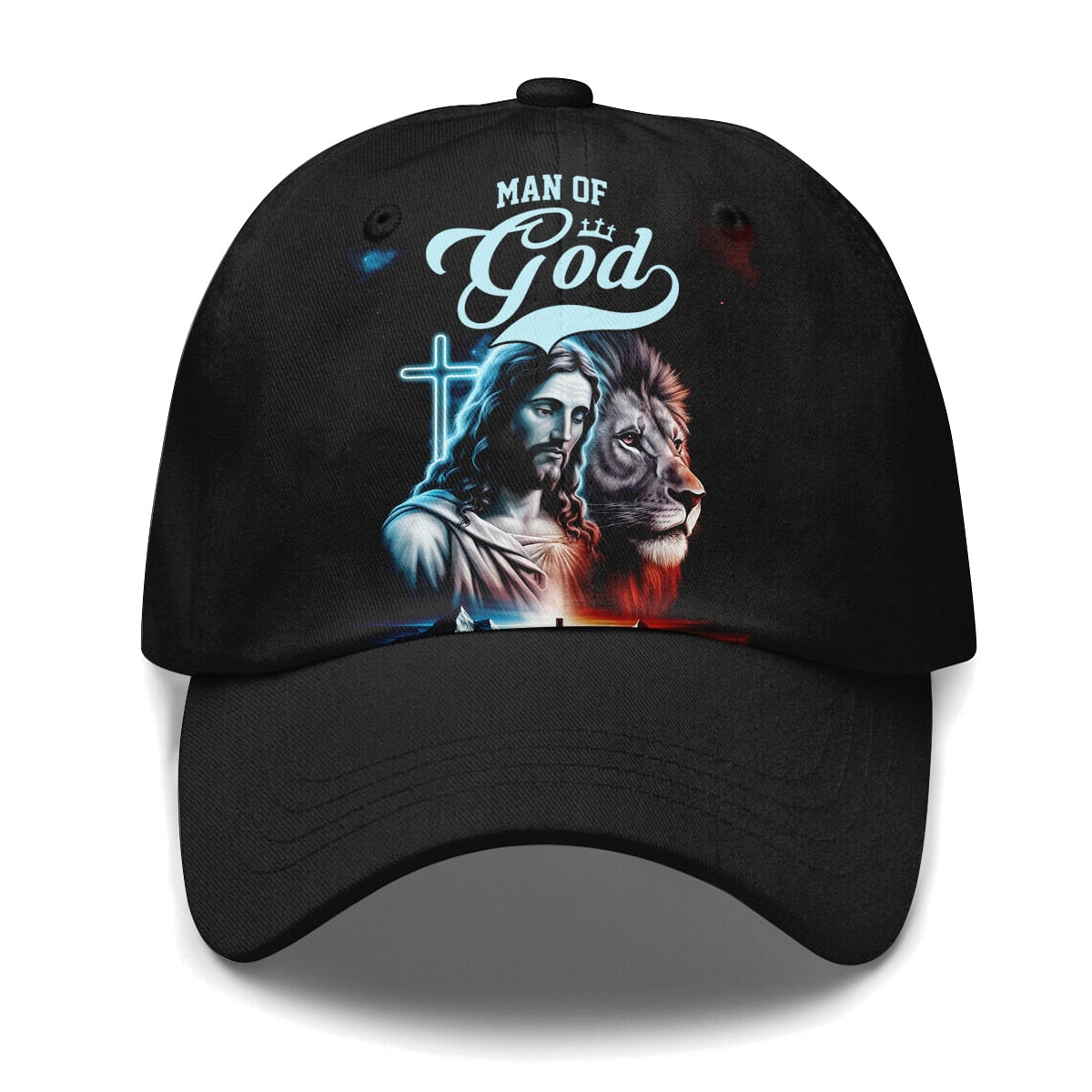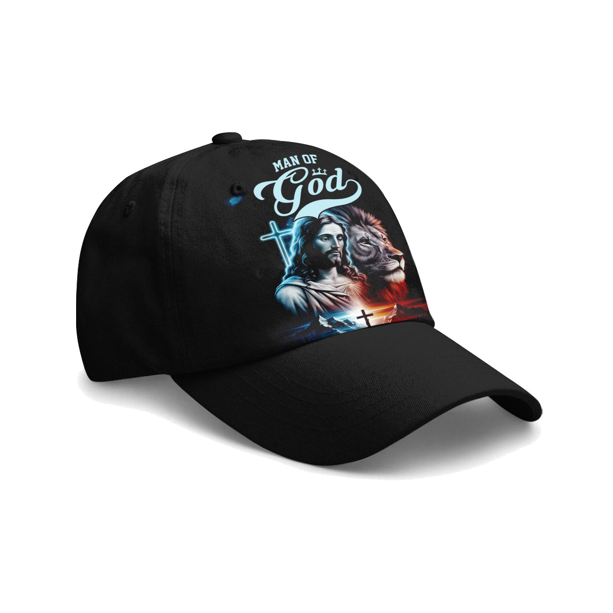 Express your faith boldly with the Man of God Jesus and Lion Baseball Cap. This beautifully designed cap features an artistic image of Jesus alongside a powerful lion, symbolizing strength and devotion. The stunning graphic is enhanced by a glowing cross in the background, creating a visually striking effect.