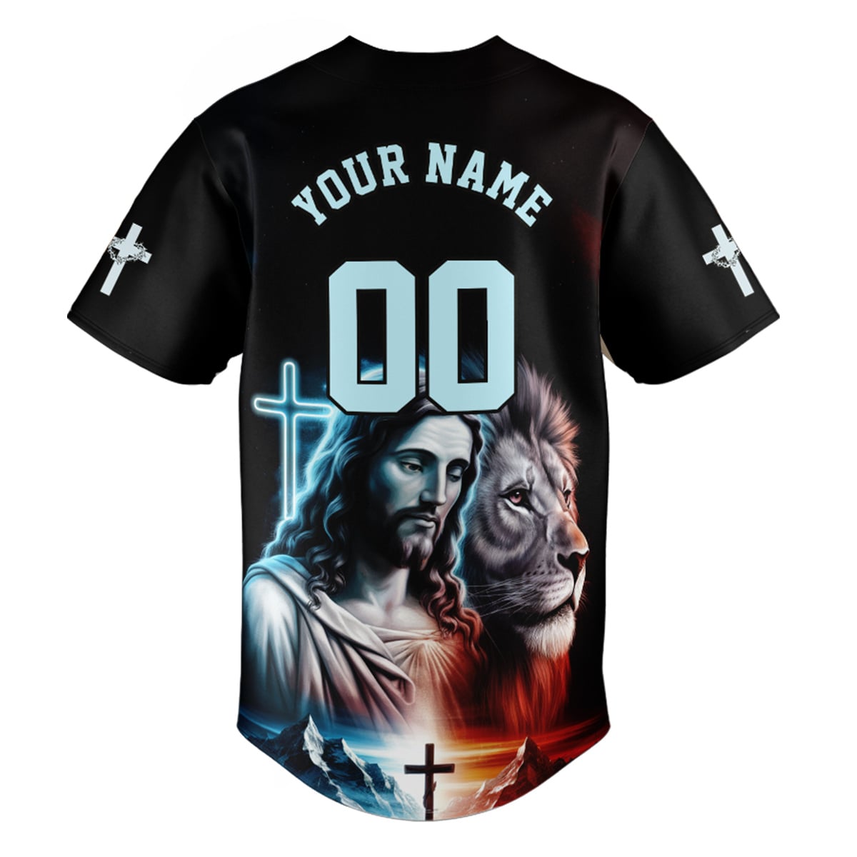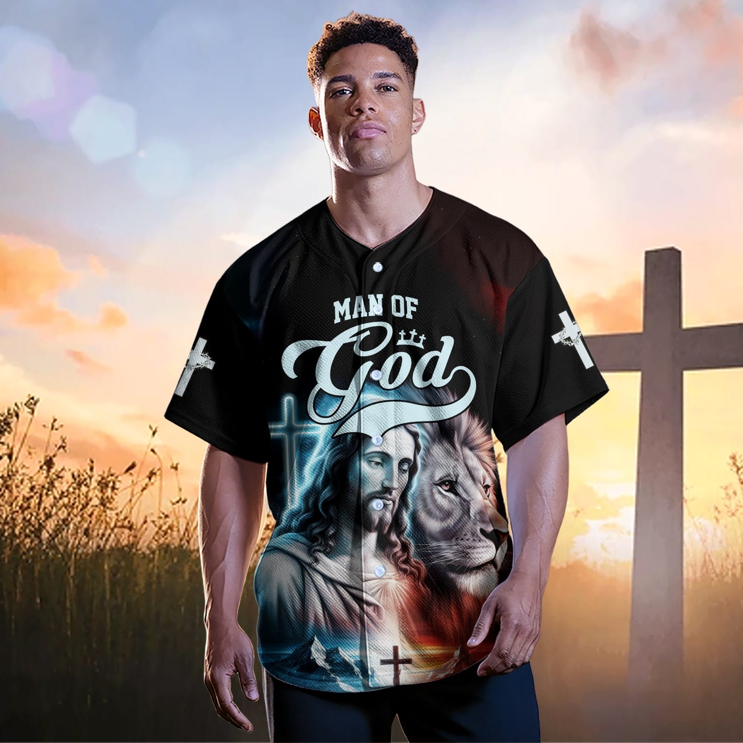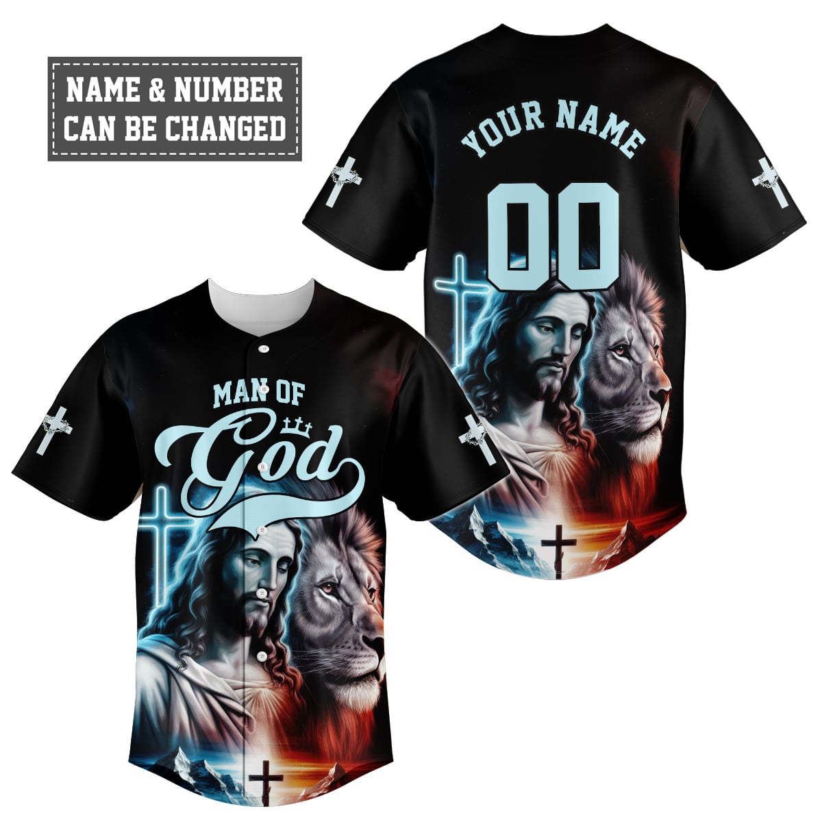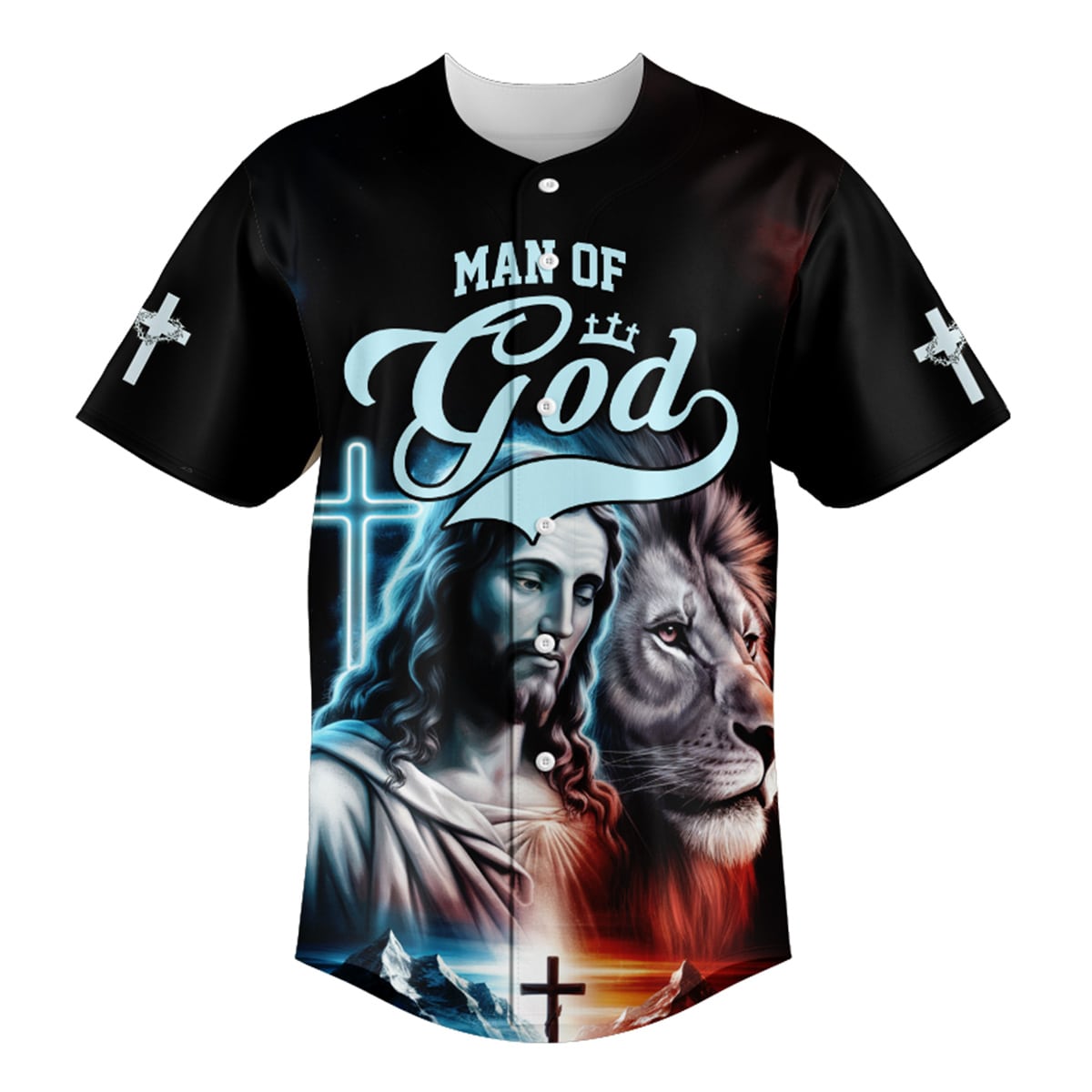 Declare your faith and strength with the "Man of God – Jesus and Lion" baseball jersey. This powerful design features the image of Jesus Christ, His divine presence glowing in vibrant colors, next to the majestic lion, a symbol of His strength and power as the Lion of Judah. The iconic crosses and the dramatic backdrop of mountains and light further emphasize the divine authority of Jesus.