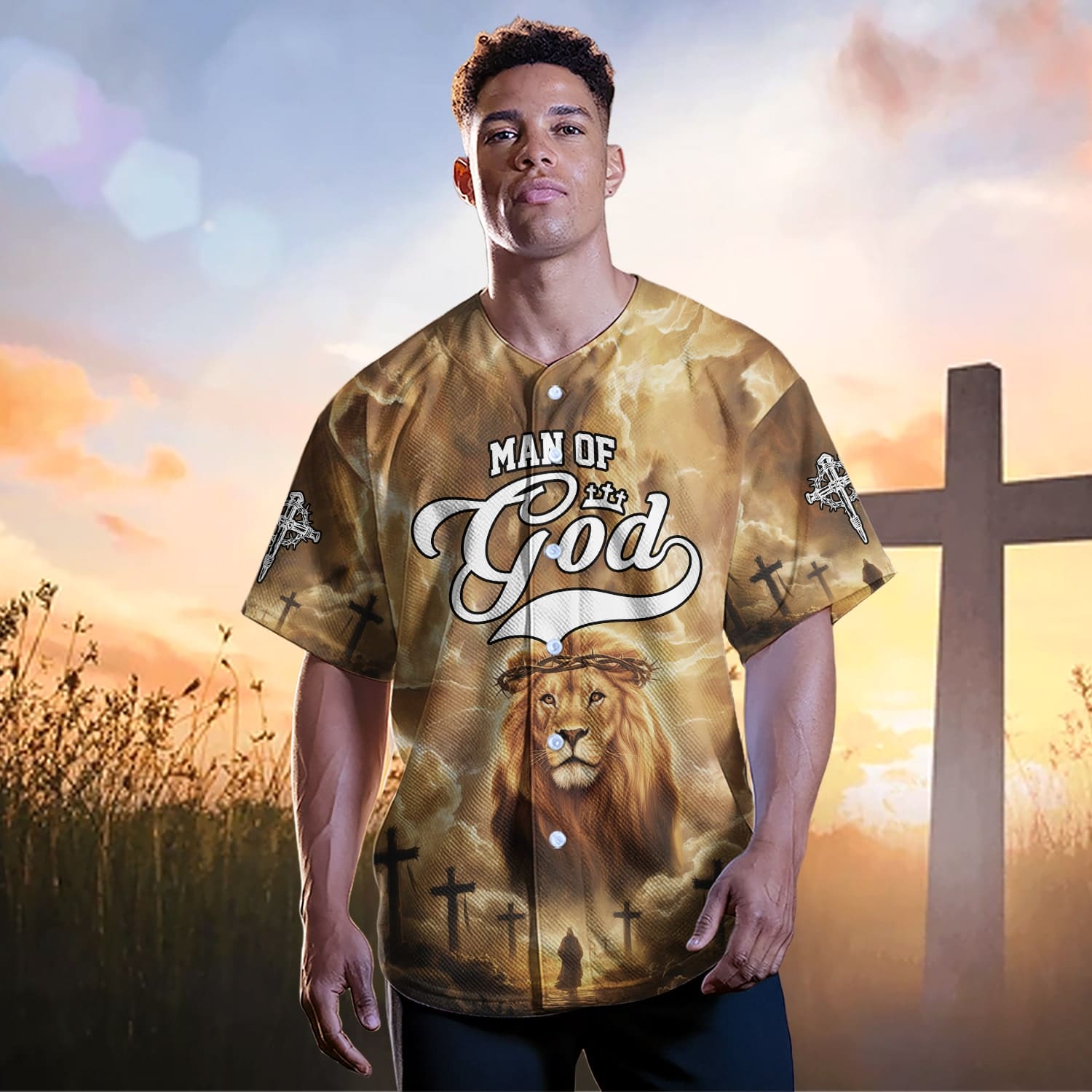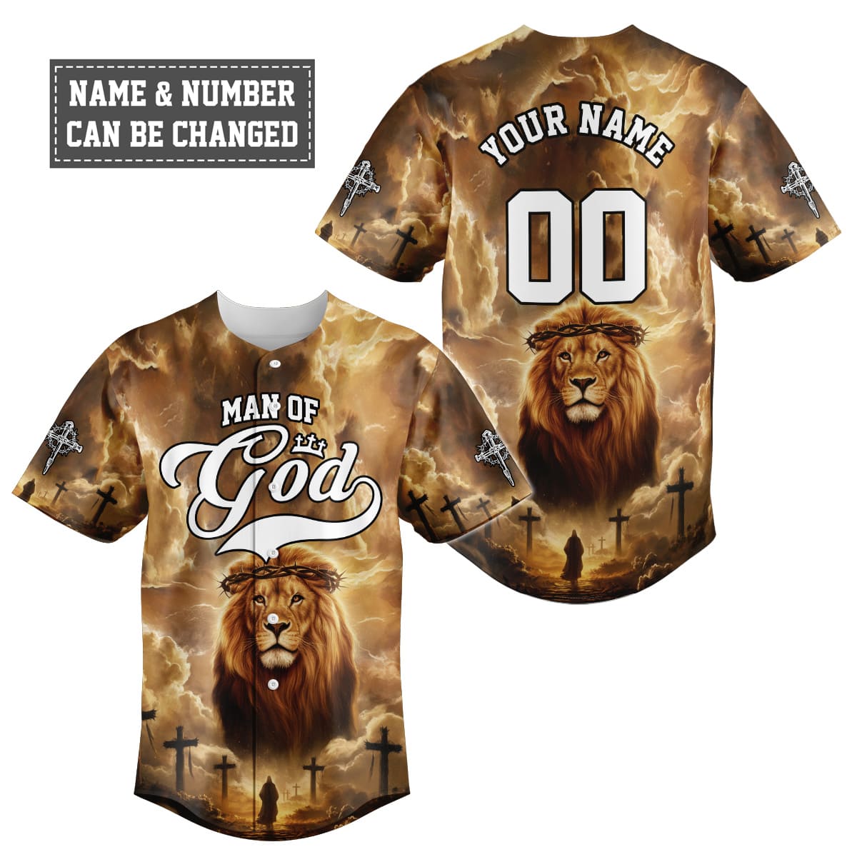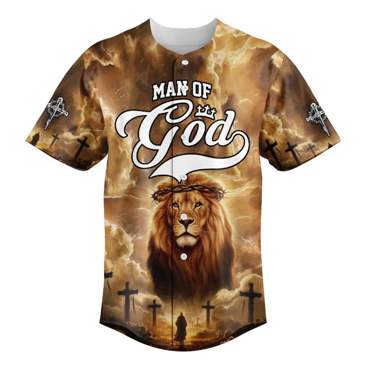 Step into your divine strength with the "Man of God – Lion’s Courage" baseball jersey. This powerful design showcases a majestic lion crowned with thorns, symbolizing the boldness and bravery of Jesus, the Lion of Judah. The dramatic sky and distant crosses evoke the strength and sacrifice of Christ’s journey. The bold "Man of God" message across the chest emphasizes your faith and courage as a follower of Christ.