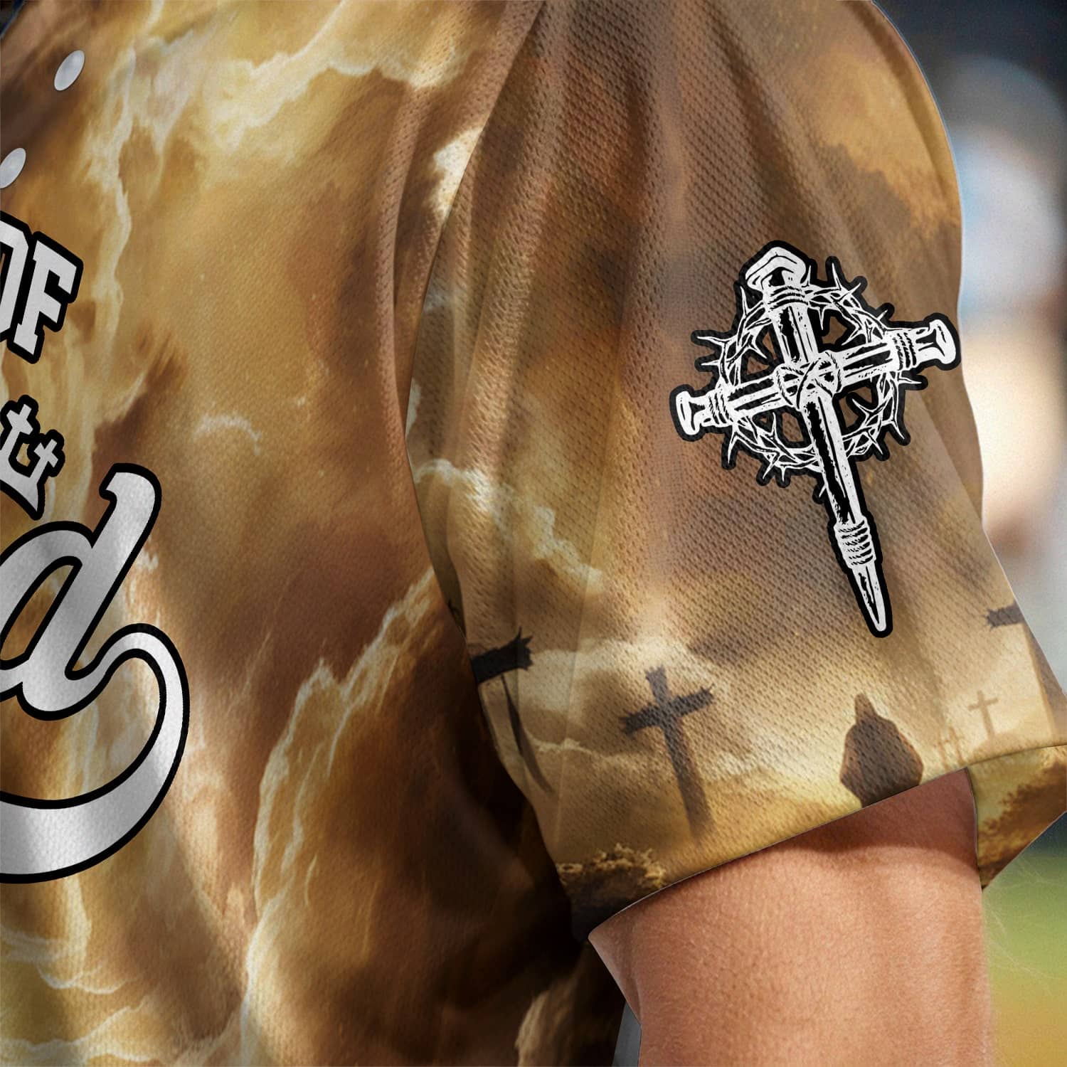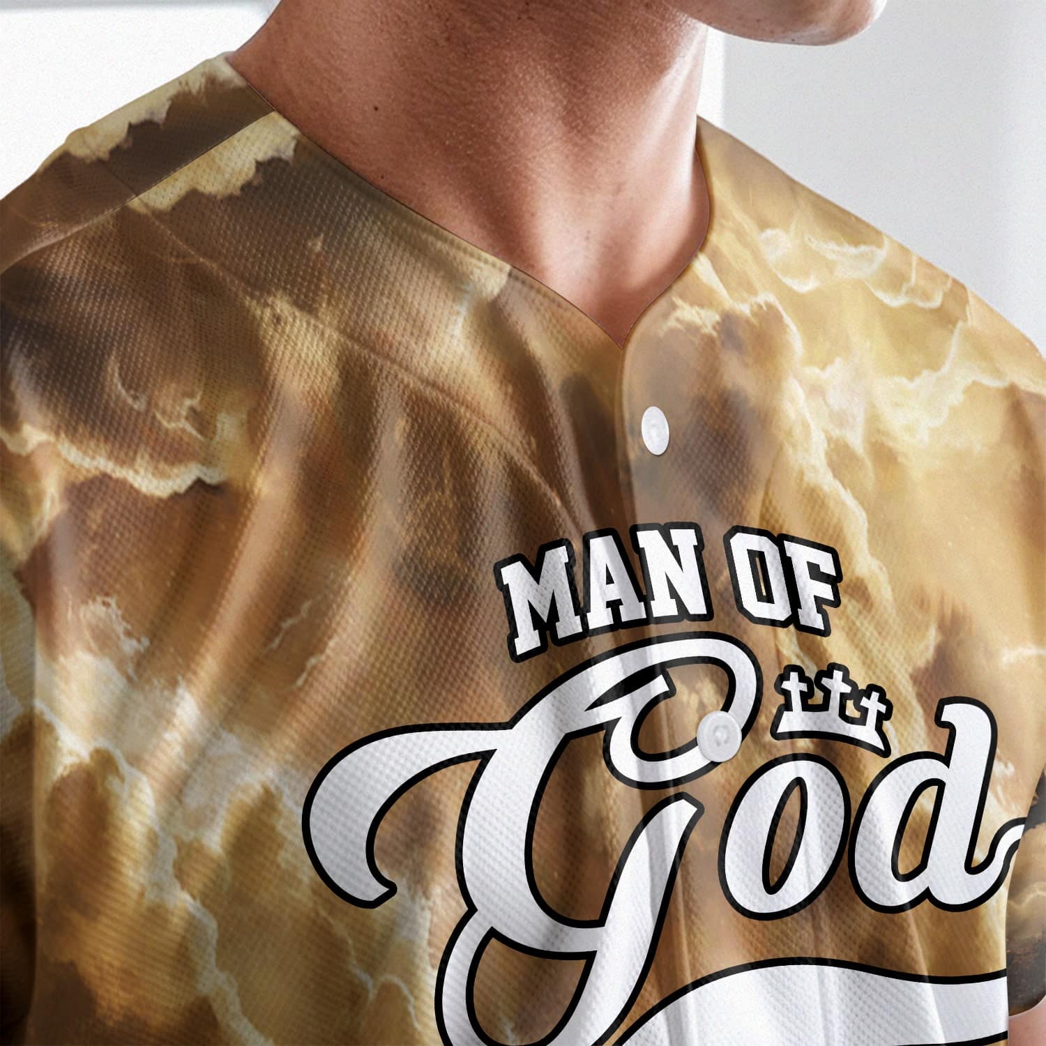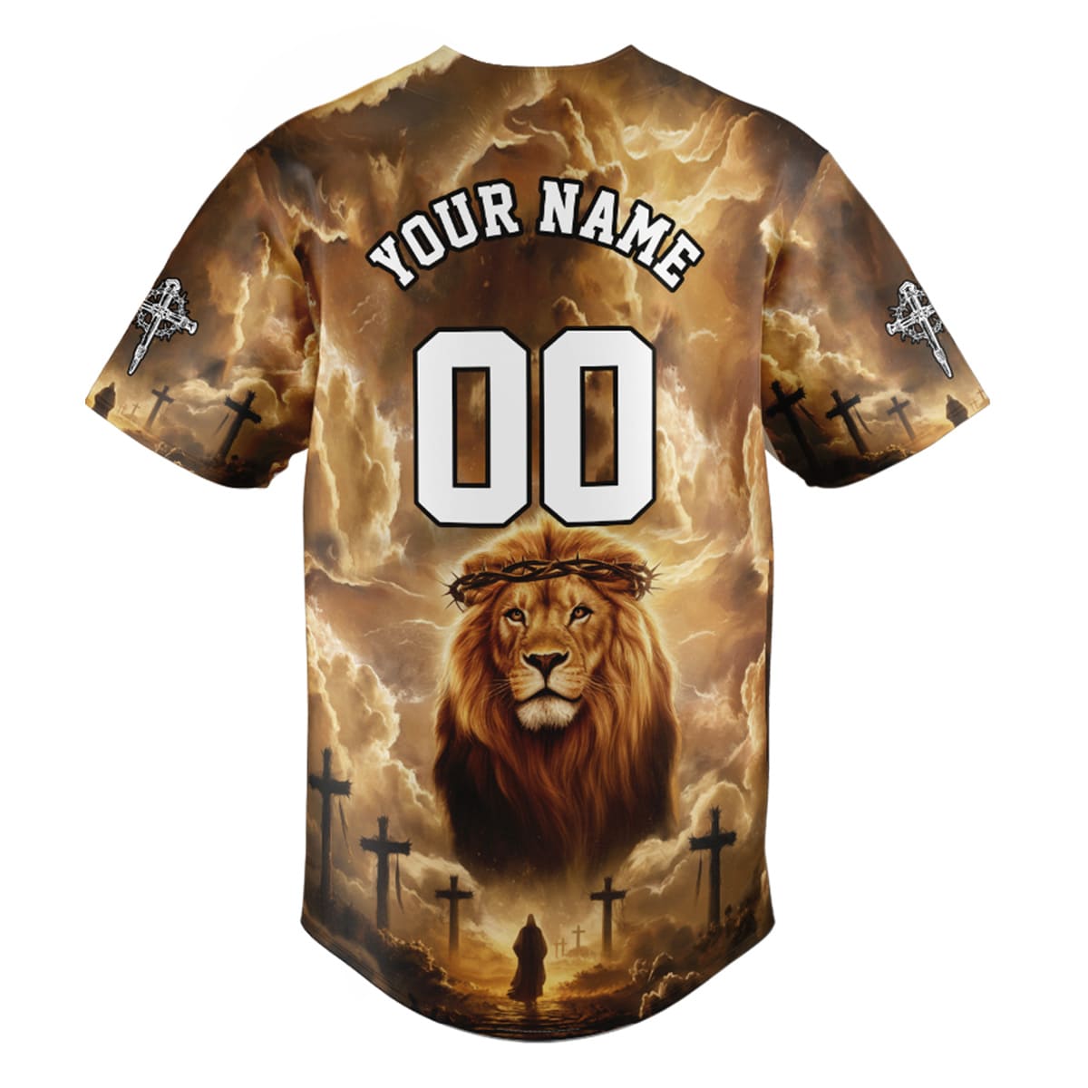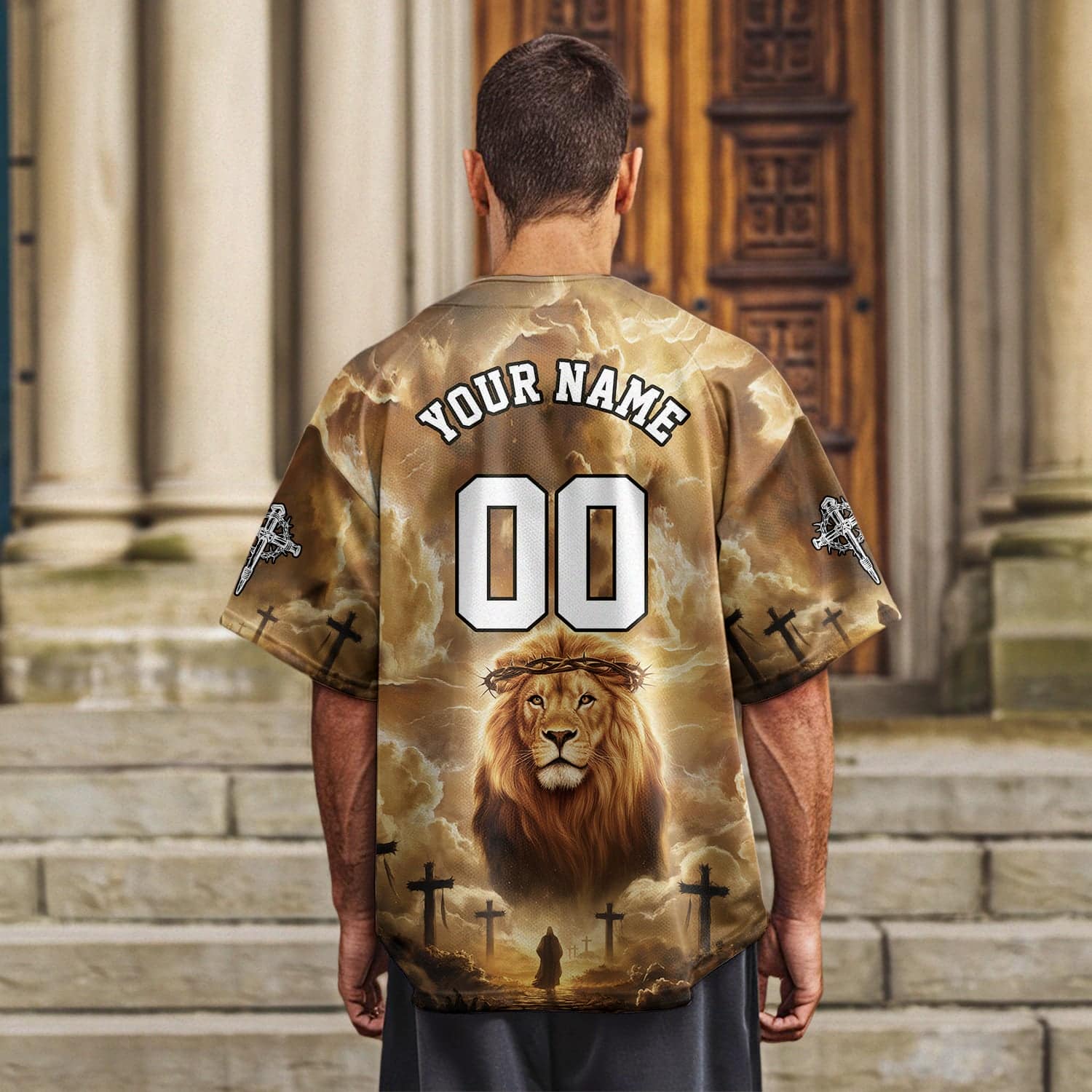 Step into your divine strength with the "Man of God – Lion’s Courage" baseball jersey. This powerful design showcases a majestic lion crowned with thorns, symbolizing the boldness and bravery of Jesus, the Lion of Judah. The dramatic sky and distant crosses evoke the strength and sacrifice of Christ’s journey. The bold "Man of God" message across the chest emphasizes your faith and courage as a follower of Christ.