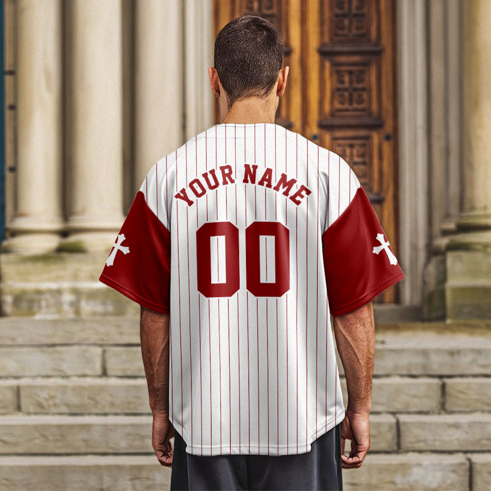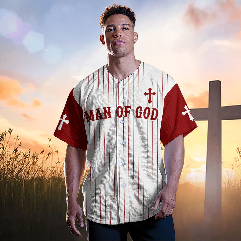 This clean, classic design features vertical pinstripes on a white backdrop, paired with deep red sleeves and lettering. The powerful title “MAN OF GOD” is printed across the chest, anchored by a cross that reminds you — and everyone around you — who you belong to. Cross symbols on each sleeve add a powerful touch of faith to this sleek, sporty look.
