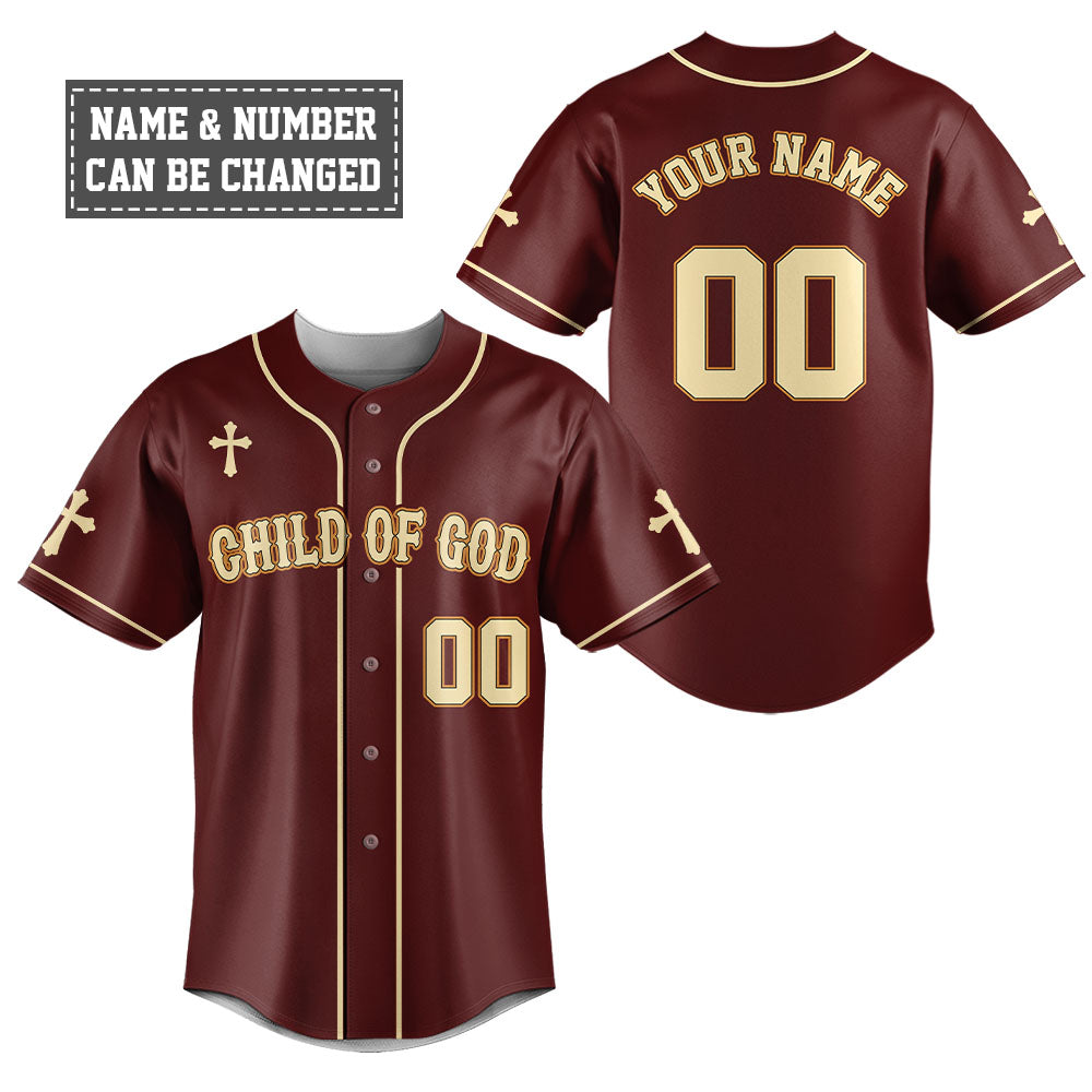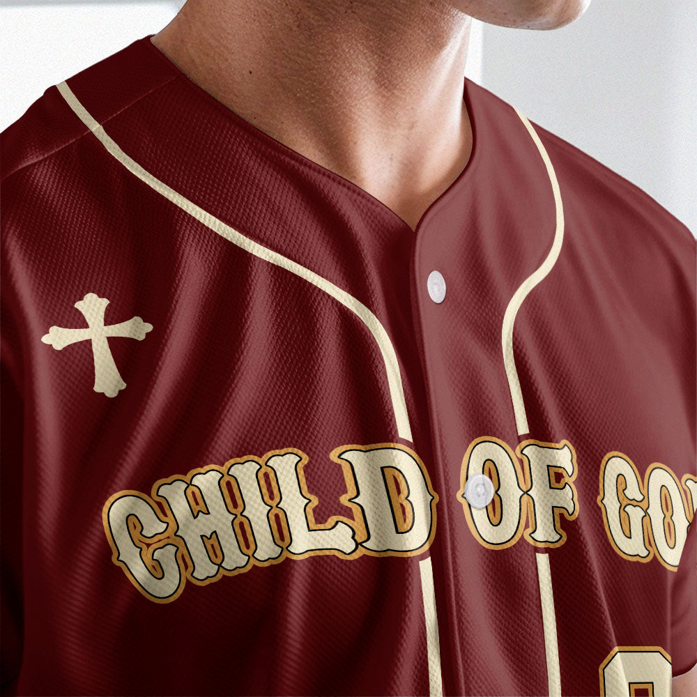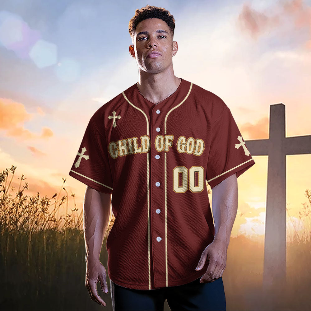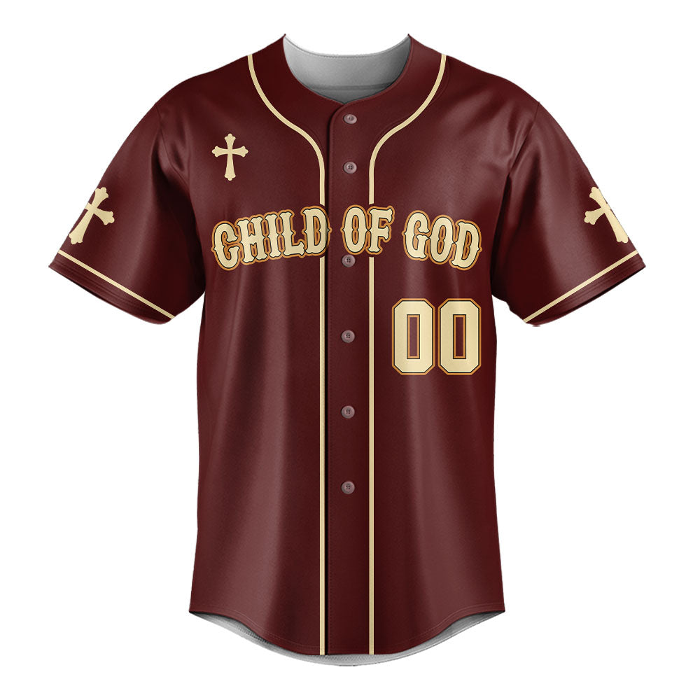 This deep maroon jersey features elegant gold accents and powerful cross motifs on each sleeve and the chest. The front boldly displays the declaration “CHILD OF GOD”, while the back is fully customizable with your name and number, turning this into a personal statement of faith.