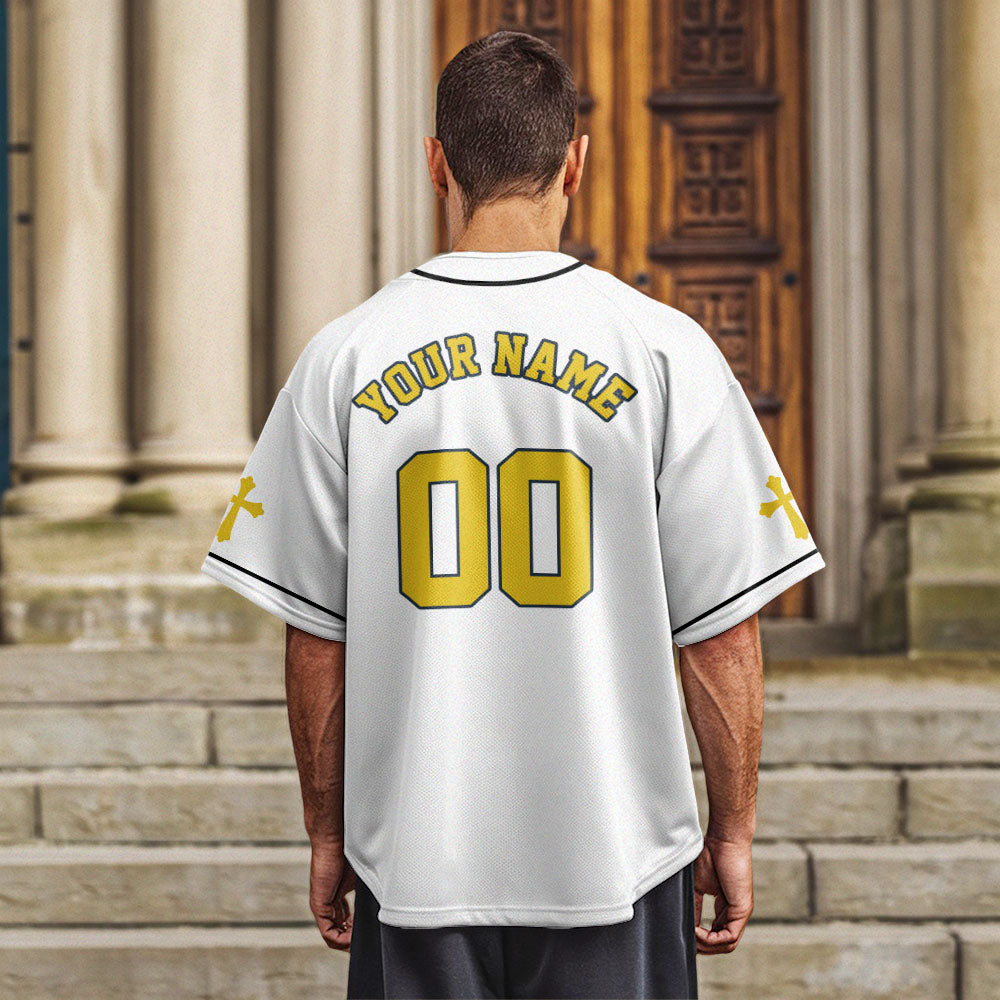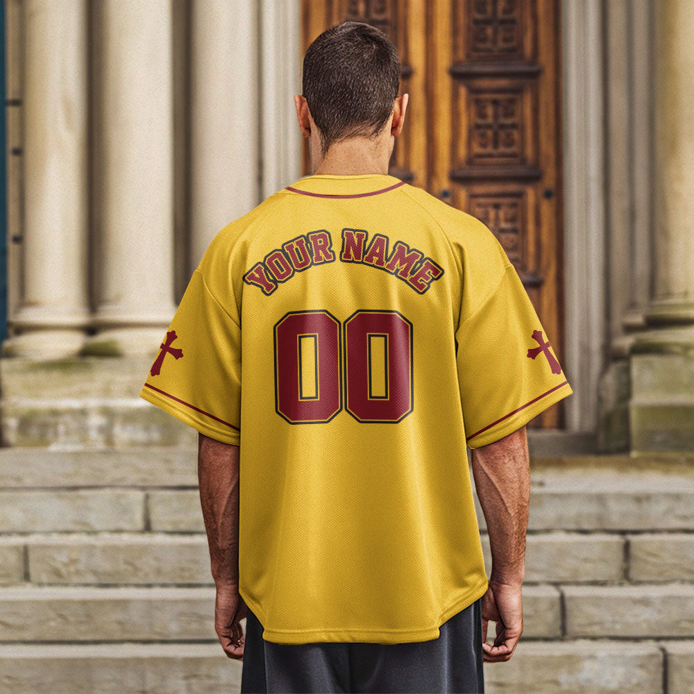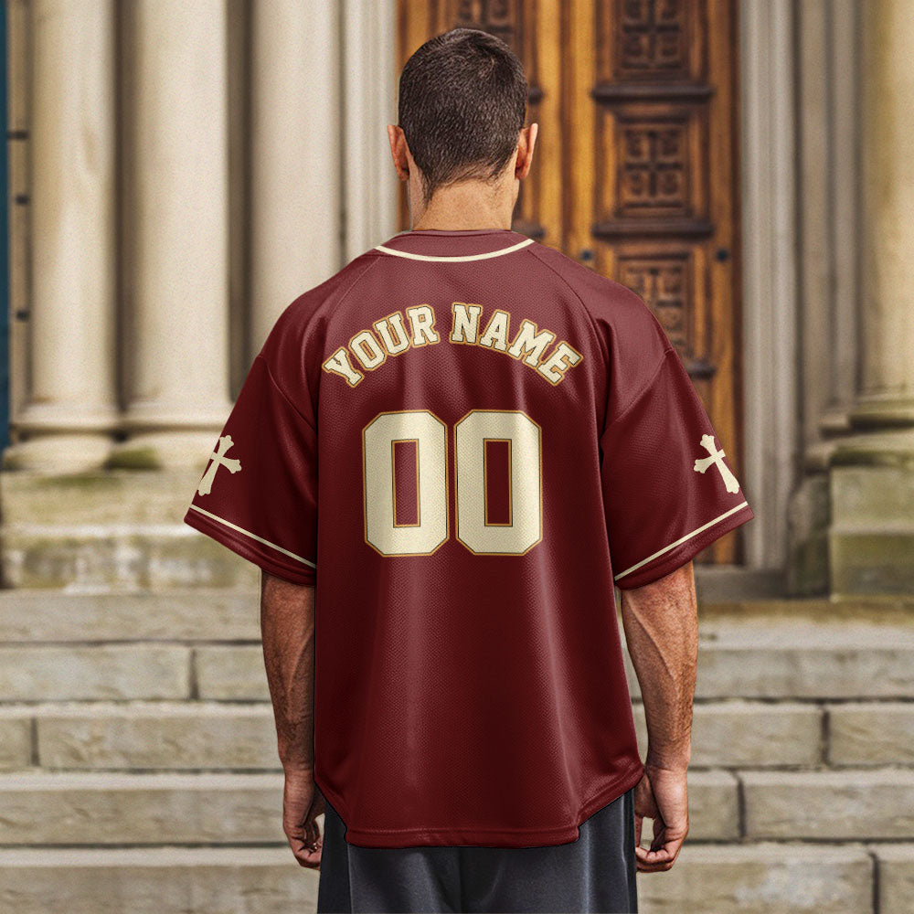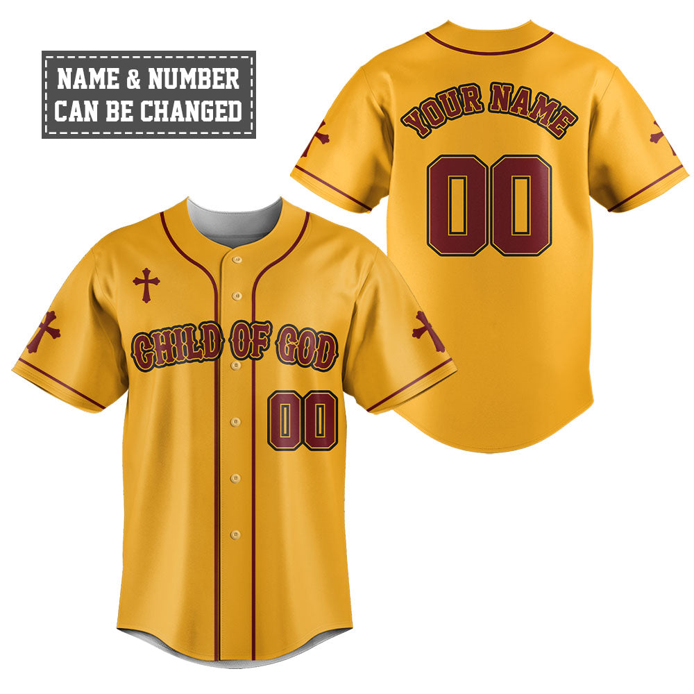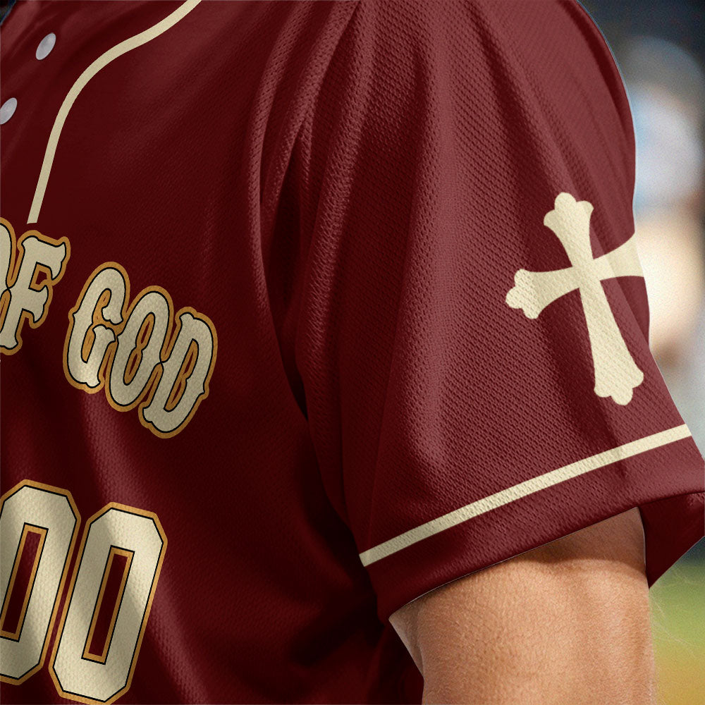 This deep maroon jersey features elegant gold accents and powerful cross motifs on each sleeve and the chest. The front boldly displays the declaration “CHILD OF GOD”, while the back is fully customizable with your name and number, turning this into a personal statement of faith.