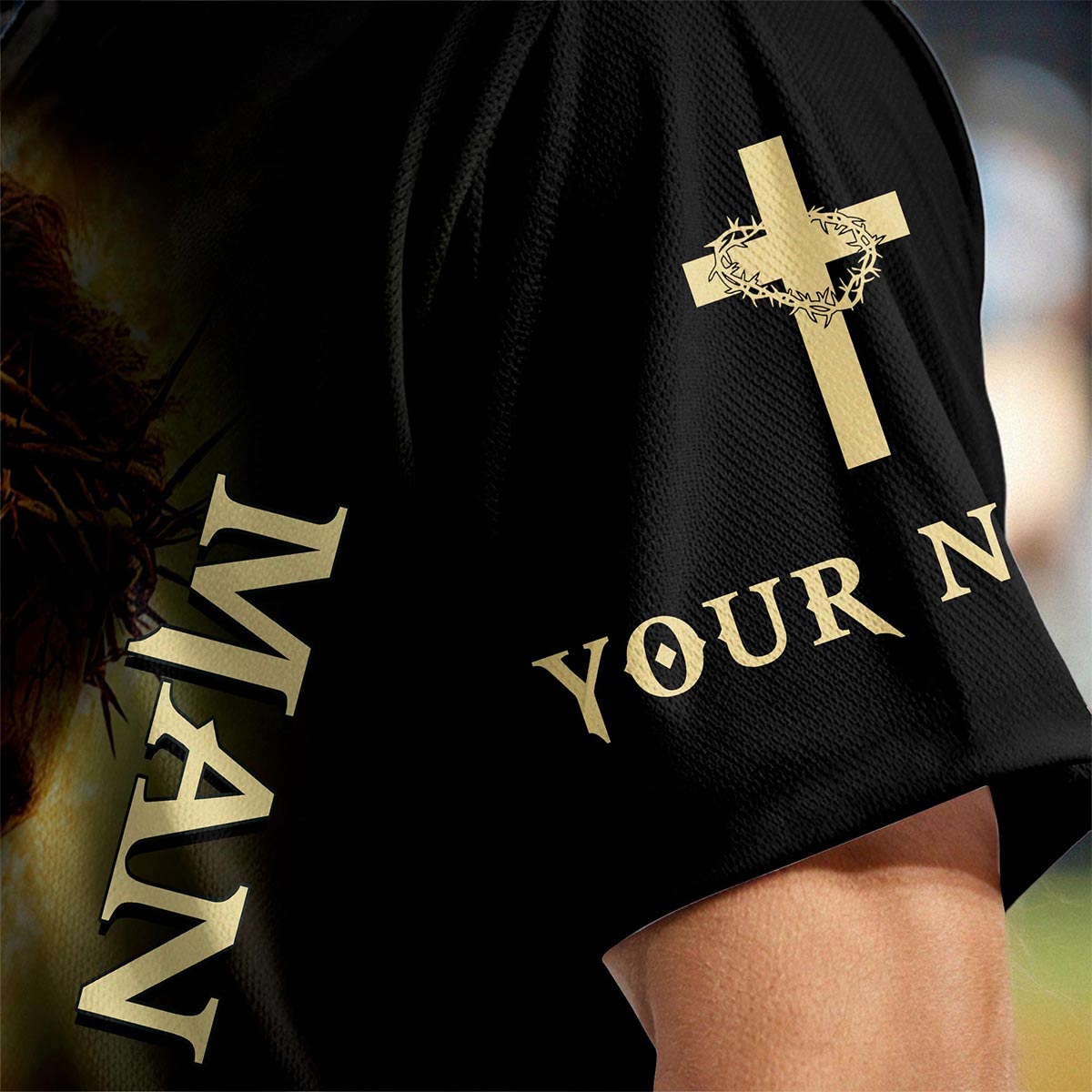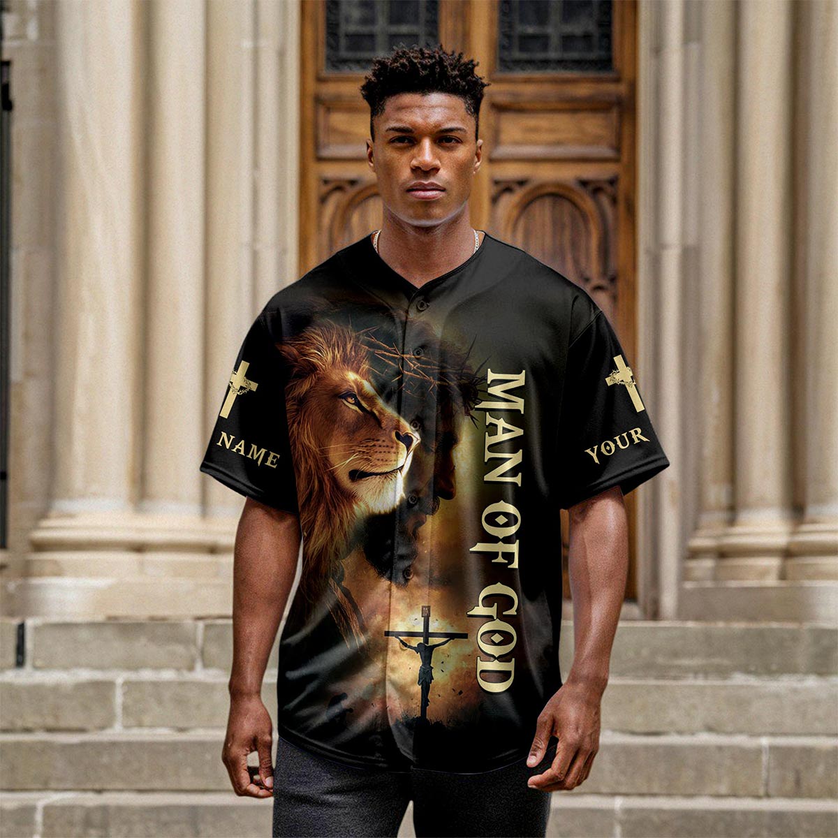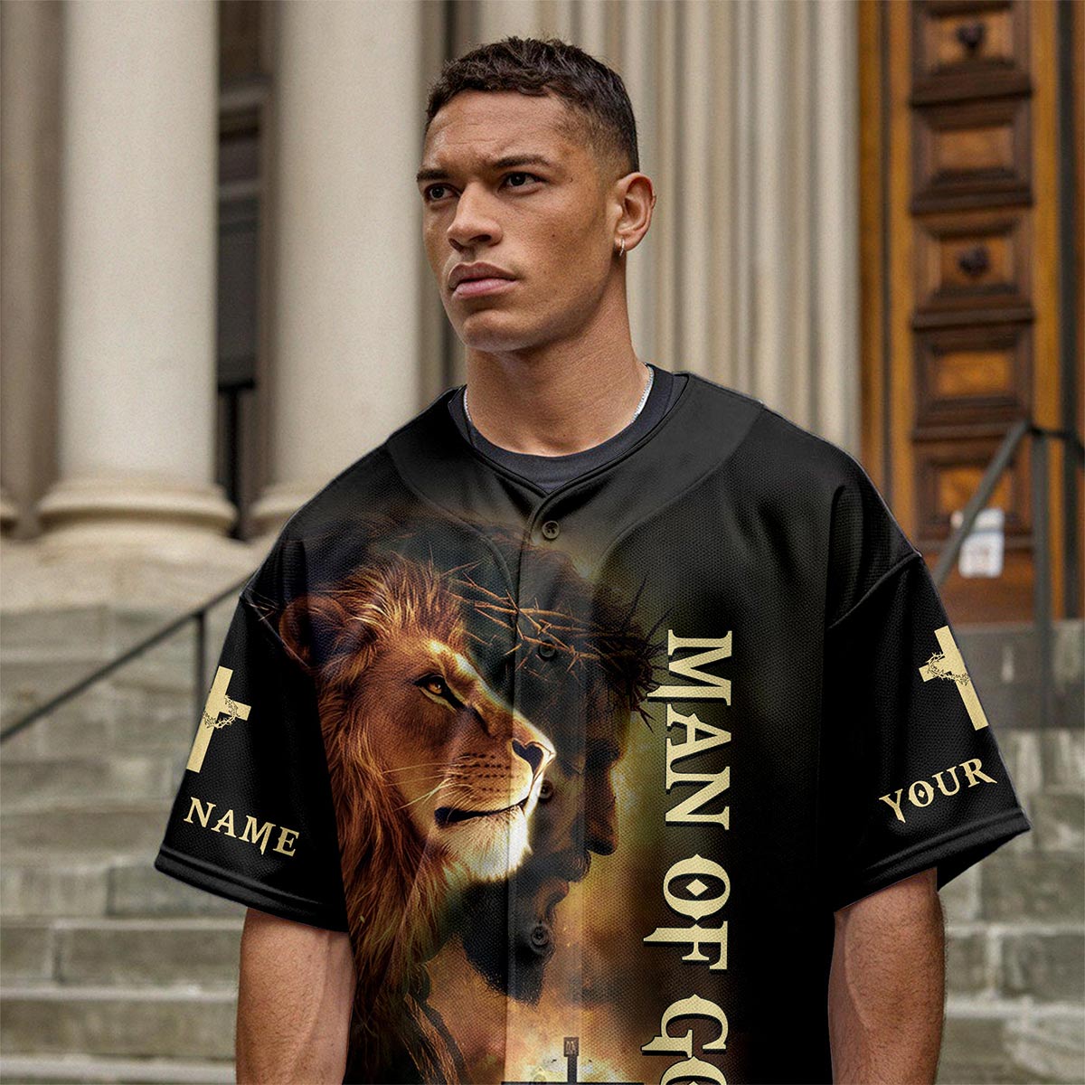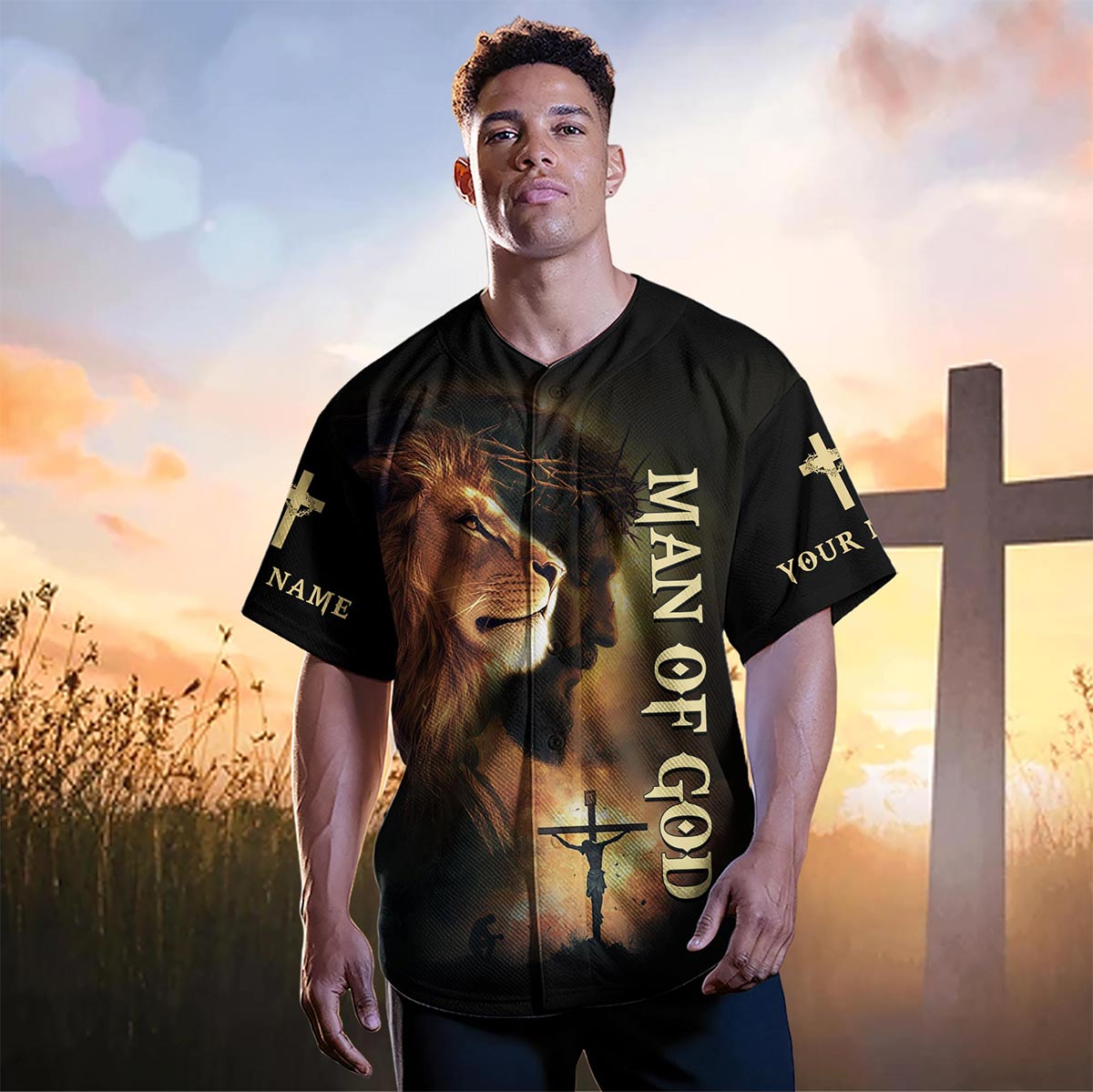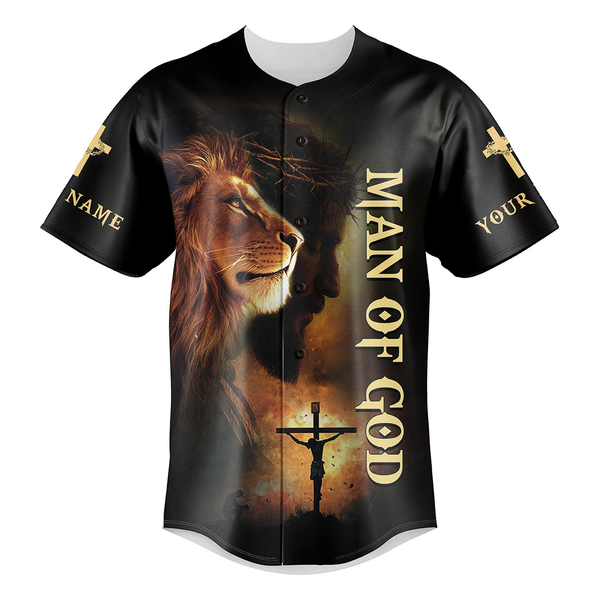 The front showcases a majestic lion alongside the crucified Christ and the title “Man of God.” Add your name to both sleeves to make it truly yours.