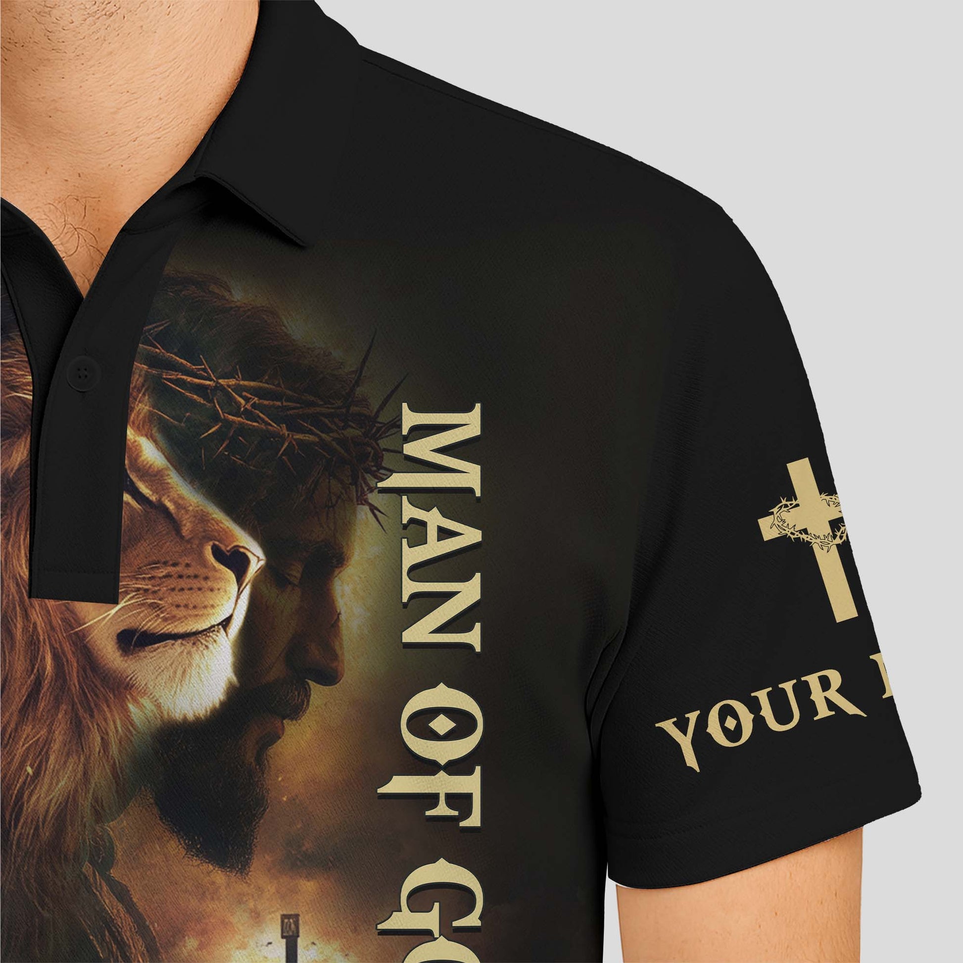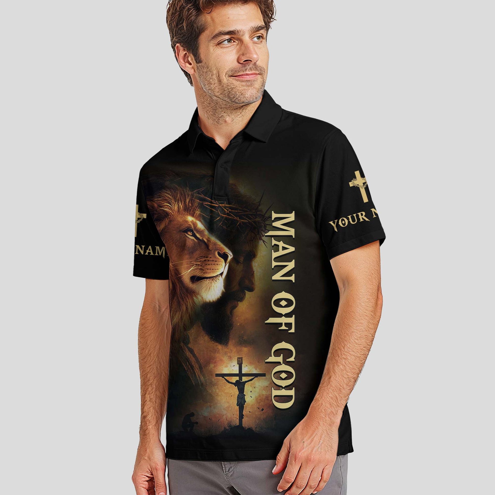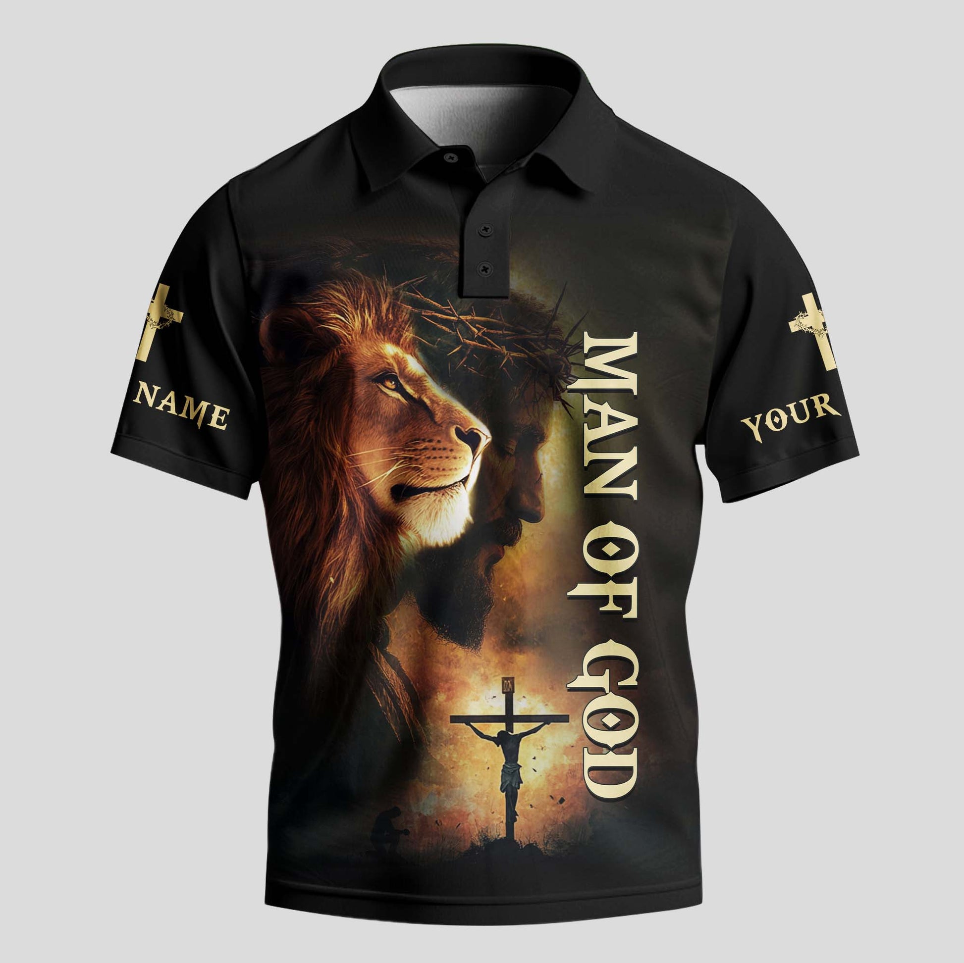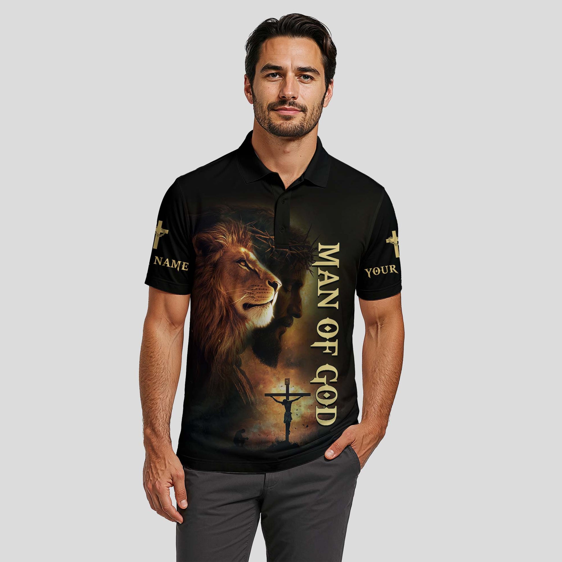 The front features a powerful fusion of the Lion of Judah and the face of Christ crowned with thorns, along with the title “Man of God” boldly printed down the side. On the back, a roaring lion surrounded by lightning thunders the message: