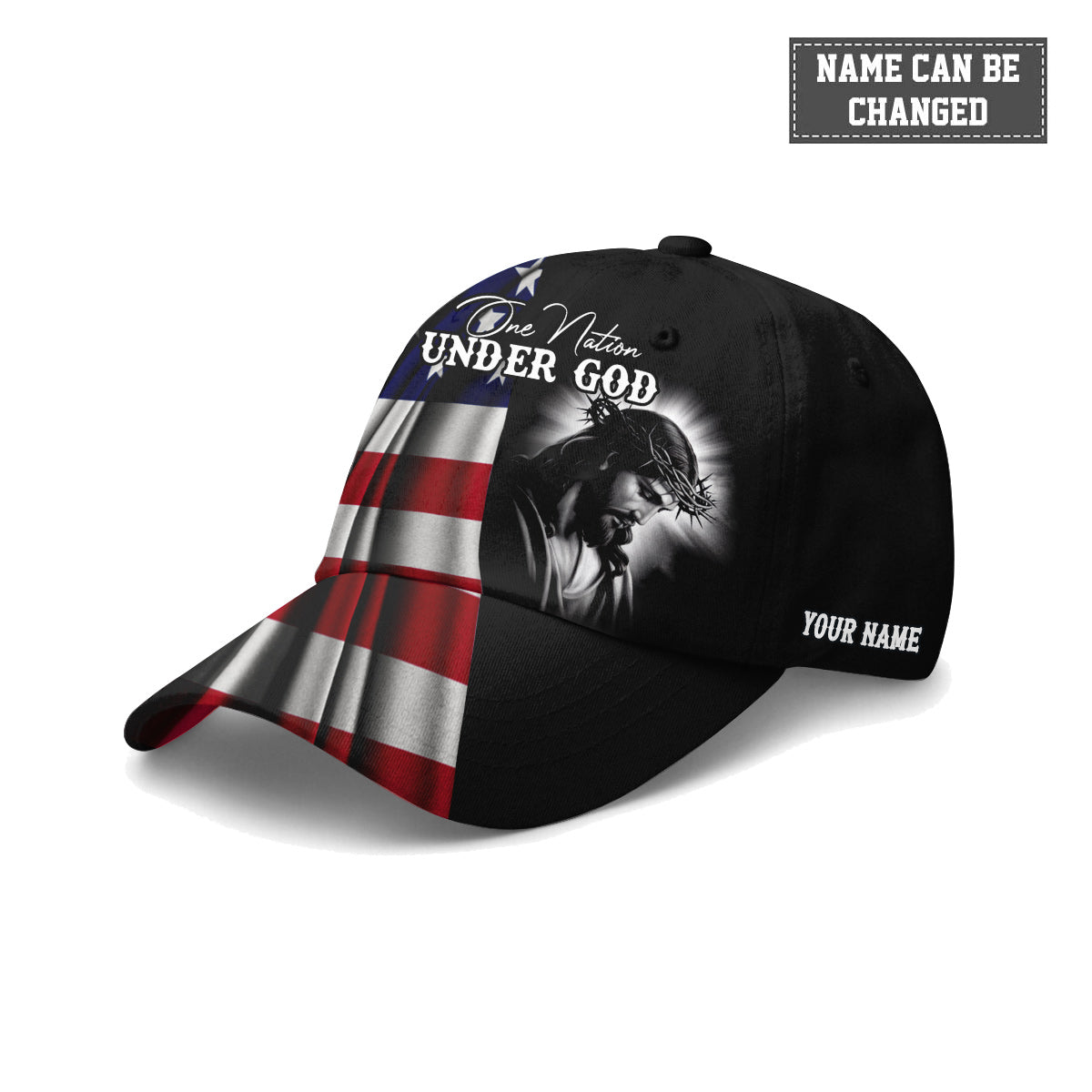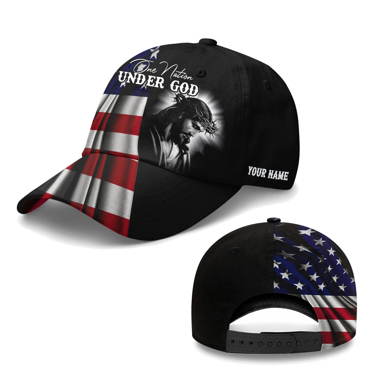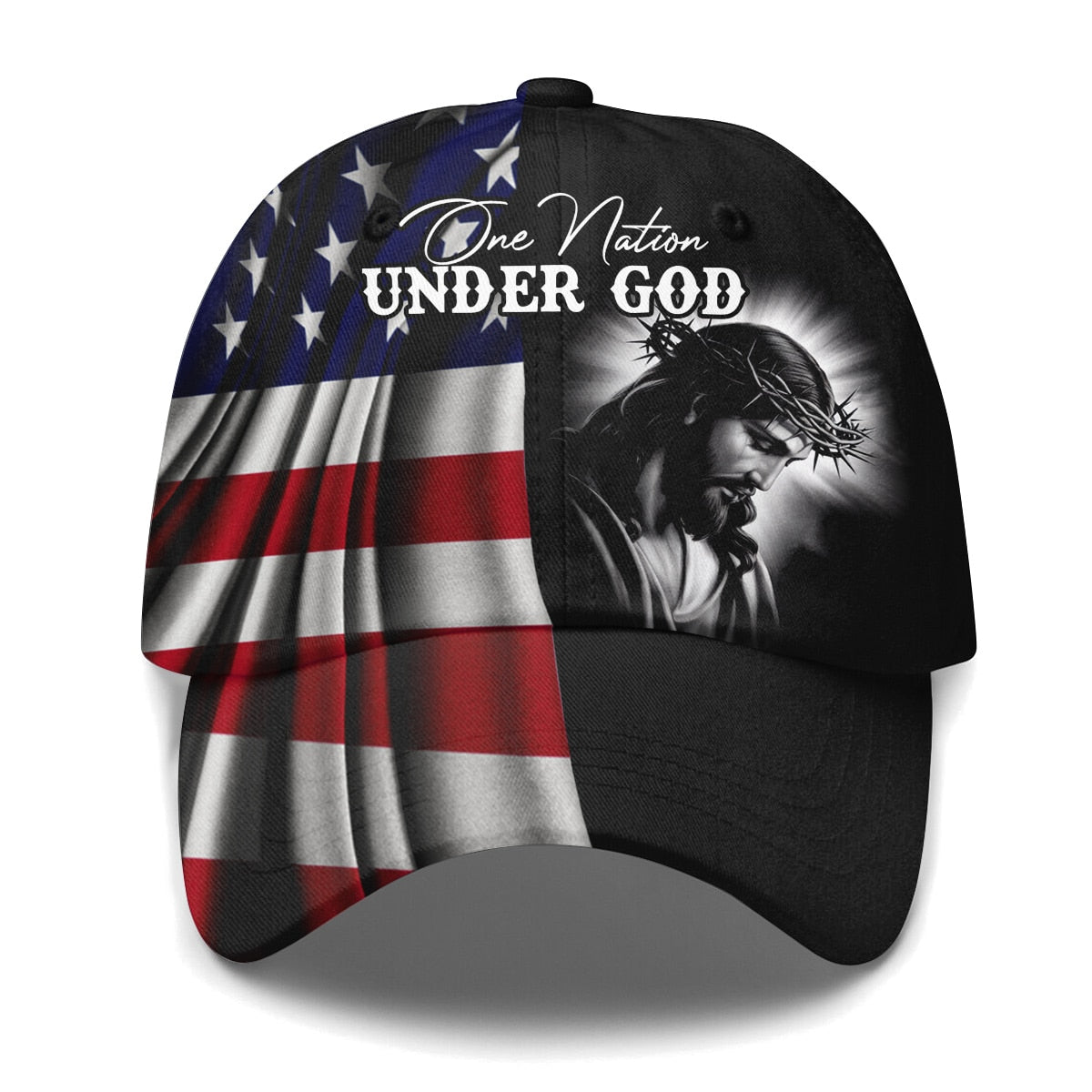 Show your faith and patriotism with the One Nation Under God Baseball Cap. This striking design features a solemn image of Jesus wearing a crown of thorns, symbolizing His sacrifice, alongside the American flag—representing unity, freedom, and devotion to God. The bold One Nation Under God text serves as a powerful reminder of faith in the nation.