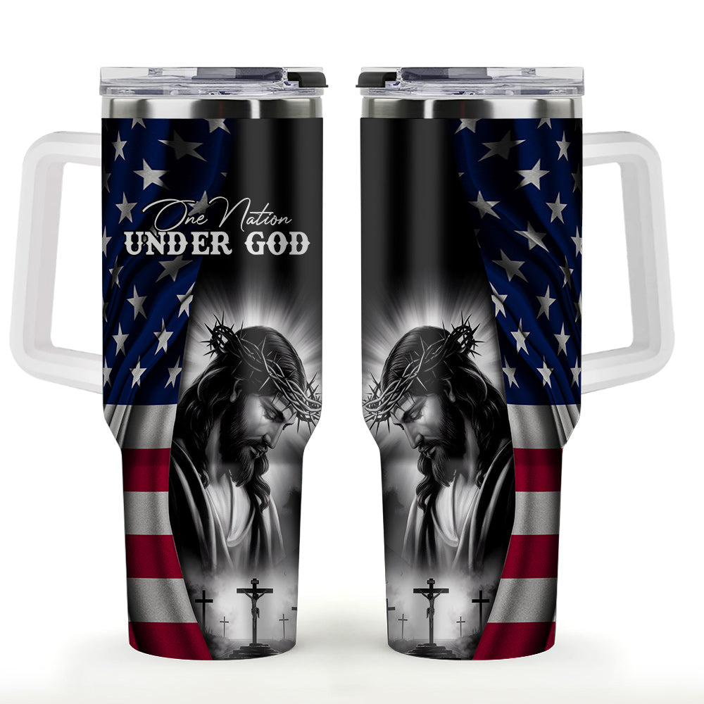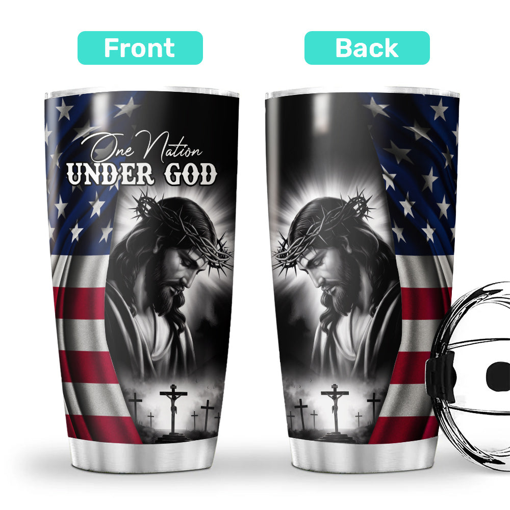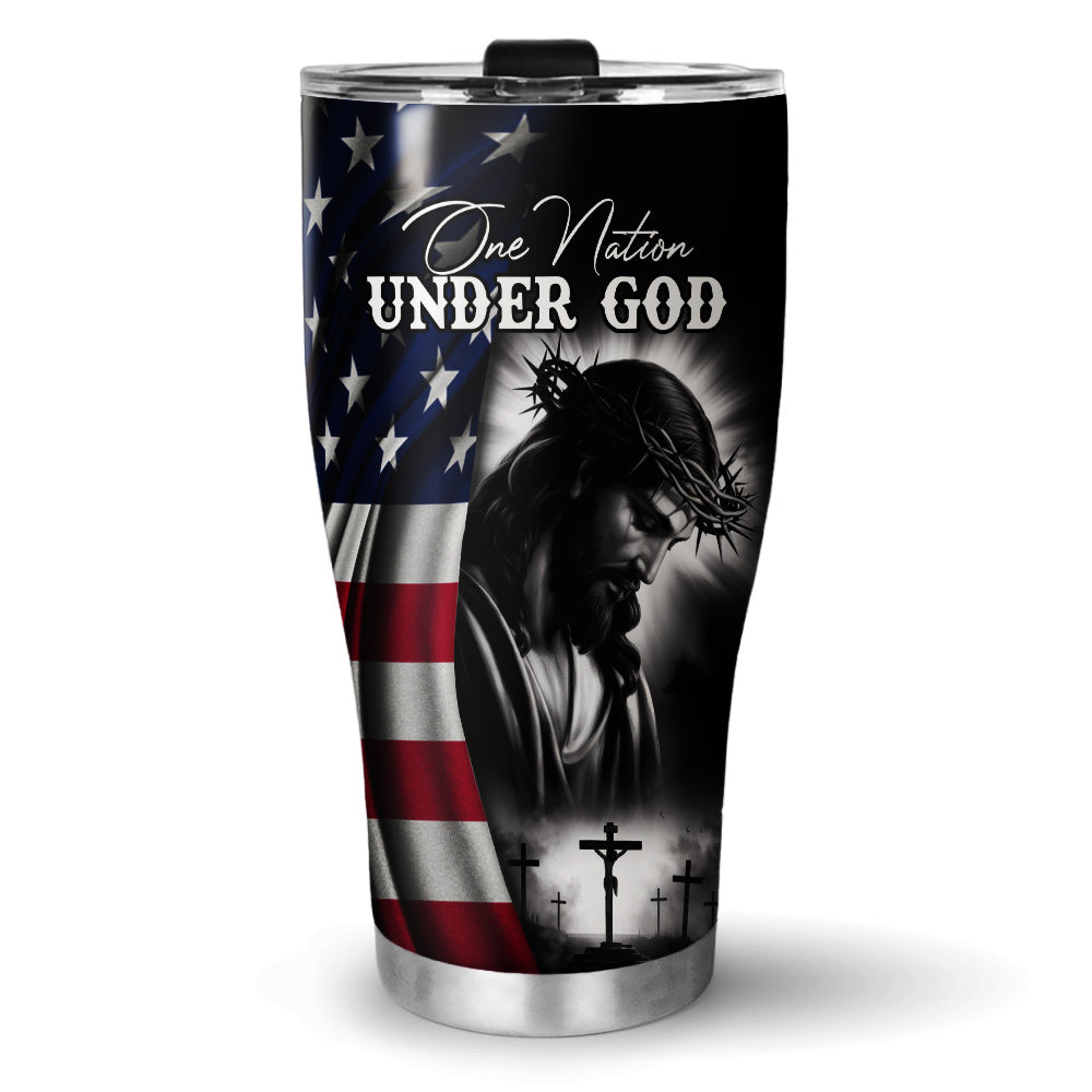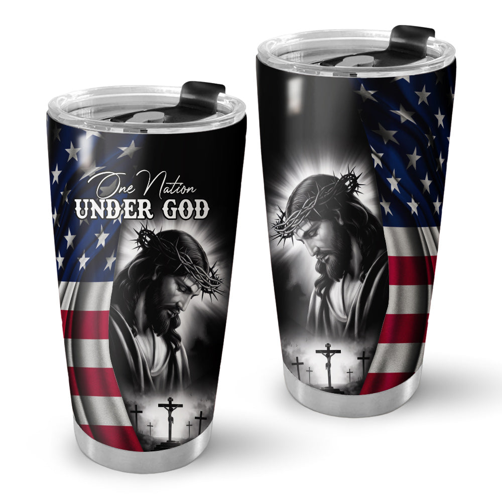 Show your faith and patriotism with the One Nation Under God Tumbler, featuring a powerful black-and-white depiction of Jesus wearing a crown of thorns, alongside the American flag and cross, symbolizing faith, sacrifice, and unity. The inspiring phrase "One Nation Under God" reminds us of our spiritual foundation and strength.