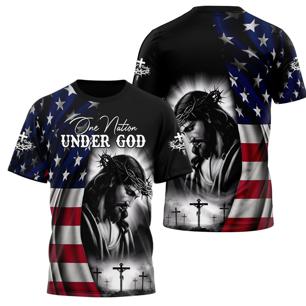 Celebrate your faith and patriotism with the One Nation Under God T-Shirt. Featuring a striking blend of the American flag and an artistic portrayal of Jesus Christ with a crown of thorns, this shirt is a powerful statement of devotion and national pride. The monochrome depiction of Christ, contrasted with the bold red, white, and blue, symbolizes unwavering faith and commitment to God.