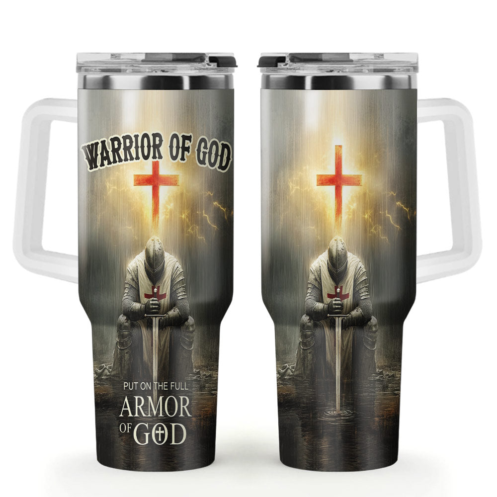 Embrace the strength of faith with the Put on the Full Armor of God Stainless Steel Tumbler, featuring a kneeling medieval knight, sword in hand, praying beneath a glowing red cross, symbolizing devotion, courage, and divine protection. The inspiring "Put on the Full Armor of God" message reminds you to stand firm in faith every day.