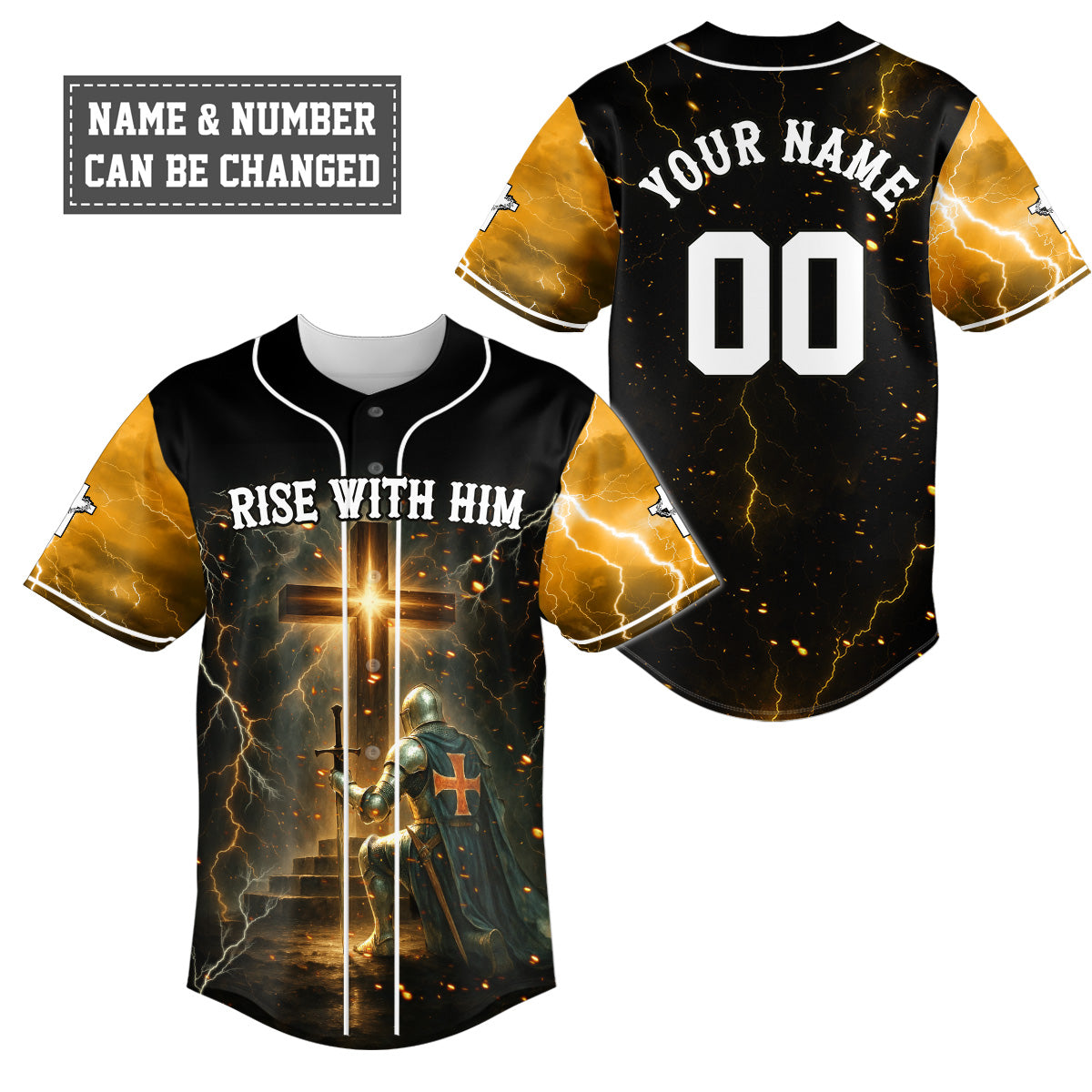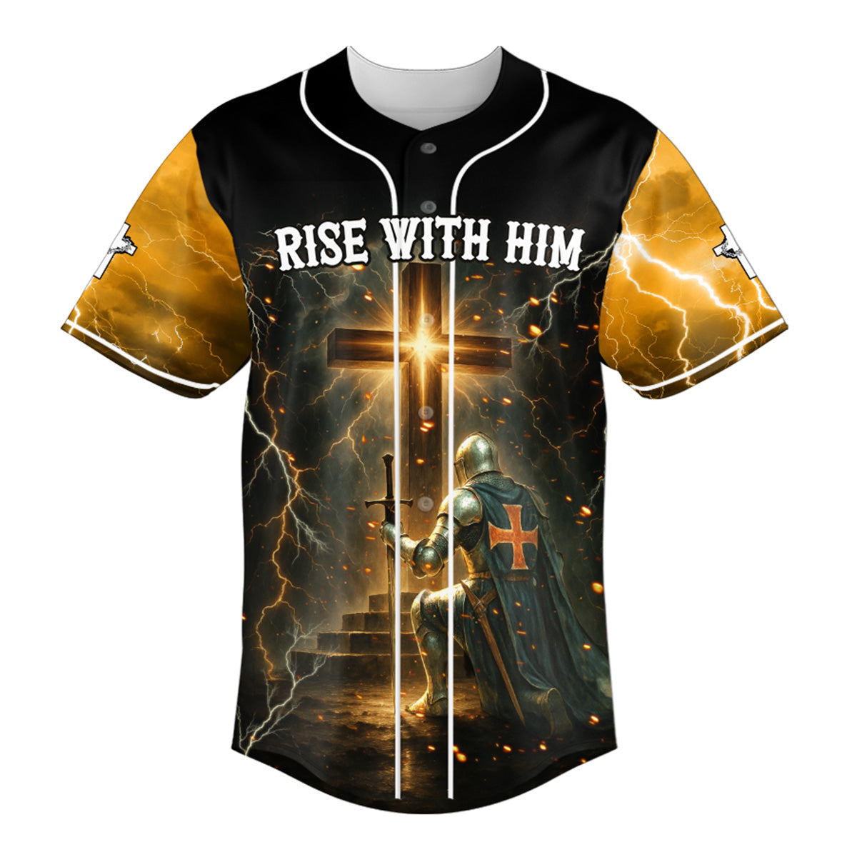 This epic design features a kneeling knight facing the radiant cross, surrounded by golden lightning and divine fire. It’s a tribute to those who fight spiritual battles in prayer and rise victorious in the name of Jesus. The bold phrase “RISE WITH HIM” proclaims your resurrection identity, while crosses on the sleeves remind you of the power that raised the Savior.