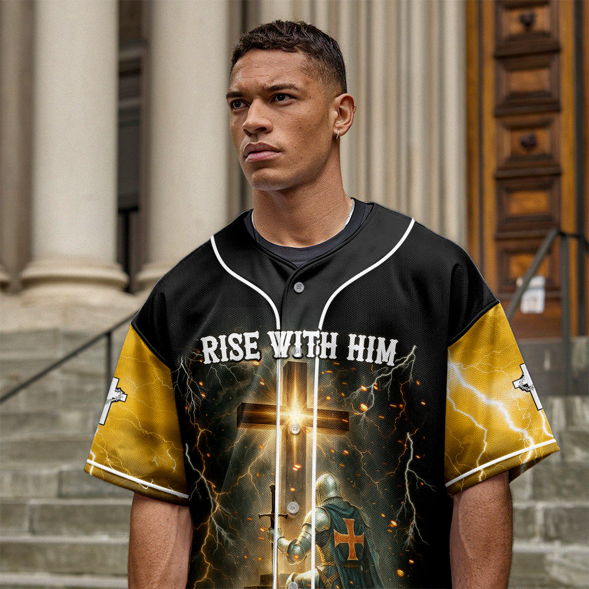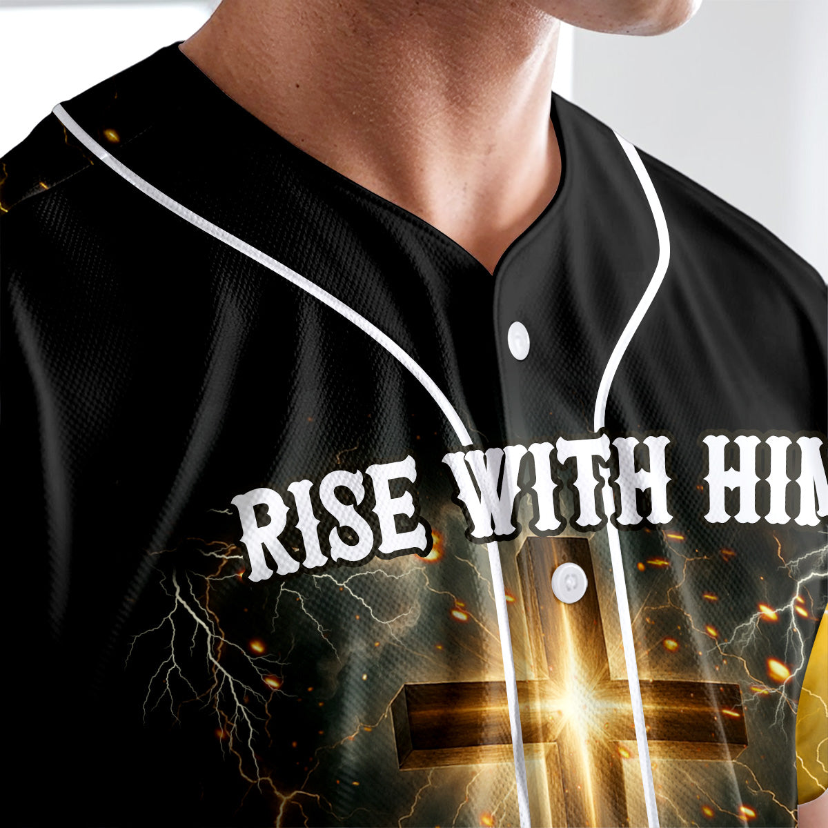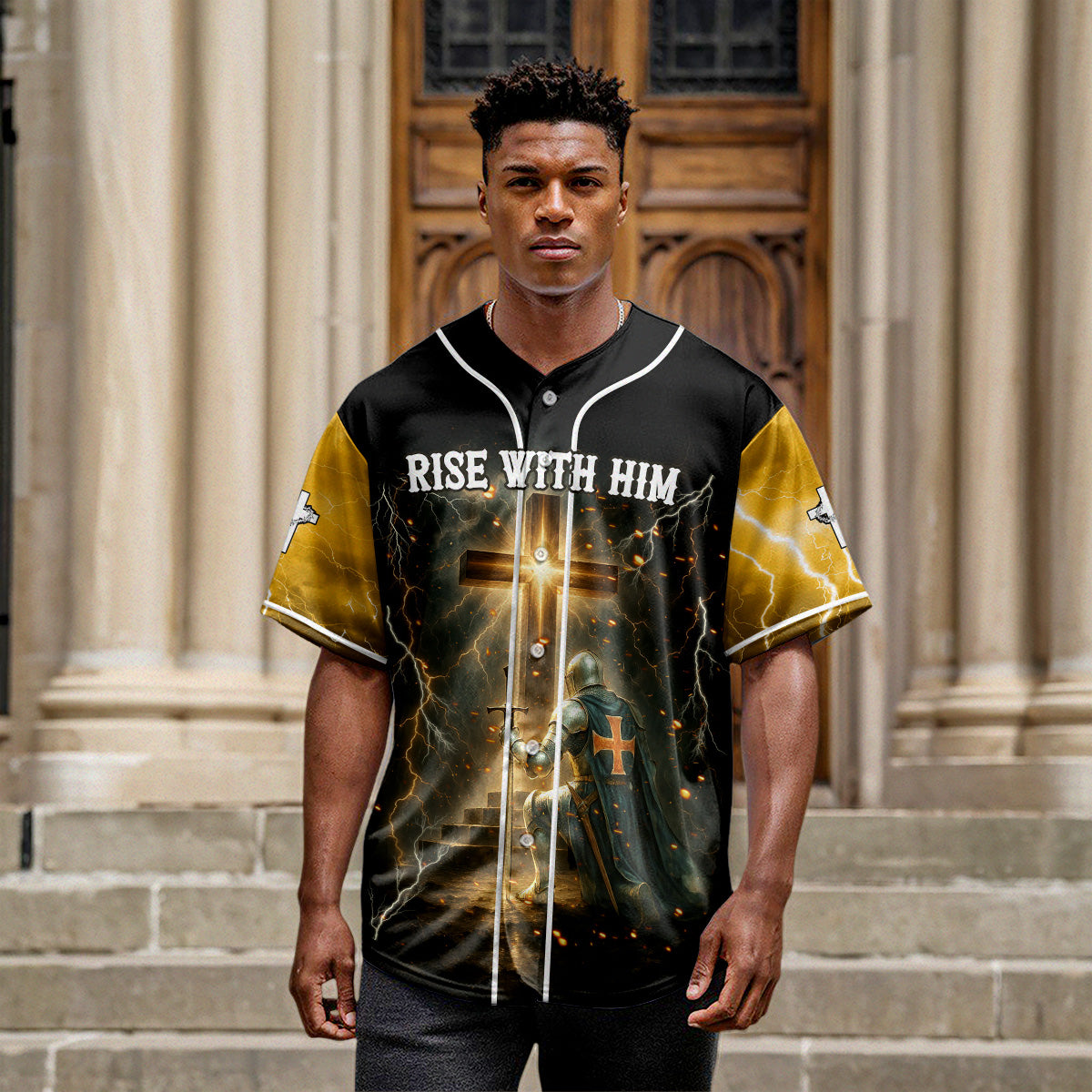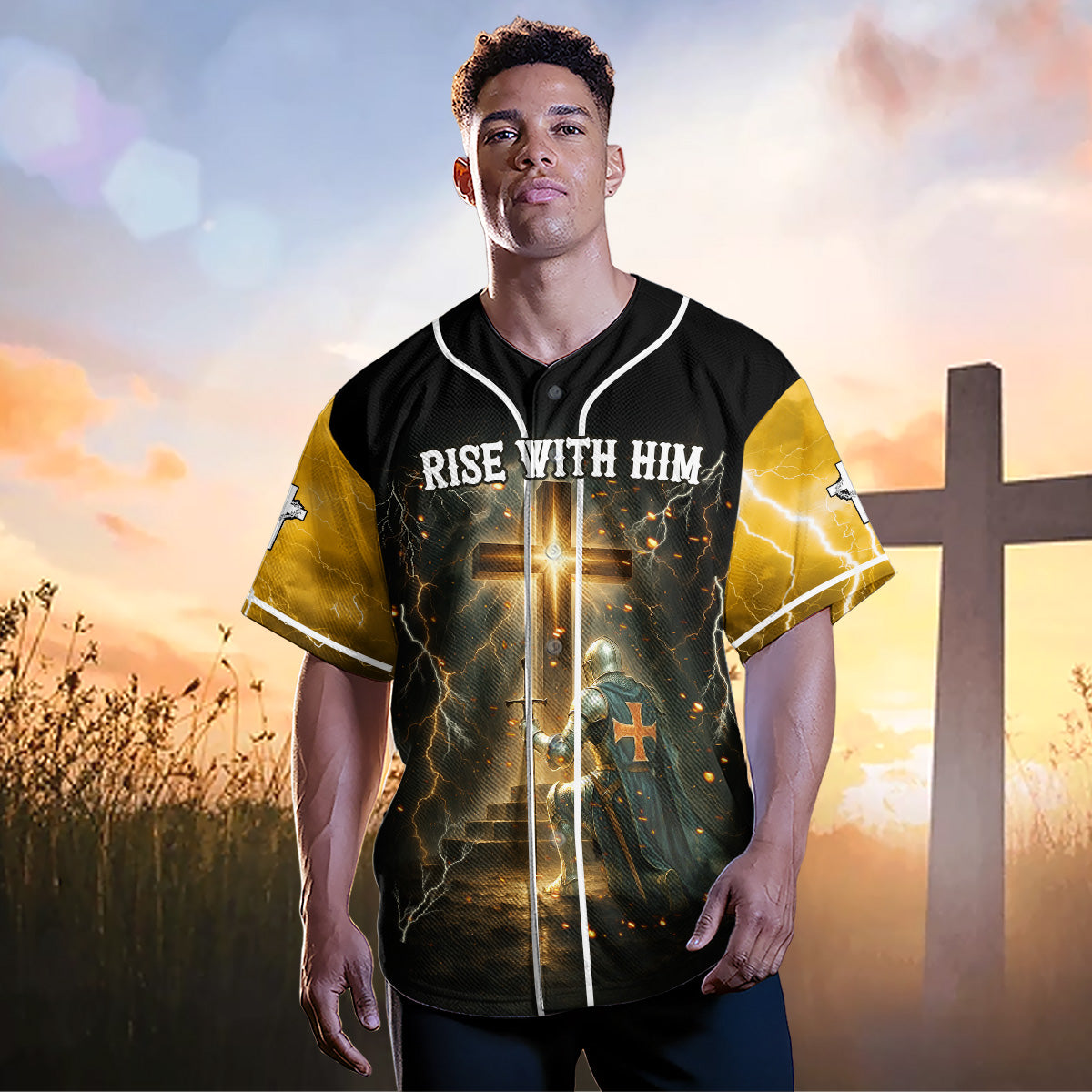 Answer the call of resurrection power with the “Rise With Him” Baseball Jersey — designed for men who live with purpose, kneel in surrender, and rise in strength through Christ.