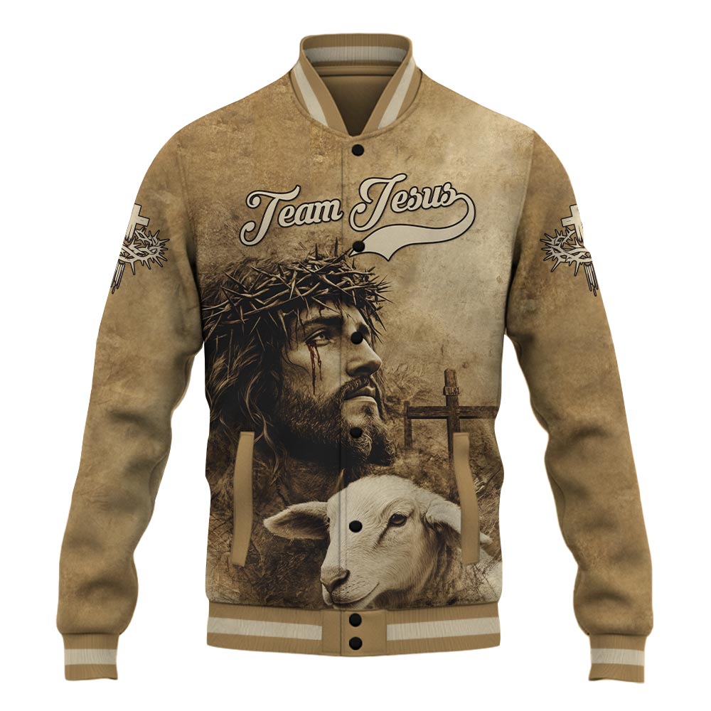 Declare your faith boldly with the Team Jesus Good Shepherd Baseball Jacket, a powerful symbol of devotion and sacrifice. Featuring a detailed sepia-toned design of Jesus wearing the crown of thorns alongside a gentle lamb, this jacket represents redemption, grace, and unwavering belief. The "Team Jesus" message is a declaration of loyalty to Christ and His eternal love.