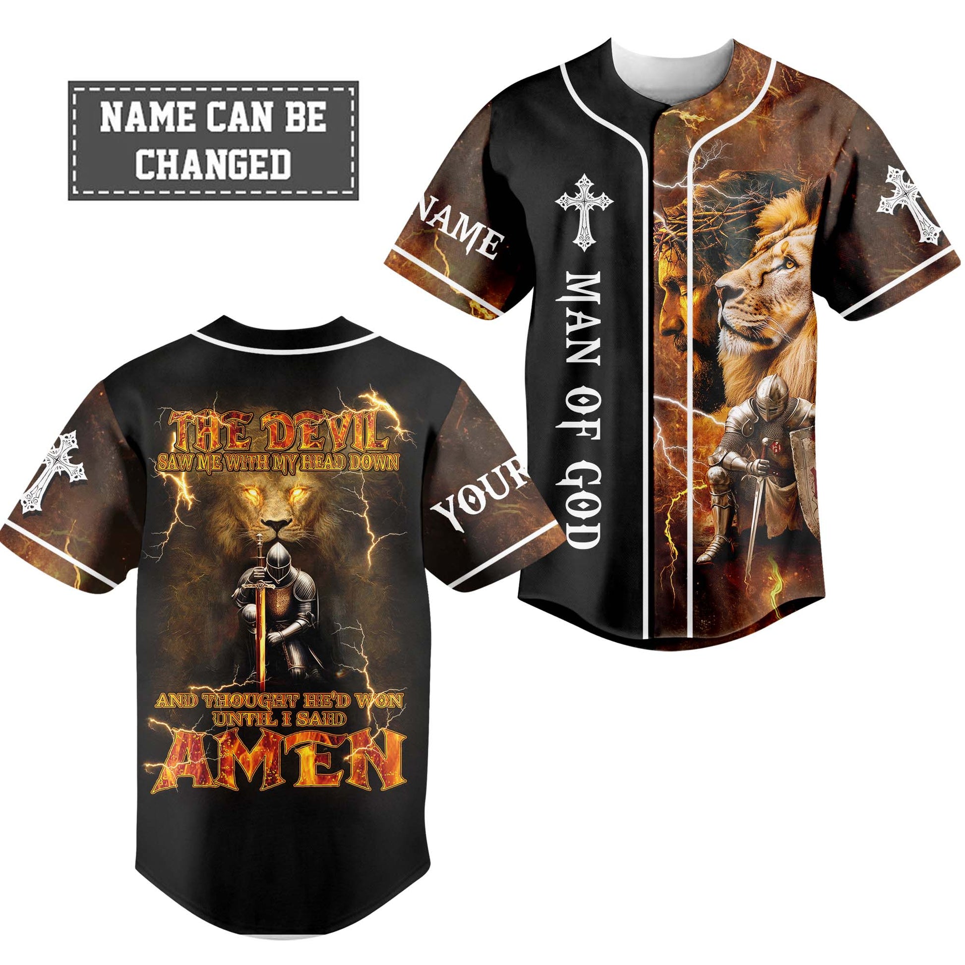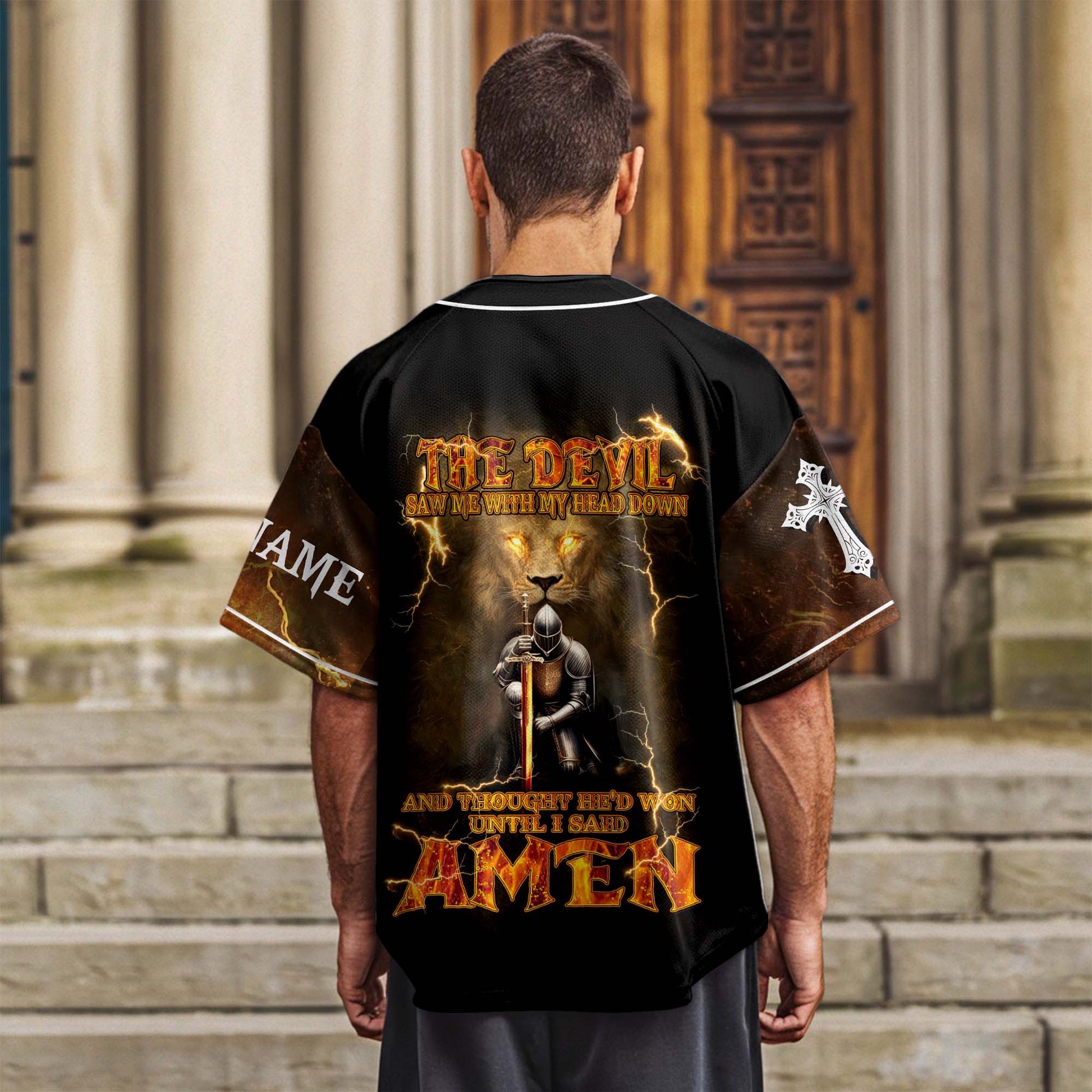 Stand firm in your faith and declare your victory with the bold “The Devil Saw Me With My Head Down” Custom Baseball Jersey — made for warriors of God who never back down.