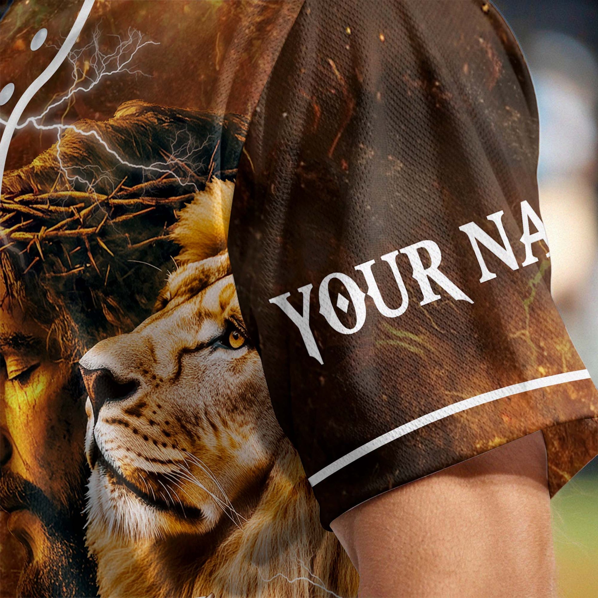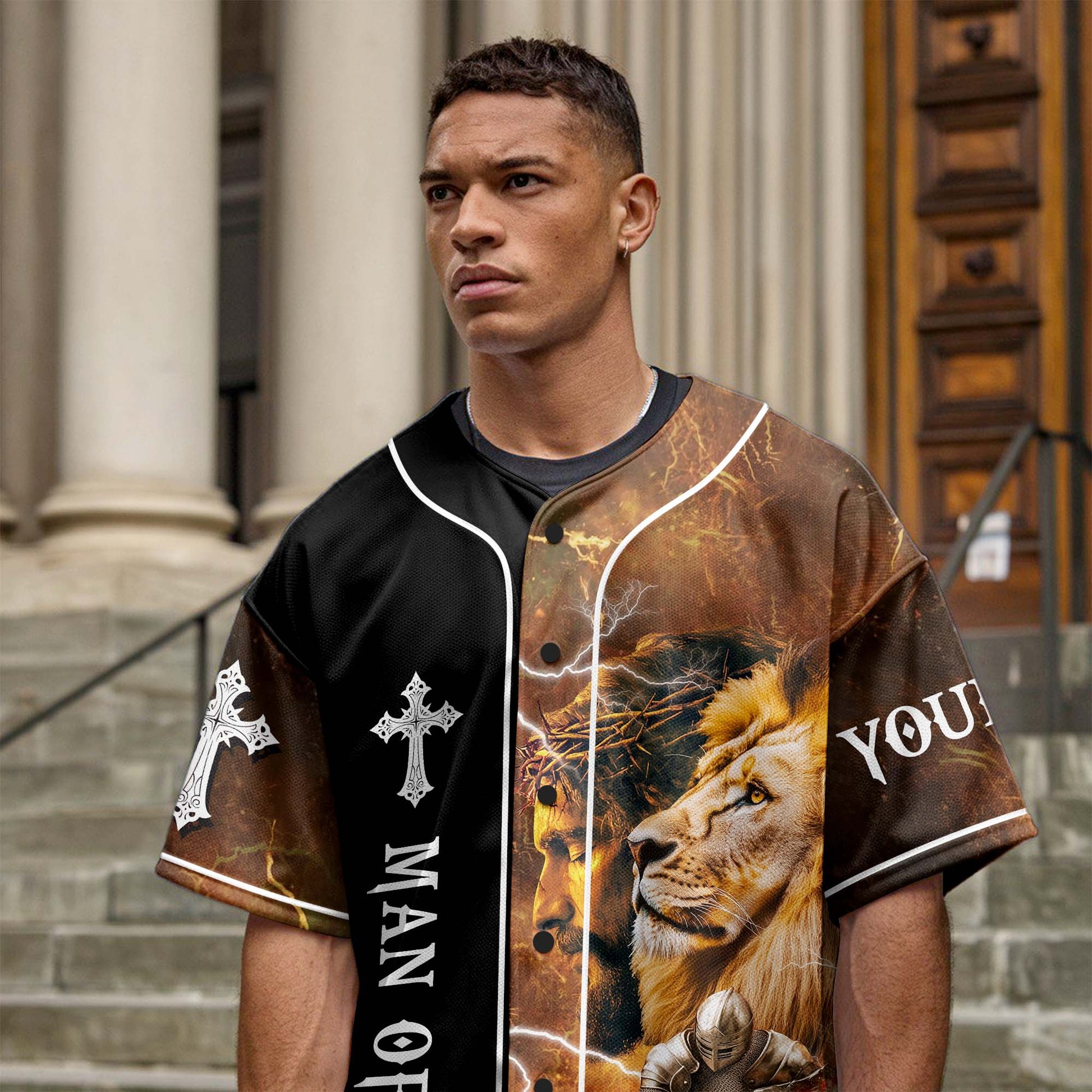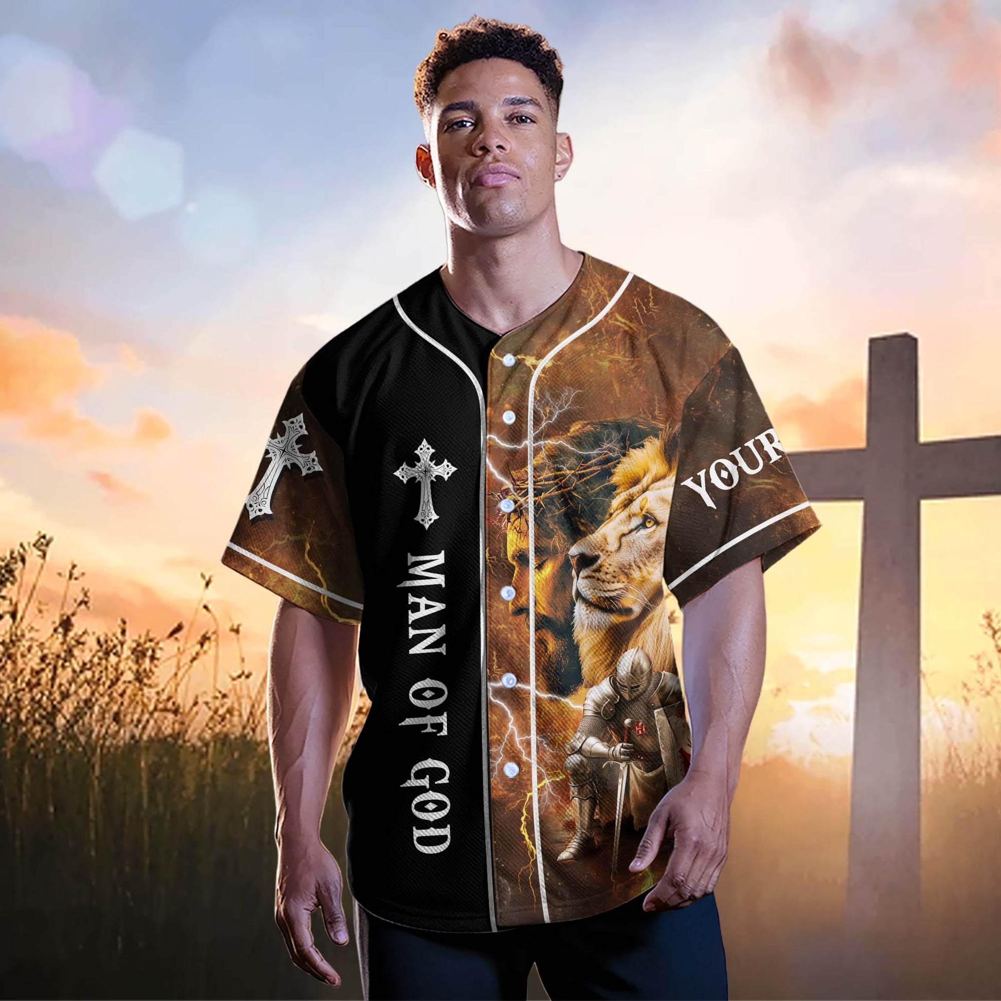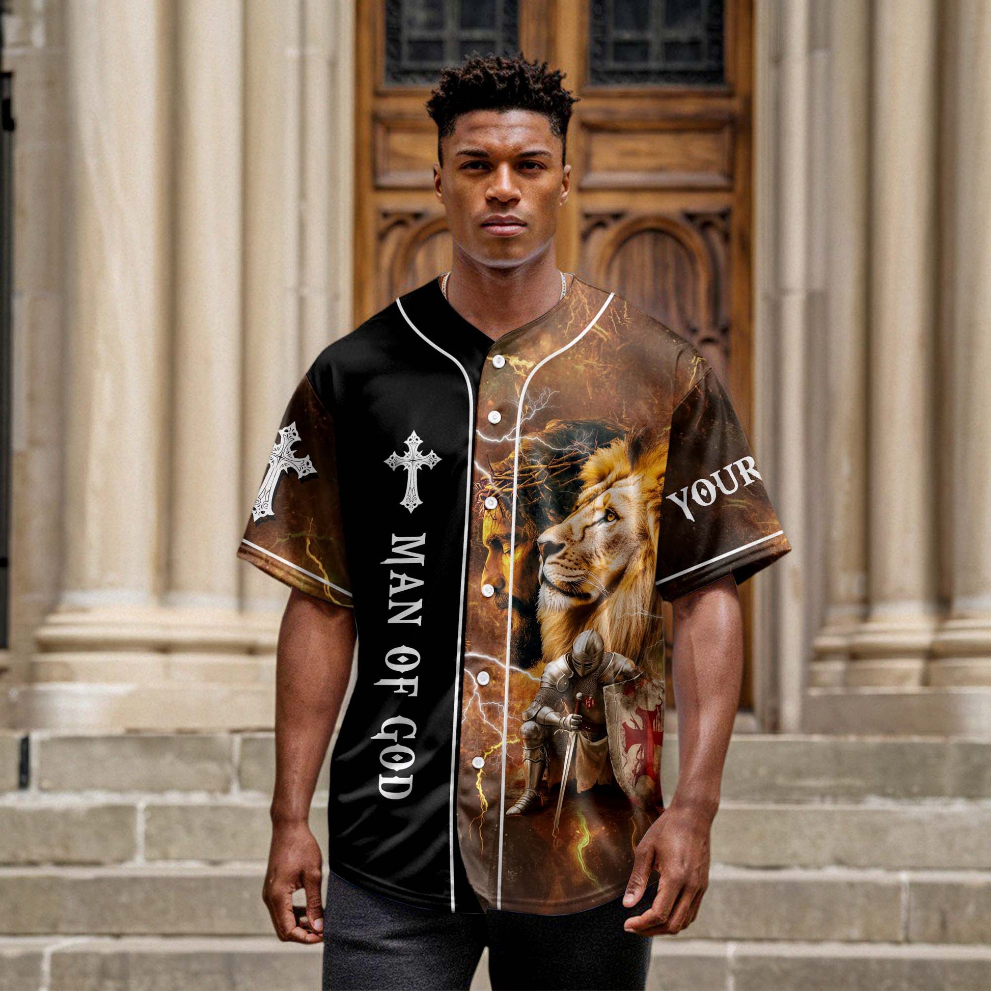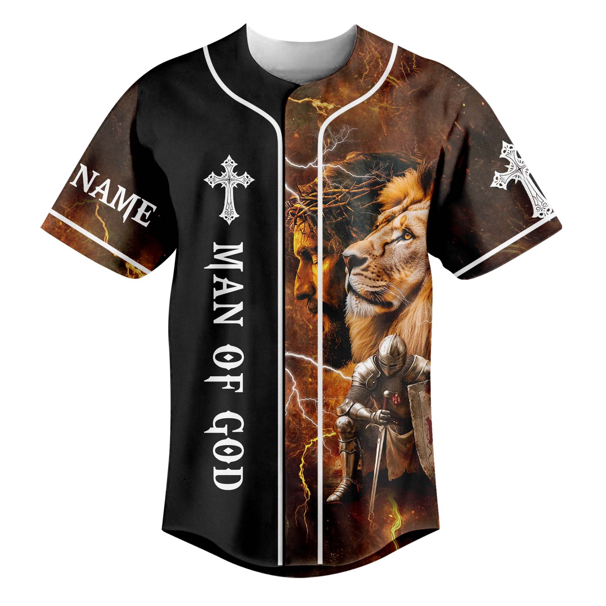 The front showcases a stunning image of Jesus, a lion, and a knight, symbolizing strength, sacrifice, and divine courage. The phrase “Man of God” runs down the front, and your custom name can be added to both sleeves for a personal touch.