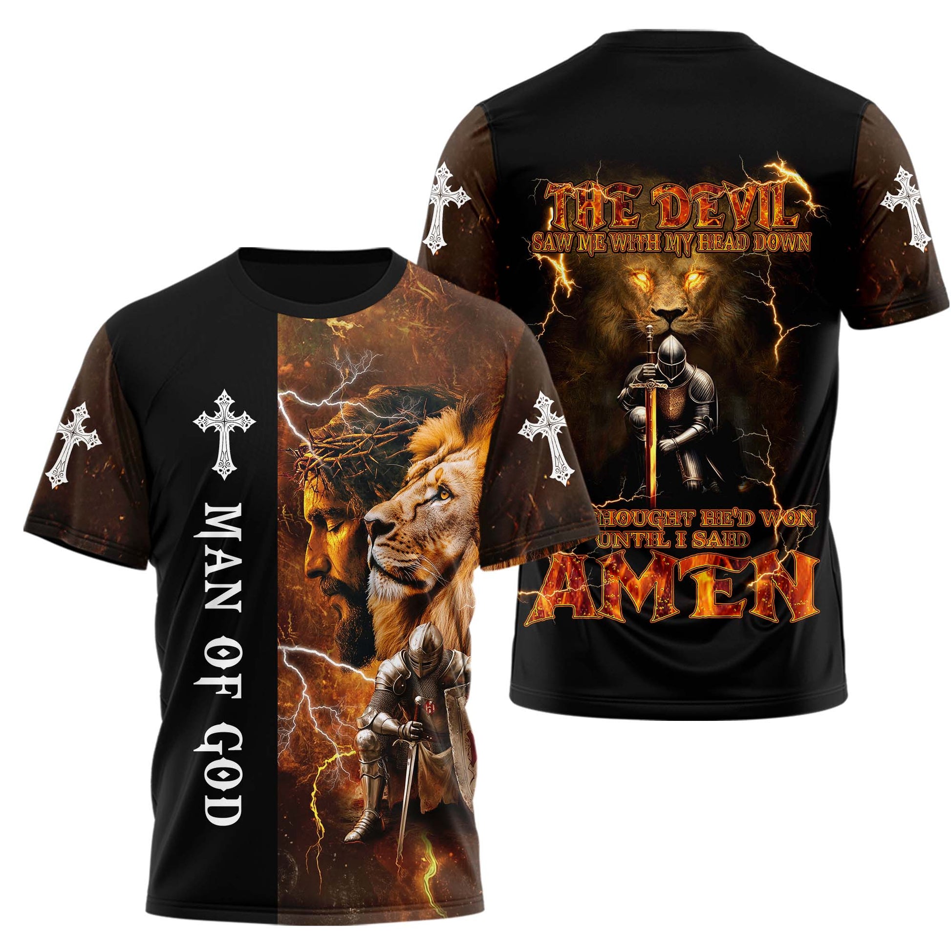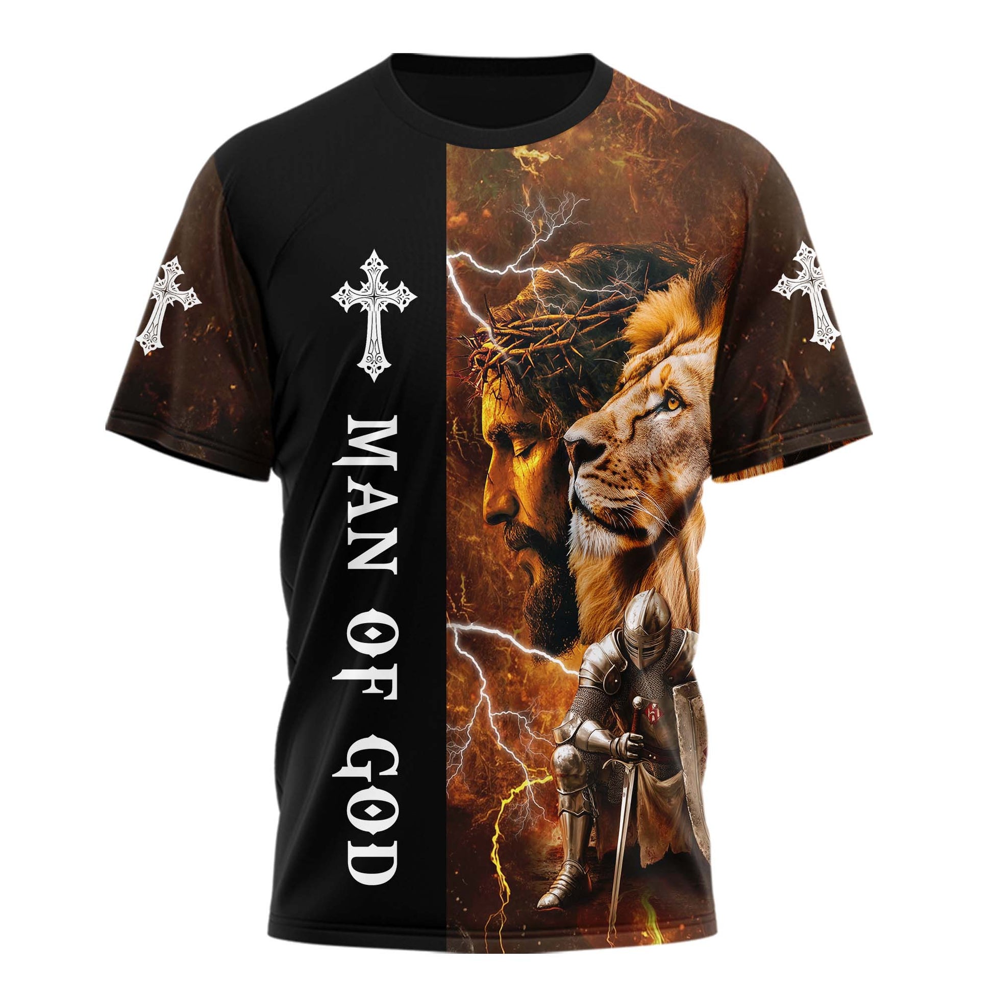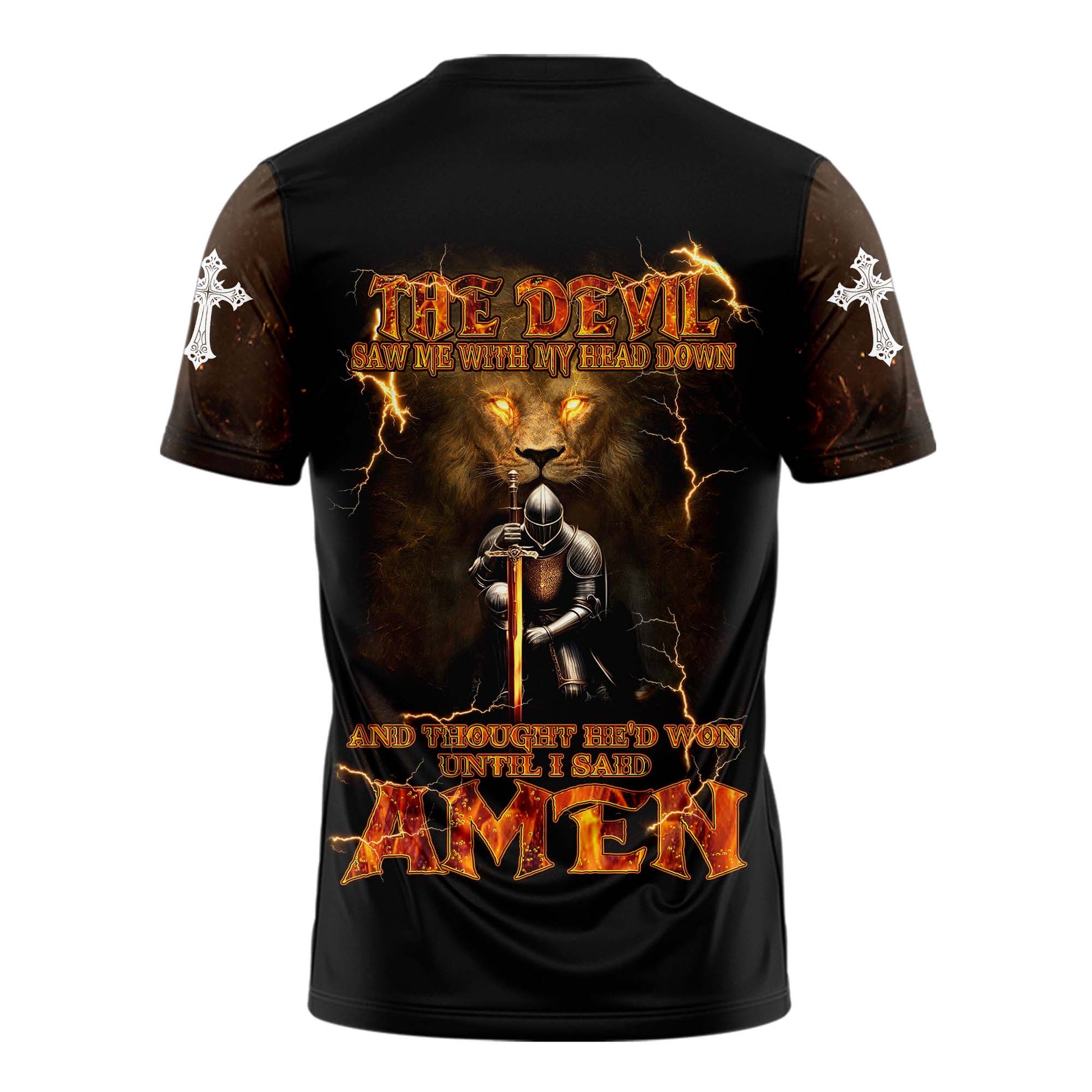 Featuring a powerful graphic of a kneeling knight, a roaring lion, and blazing lightning, this shirt declares your victory in Christ. The message on the back says it all:
