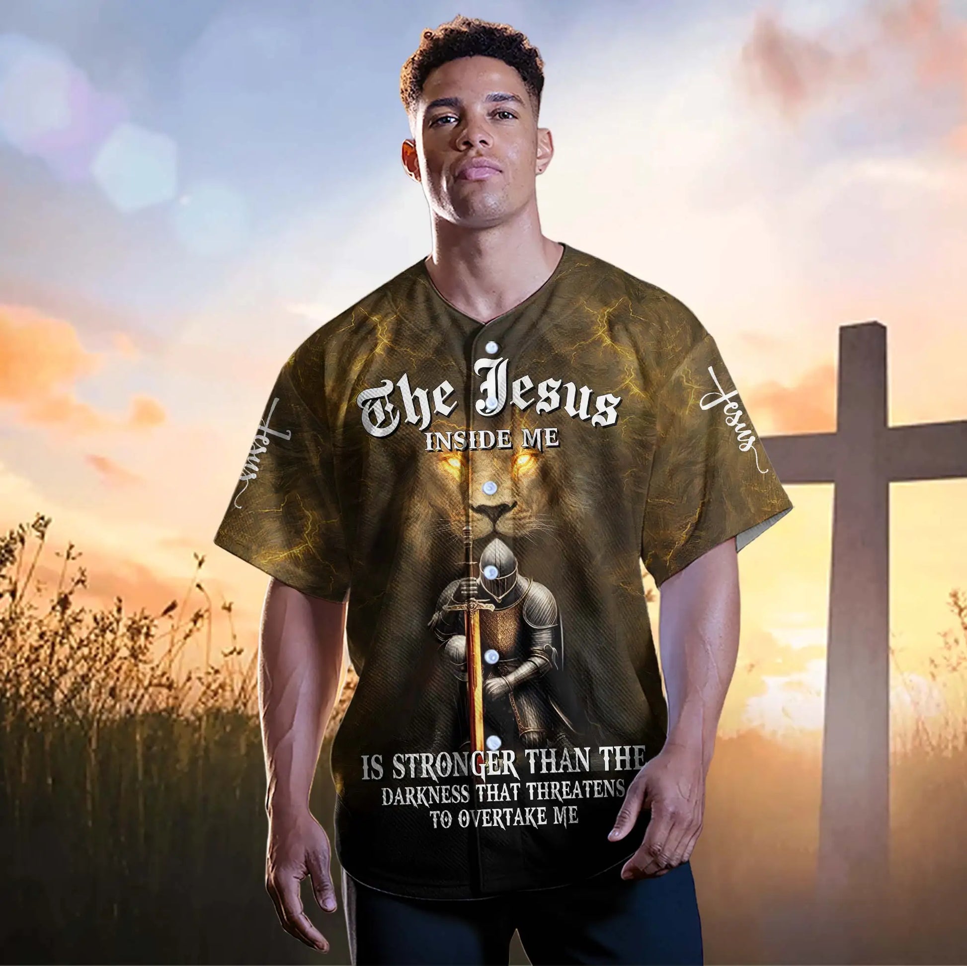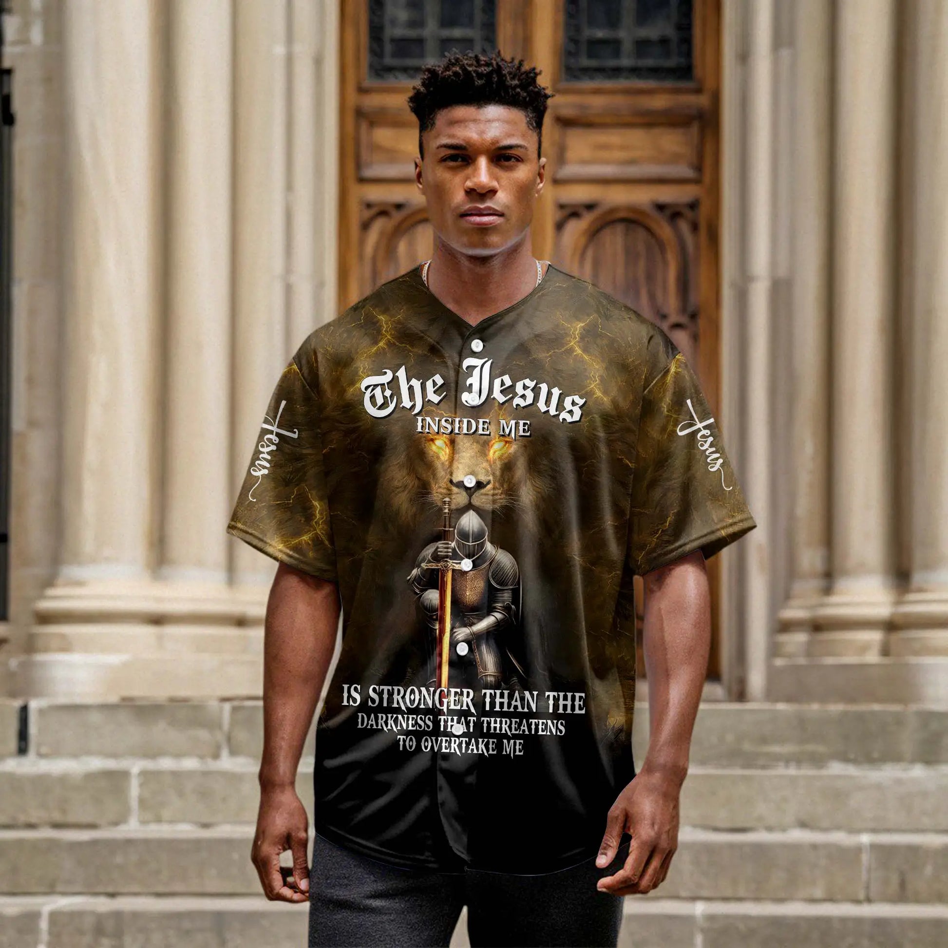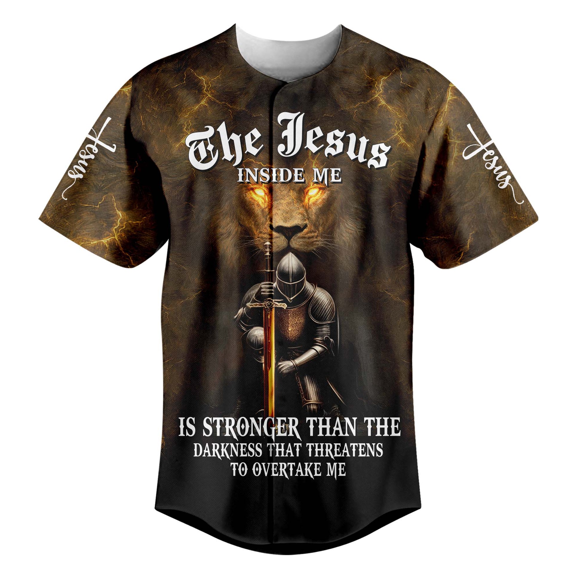Stand firm in your faith with the "The Jesus Inside Me" baseball jersey. This powerful design features a mighty knight, holding a sword, with a lion representing the strength of Jesus within us. The bold statement, "The Jesus Inside Me is Stronger Than the Darkness That Threatens to Overtake Me," serves as a reminder of the strength and power that comes from Christ living within us.