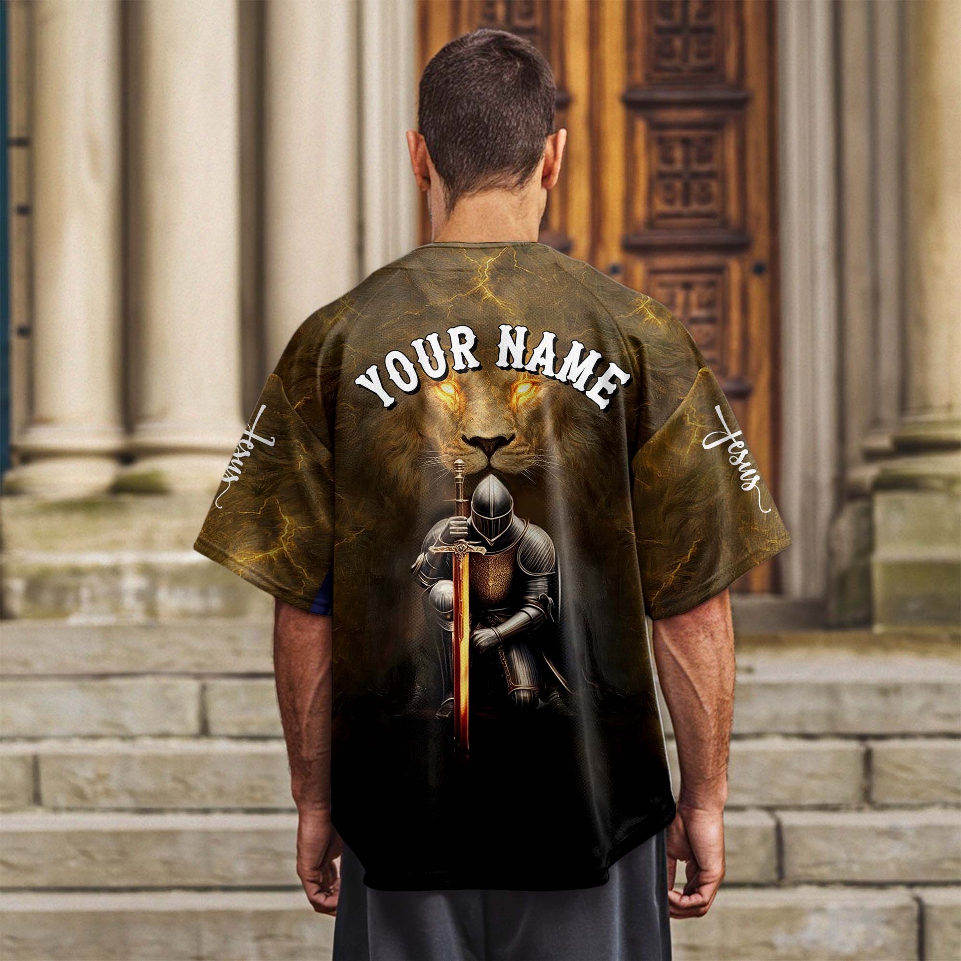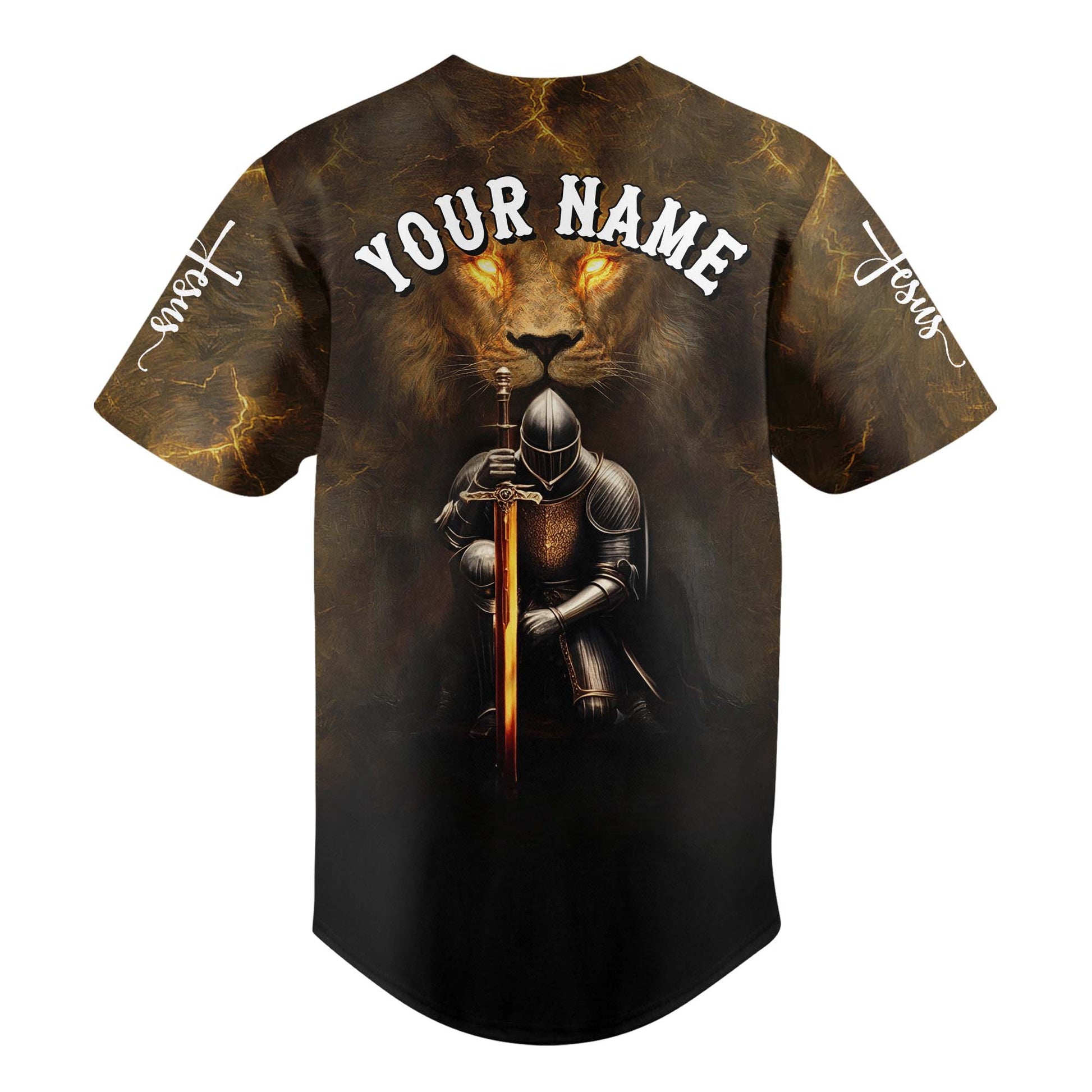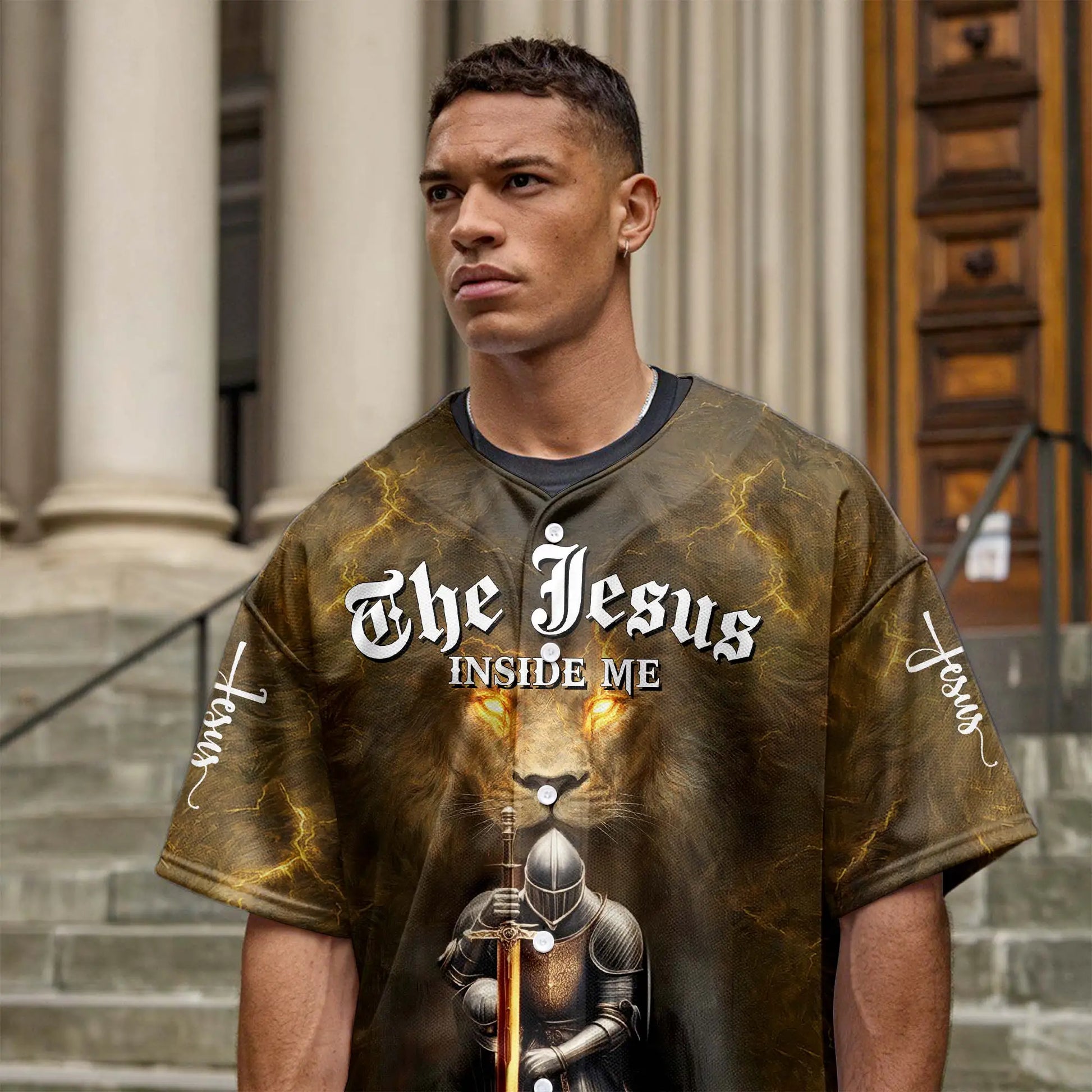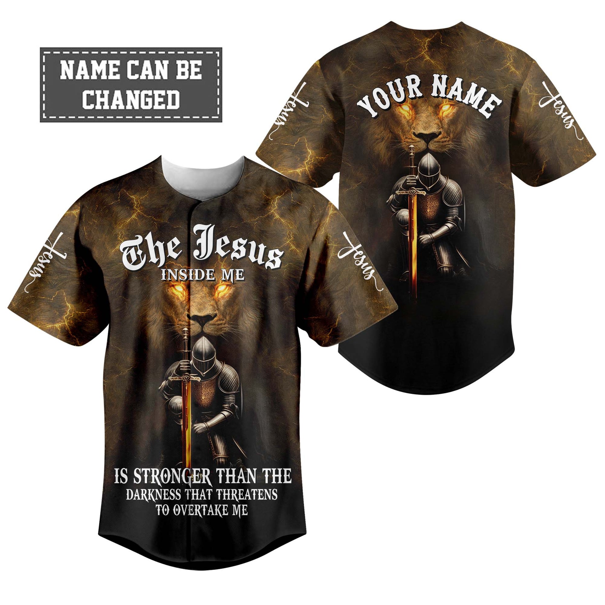 Stand firm in your faith with the "The Jesus Inside Me" baseball jersey. This powerful design features a mighty knight, holding a sword, with a lion representing the strength of Jesus within us. The bold statement, "The Jesus Inside Me is Stronger Than the Darkness That Threatens to Overtake Me," serves as a reminder of the strength and power that comes from Christ living within us.