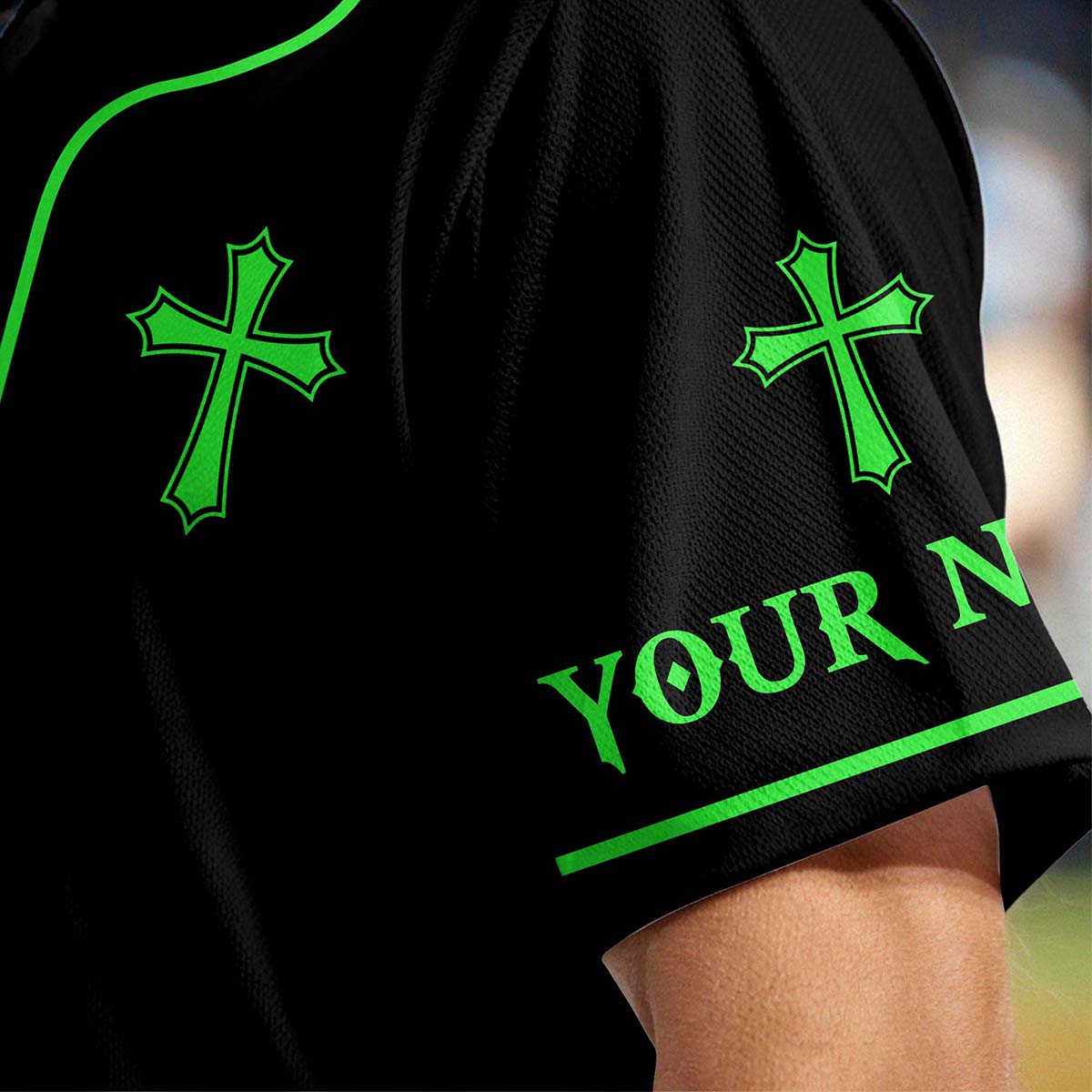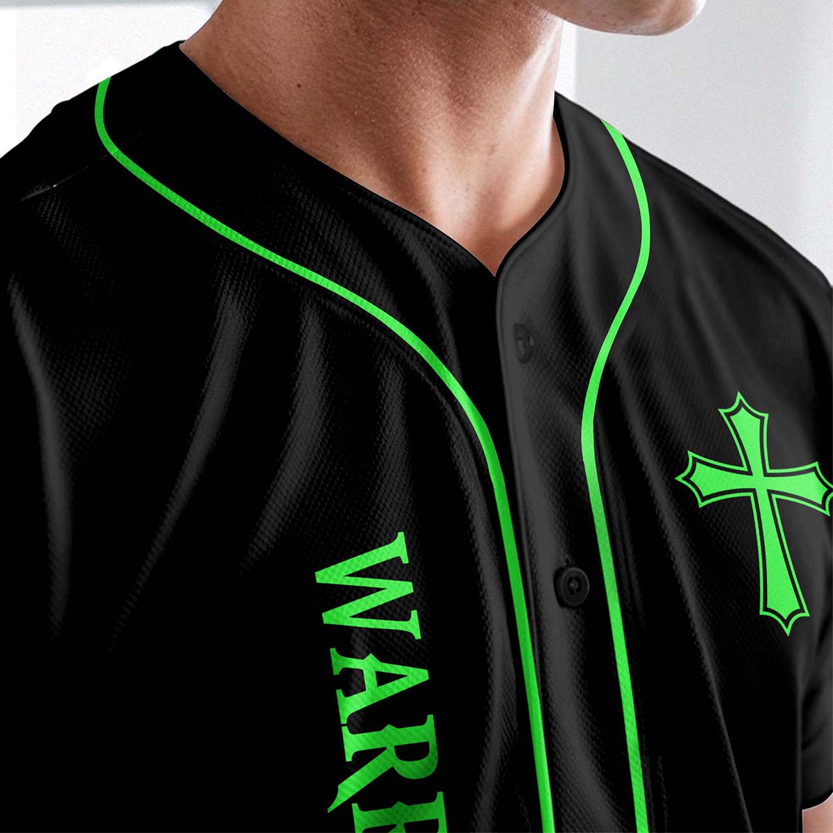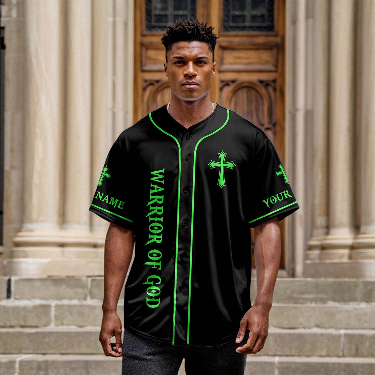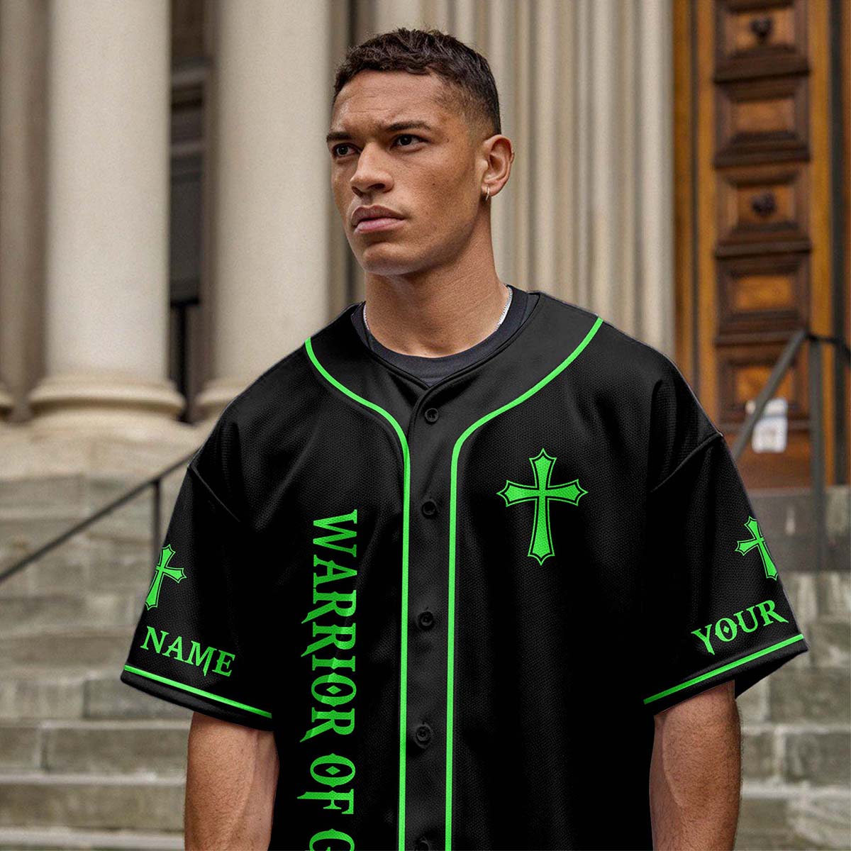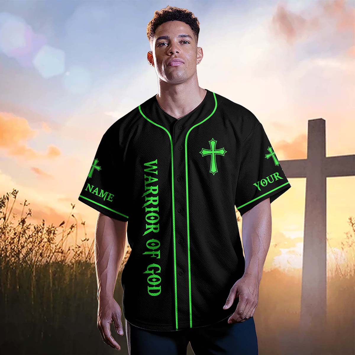 while the front displays “Warrior of God” alongside a glowing cross. Both sleeves are fully customizable with your name, turning this jersey into your personal banner of faith.
