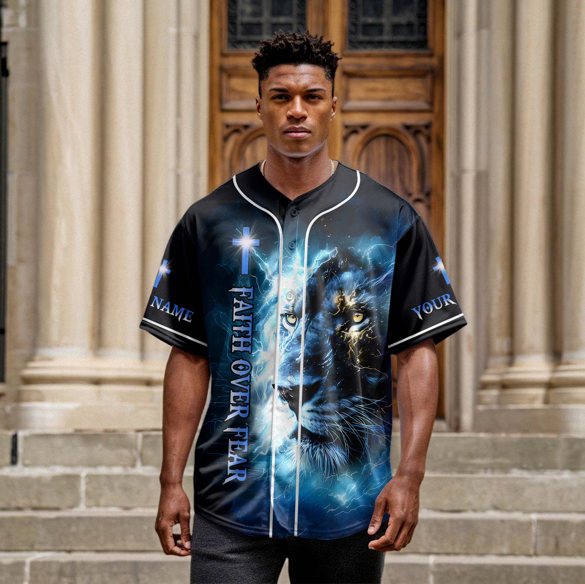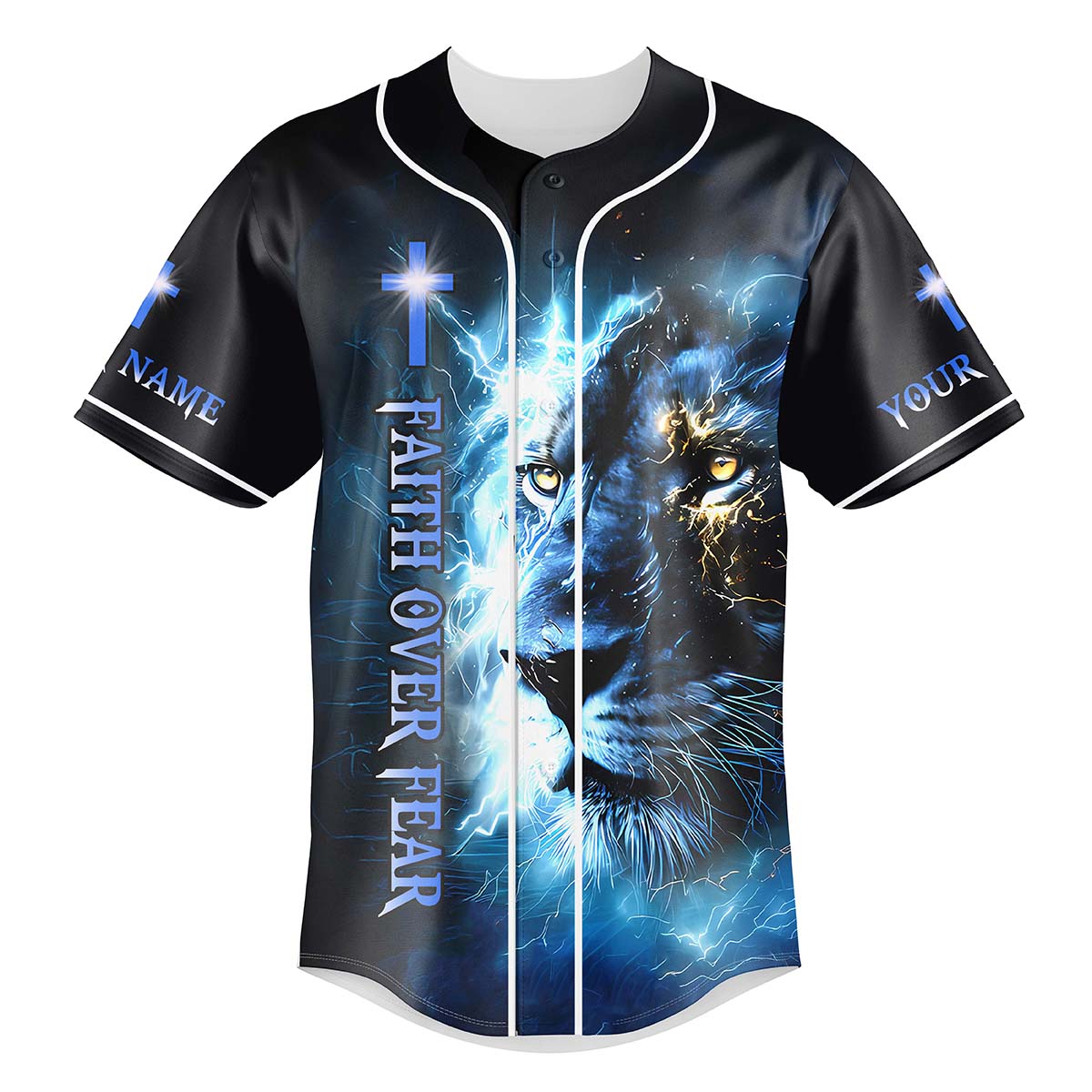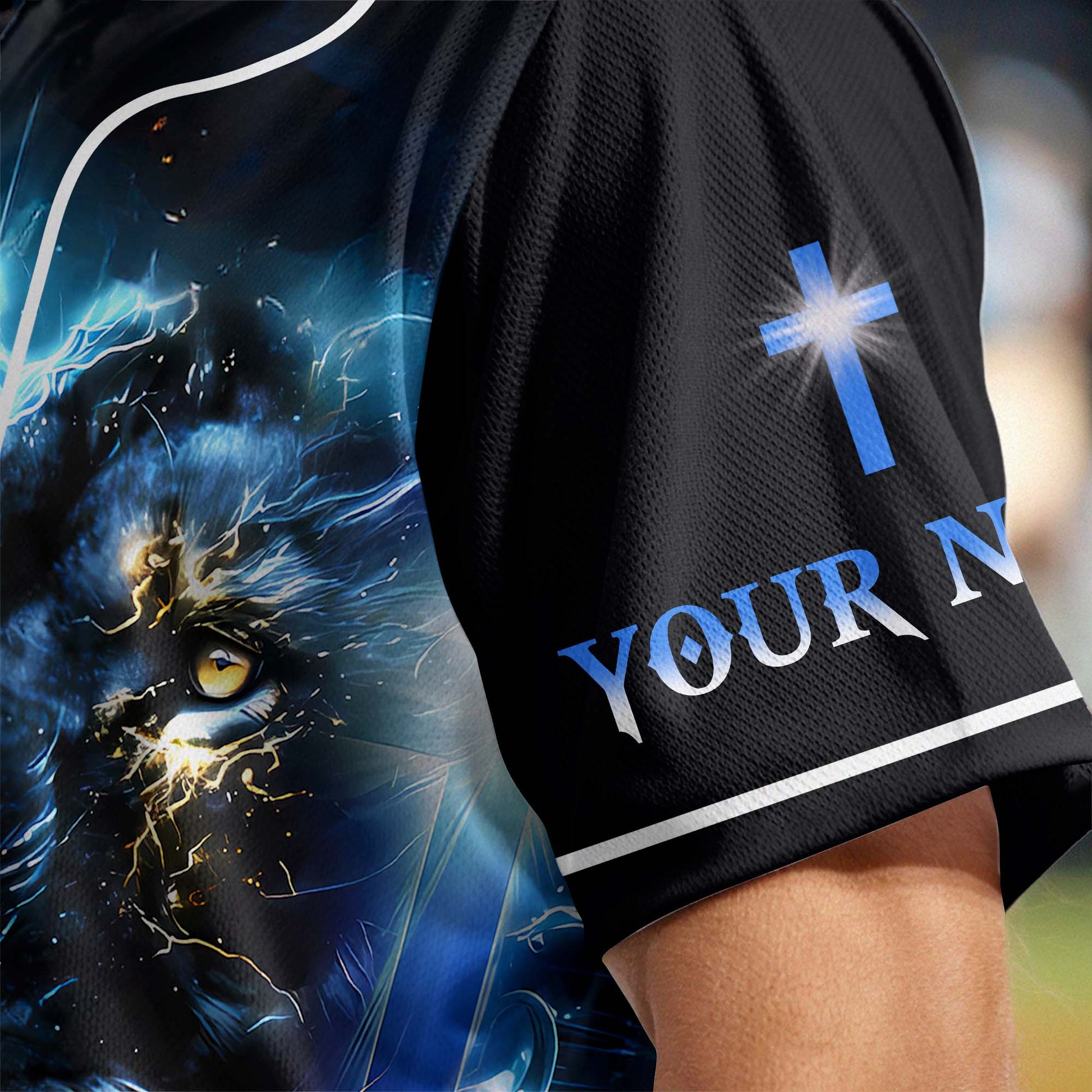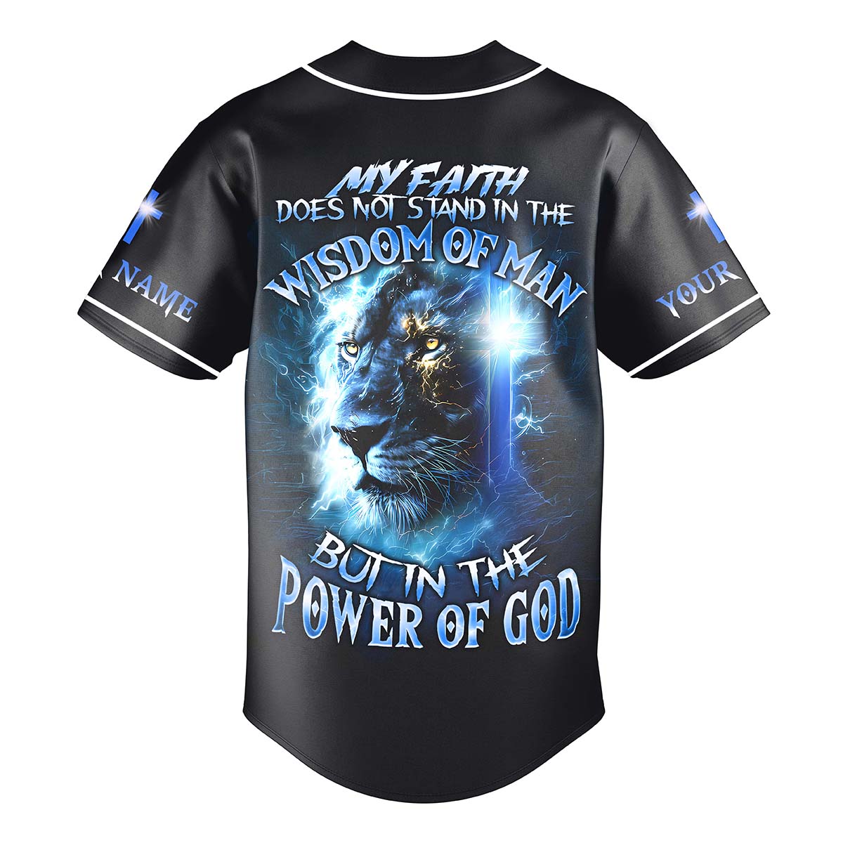 This electrifying jersey features the fierce image of a lion engulfed in lightning, symbolizing courage, spiritual strength, and God’s unmatched power. The front displays the vertical message:
