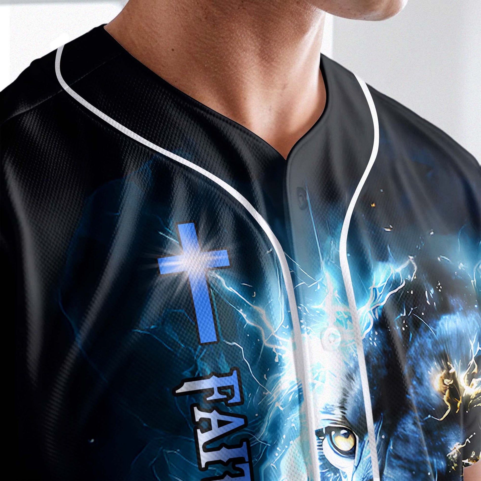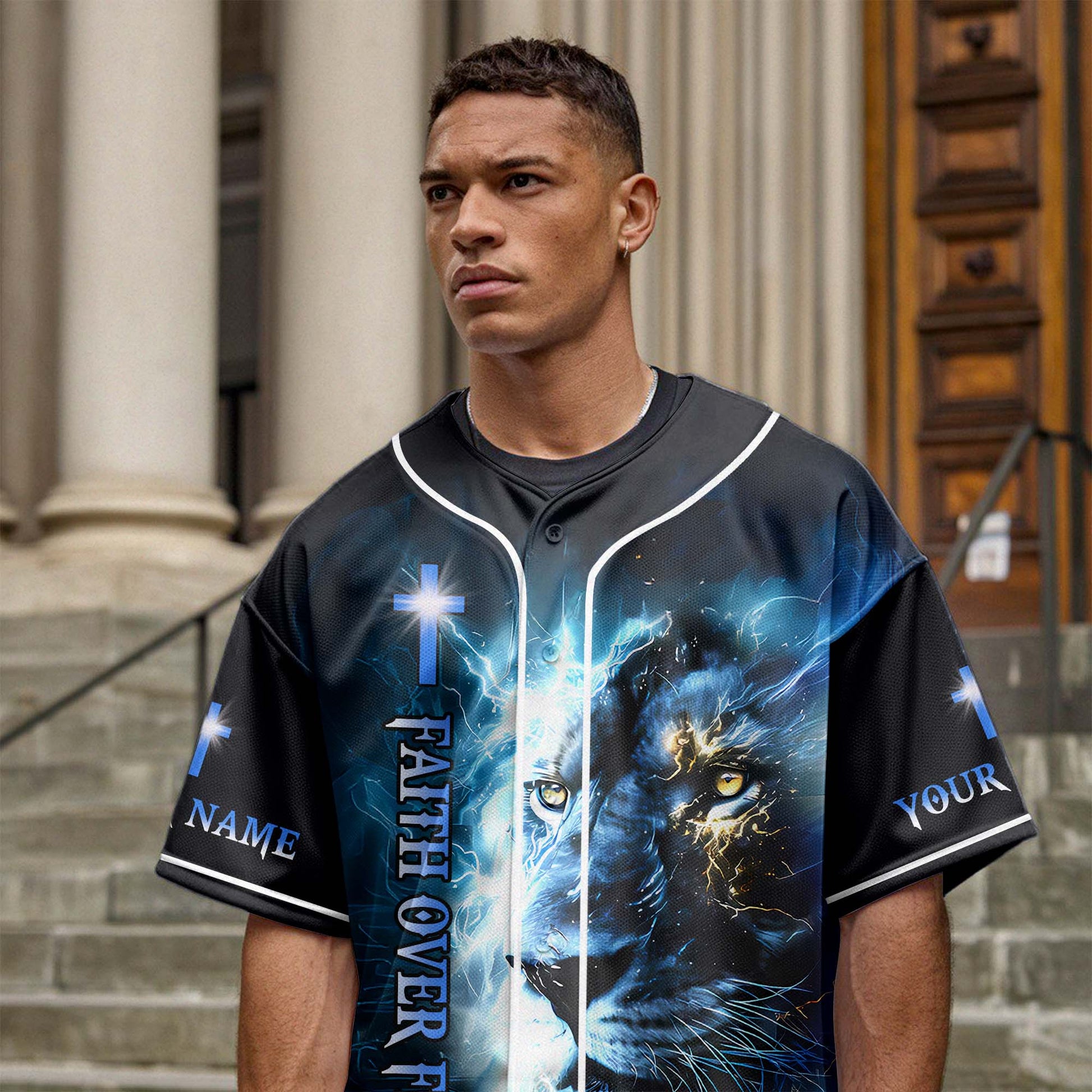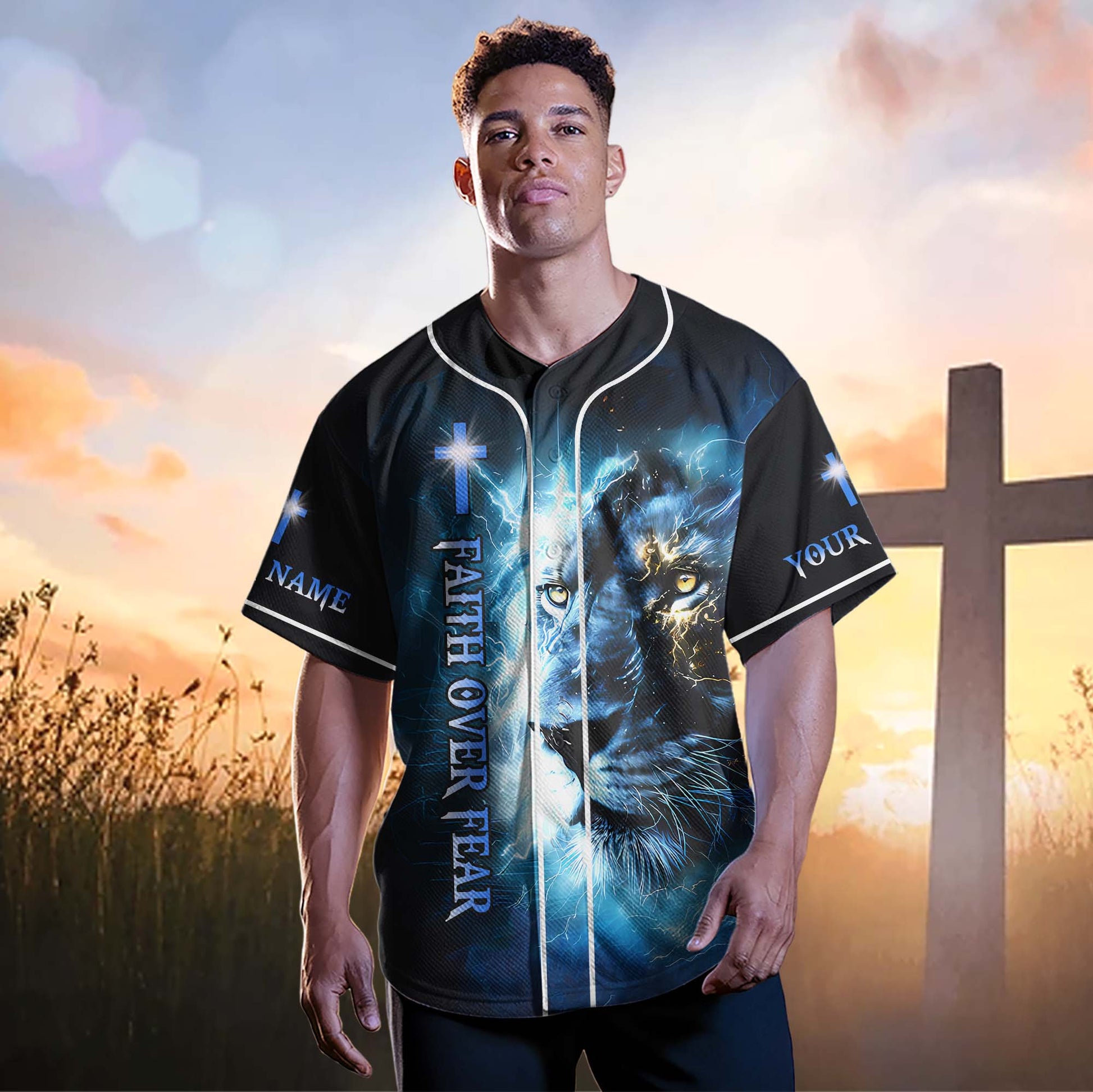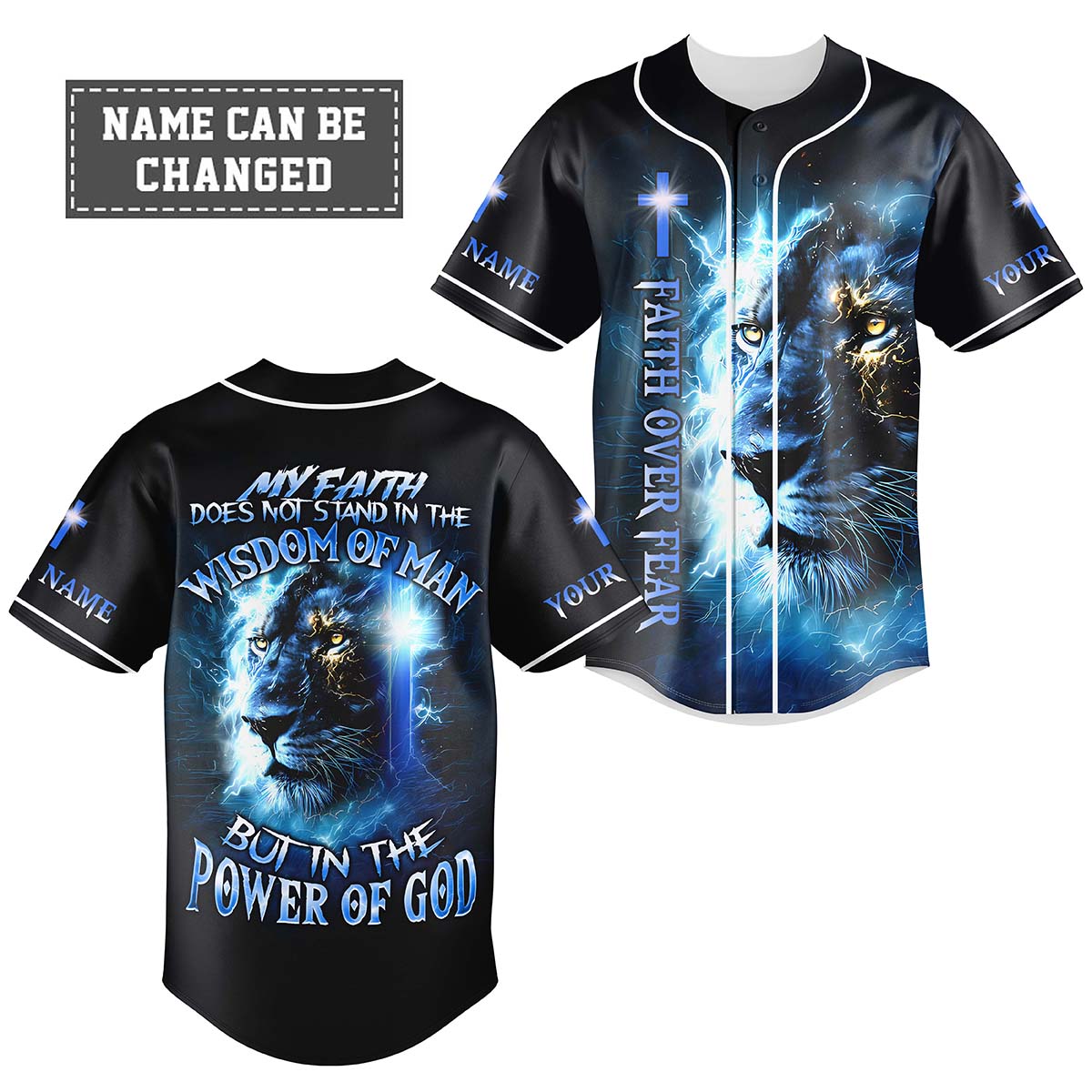 This electrifying jersey features the fierce image of a lion engulfed in lightning, symbolizing courage, spiritual strength, and God’s unmatched power. The front displays the vertical message:
