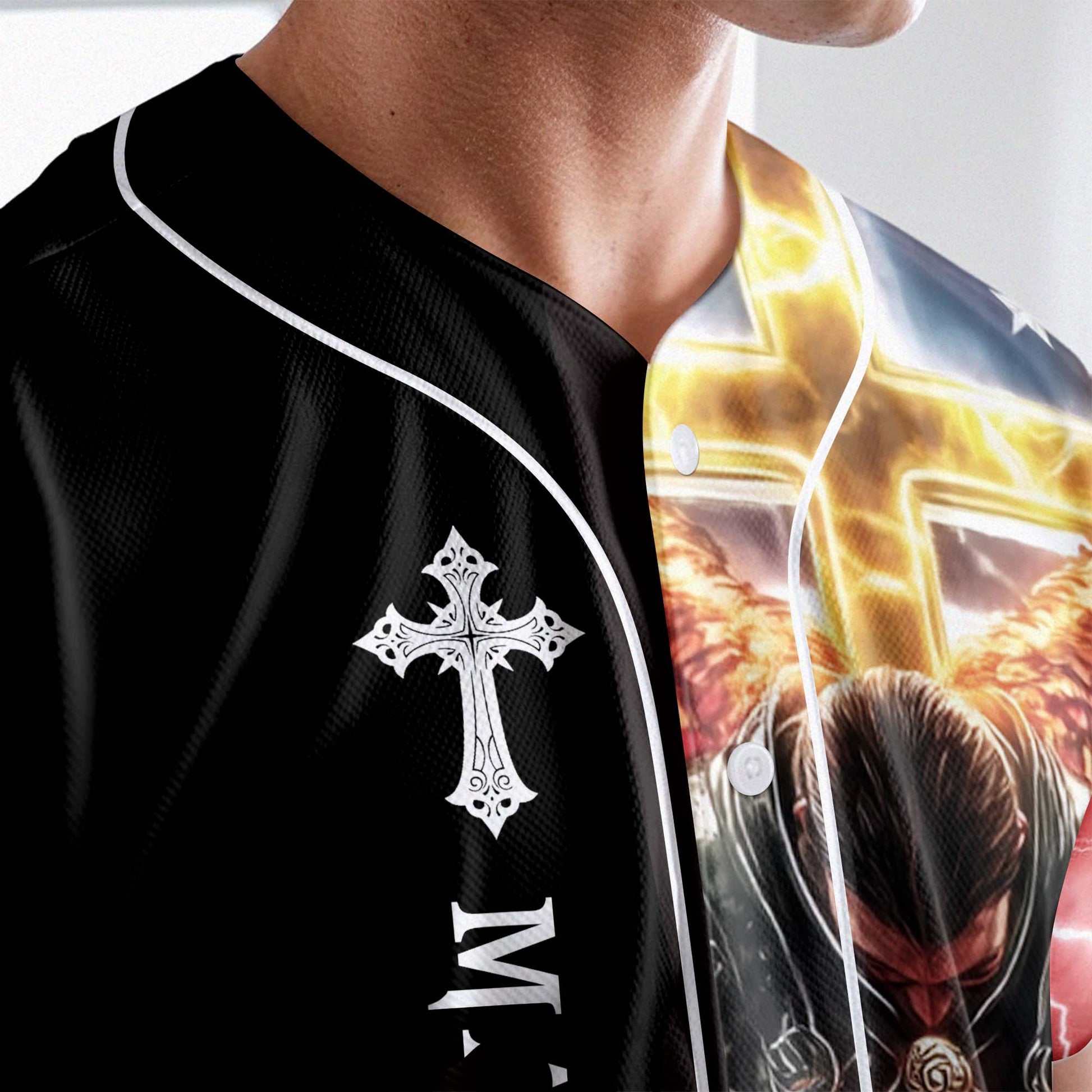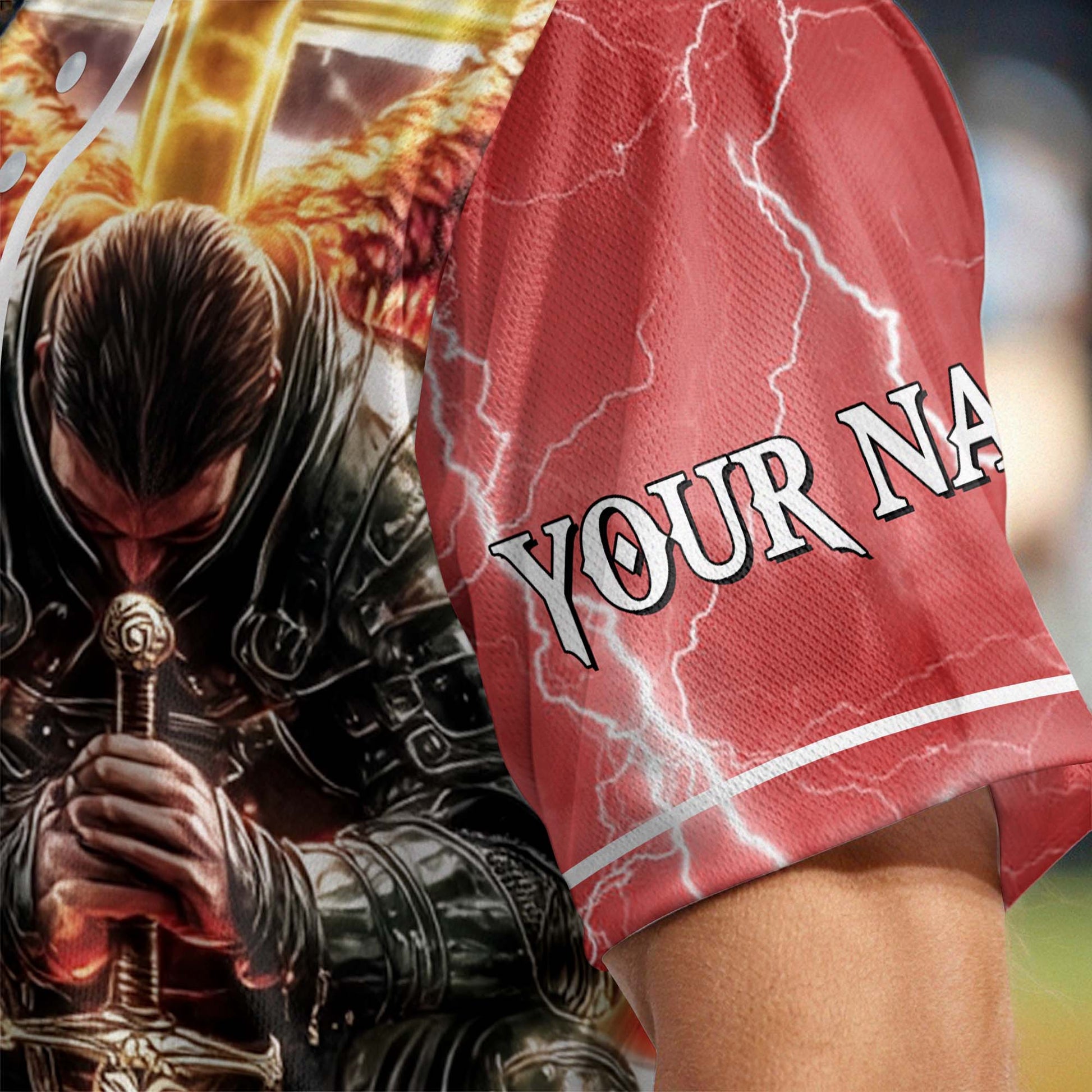This striking jersey showcases a kneeling warrior clad in armor before a fiery sword and radiant cross, surrounded by angel wings and the American flag — symbolizing spiritual strength, sacrifice, and honor. The back features the powerful declaration: